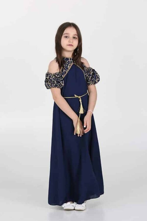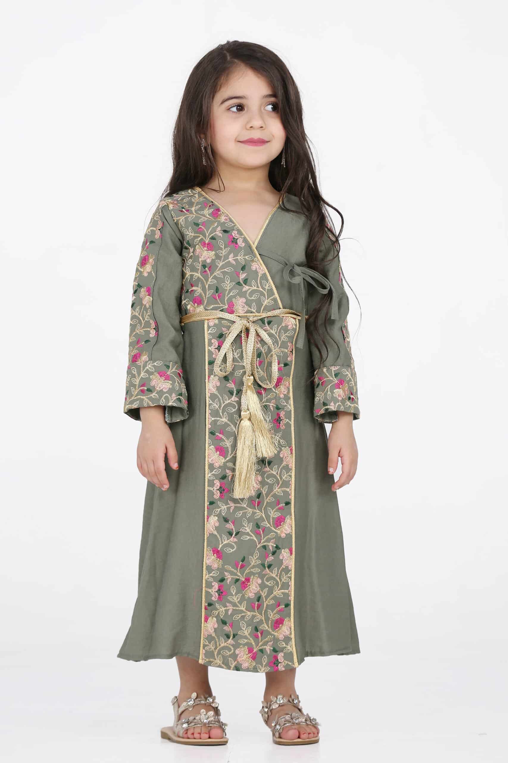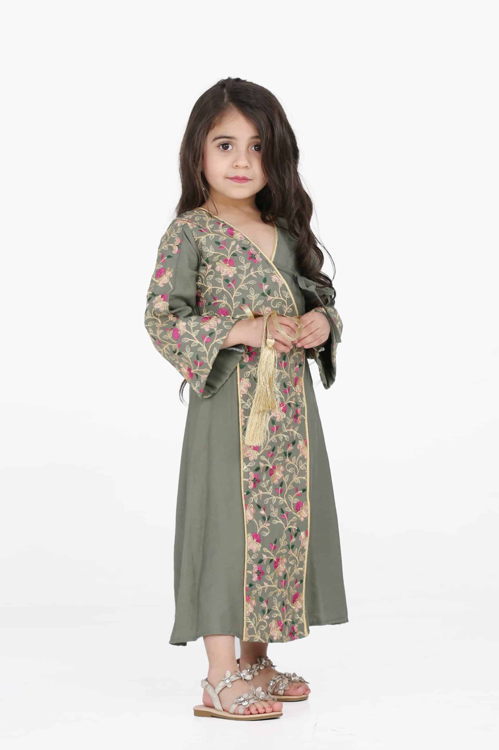 جلابية رمضان بناتي بحريني مشجر فخمة للمناسبات ولجمعات رمضان فاخرة جداً لصاحبات الذوق الرفيع ، جلابية مناسبات ، القطعة الخارجية قطن شالكي مع حزام منفصل يتمدد بسهولة وتطريز عسيري خيط قصب لامع وبتصميم فضفاض ومريح يتيح الحركة السهلة للطفلة. تتميز بأكمام طويلة وقصة طويلة تغطي الجسم بشكل كامل، مما يعطي شعورًا بالراحة