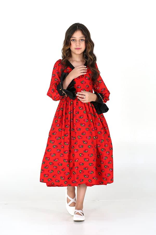 التصميم : يتميز هذا الفستان بتصميم أنيق وجميل. يتميز بقصة ملائمة ومحافظة تناسب الأطفال وتضفي لمسة من الأنوثة. يأتي الفستان بأكمام قصيرة وقصة مريحة تسمح بحرية الحركة.