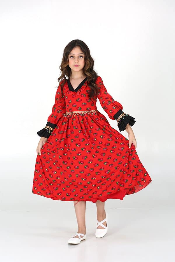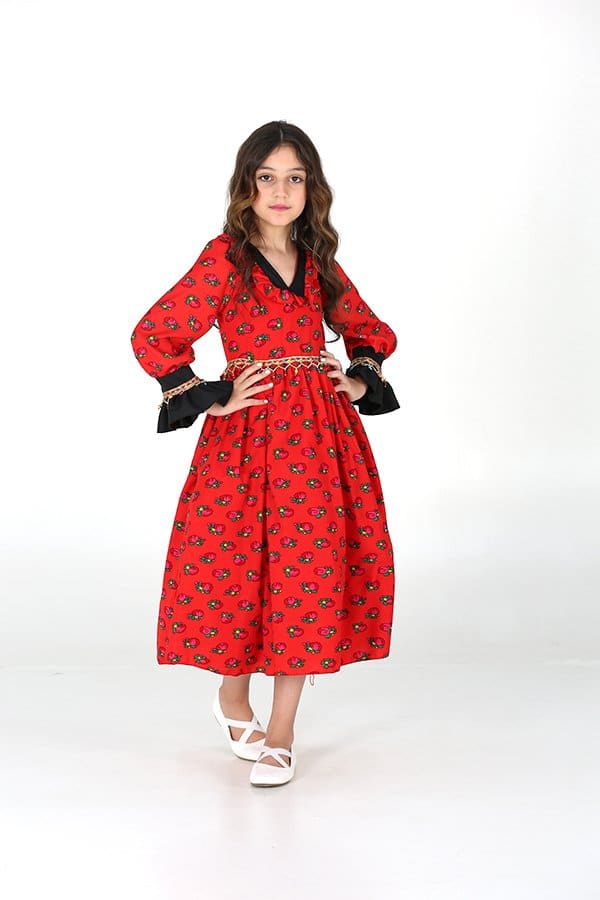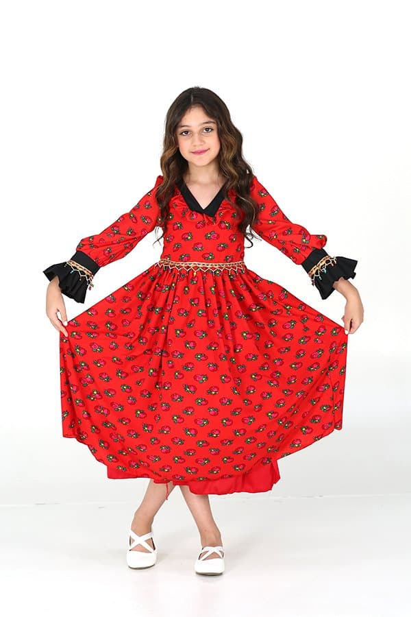 الفستان مشجر بتصميمات جذابة وألوان زاهية، مما يضيف لمسة من الحيوية والسعادة لكل خطوة. النقوش المشرقة تمنح الفستان طابعًا نابضًا بالحياة ويجعلها خيارًا مثاليًا للطفلة التي ترغب في التألق بألوان مبهجة. كما أن الشريط المصنوع من الخرز في الخصر يضيف لمسة من الأناقة الفائقة والتميز، ليبرز جمال القوام ويمنح الجلابية لمسة فاخرة.