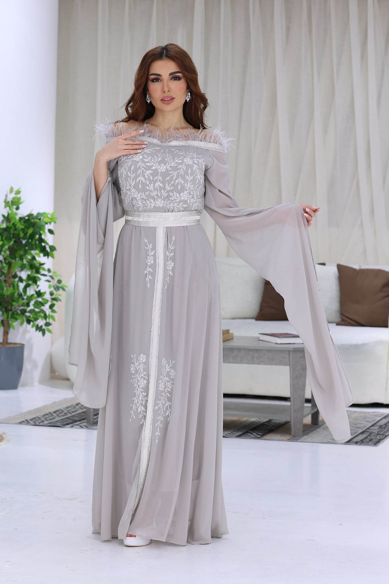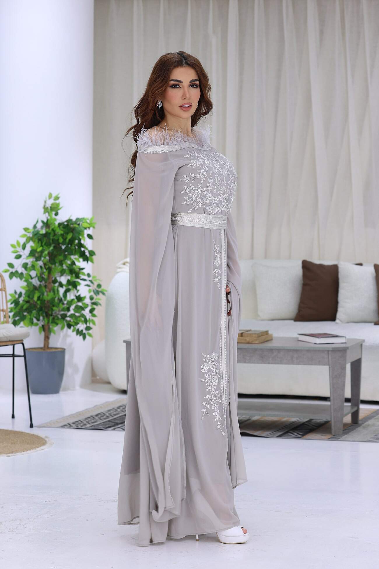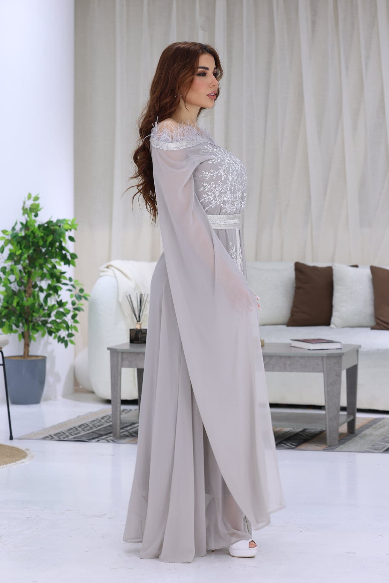 جلابية مغربي مزينة بريش بأكمام طويله مفتوحه من خامة الشيفون بتطريز انيق على الصدر بتطريز مشجر على الصدر بخط ريش ناعم في اعلا الفستان بحزام فضي انيق مما يجعلها قطعة فريدة ومميزة للإطلالات الراقية والمناسبات الخاصة. تضفي الجلابية جمالًا وأناقةً على الإطلالة وتجعلك تبرزين بأناقة في أي مناسبة ترتدينها.