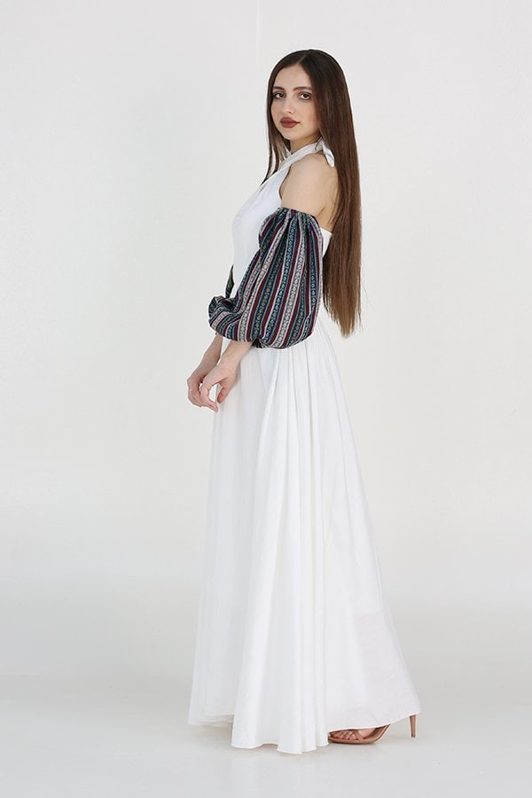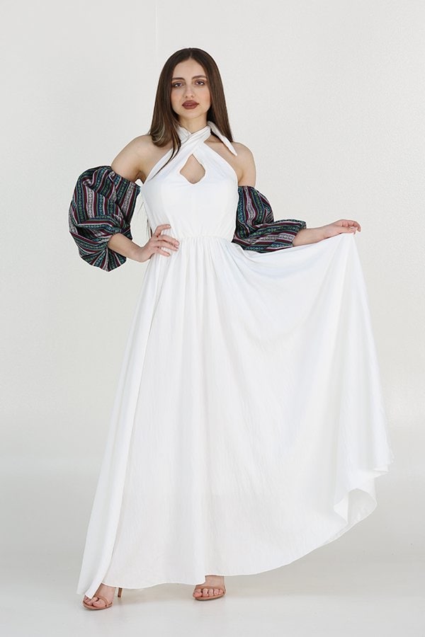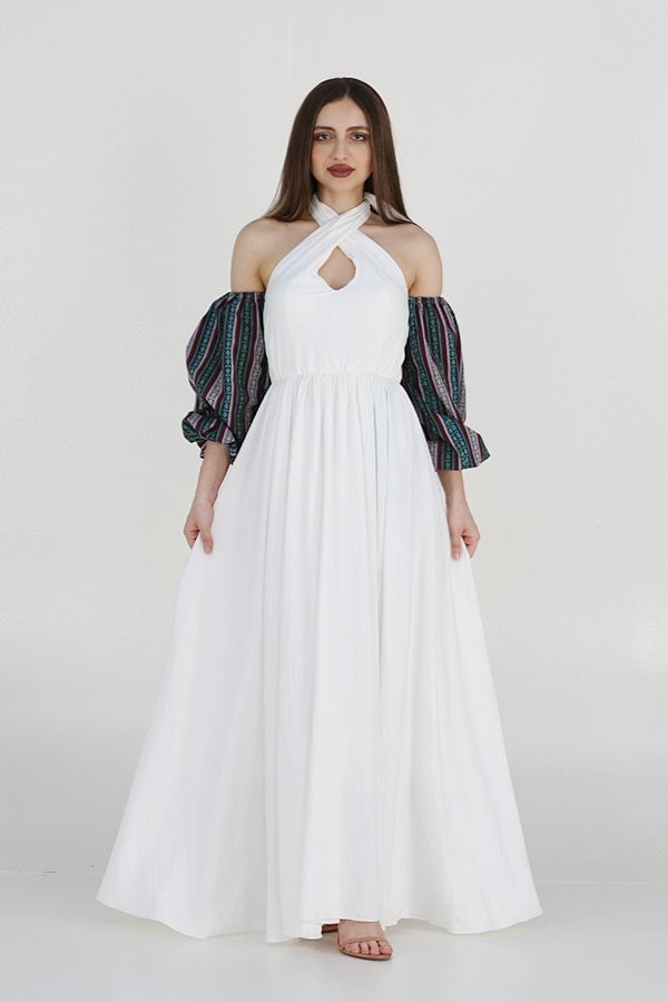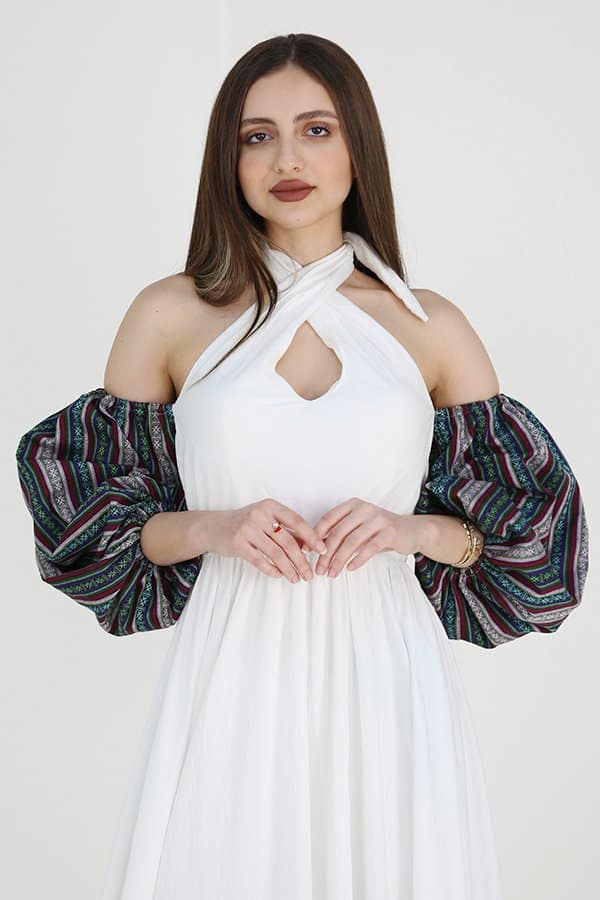 جلابية إماراتية نسائي بأكمام أكتاف مكشوفة هي قطعة فاخرة تجمع بين الأناقة العصرية والتراث الثقافي الهندي بطريقة مميزة. الأكمام المشجرة تضفي لمسة فنية رائعة على التصميم، بينما الخصر المزموم يبرز القوام بشكل أنثوي وجذاب. هذه الجلابية تتميز بتفاصيل دقيقة وأنيقة، تجعل منها الخيار المثالي لإطلالة فاخرة في المناسبات الخاصة والأحداث الاجتماعية.