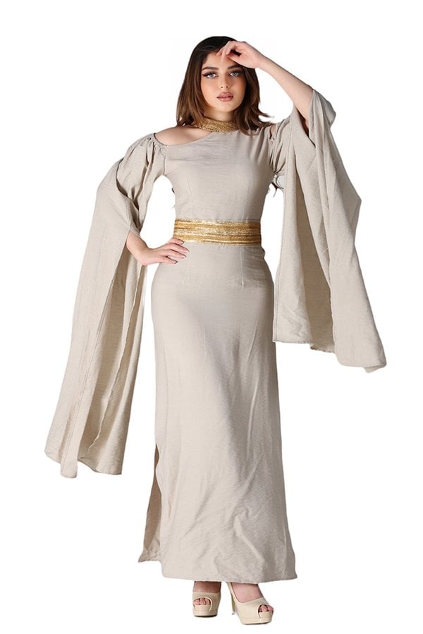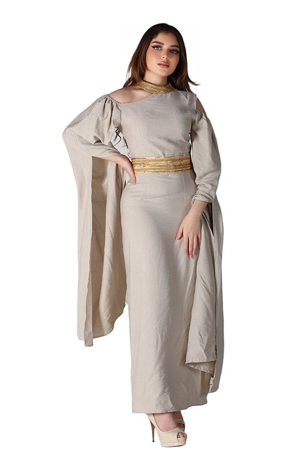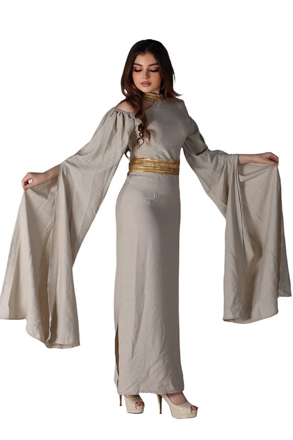 جلابية رمضانية فخمة بأكمام مفتوحة وحزام مطعم بخيط قصب ذهبي وياقة ذهبية هي قطعة فاخرة تجمع بين الأصالة والحداثة في تصميم واحد. الأكمام الواسعة المفتوحة تضيف لمسة من الحرية والأناقة، بينما الحزام الذهبي الذي يزين الخصر يعزز من جمال القوام ويضفي لمسة من الفخامة. ياقة الفستان الذهبية تكمل التصميم الراقي وتعكس ذوقًا رفيعًا، مما يجعل هذه الجلابية خيارًا مثاليًا للمناسبات الرمضانية والمناسبات الخاصة التي تتطلب إطلالة متميزة.