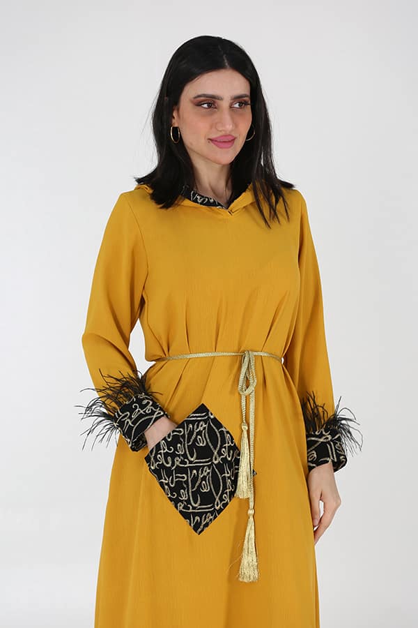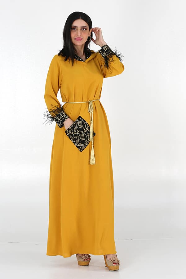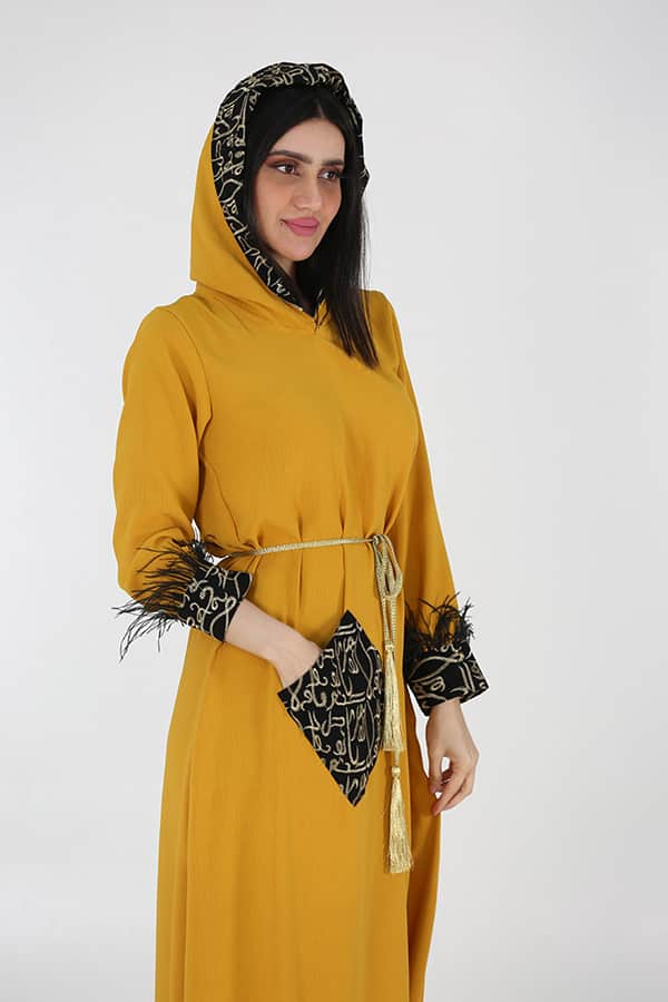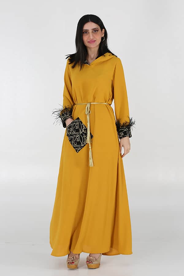 جلابية نسائي مغربية اكمام طويلة بتطريز حروف ذهبية وريش بالأكمام والقبعة والجيب وحزام أنيق ذهبي تتوفر الجلابية باللون السكري واللون الاصفر
