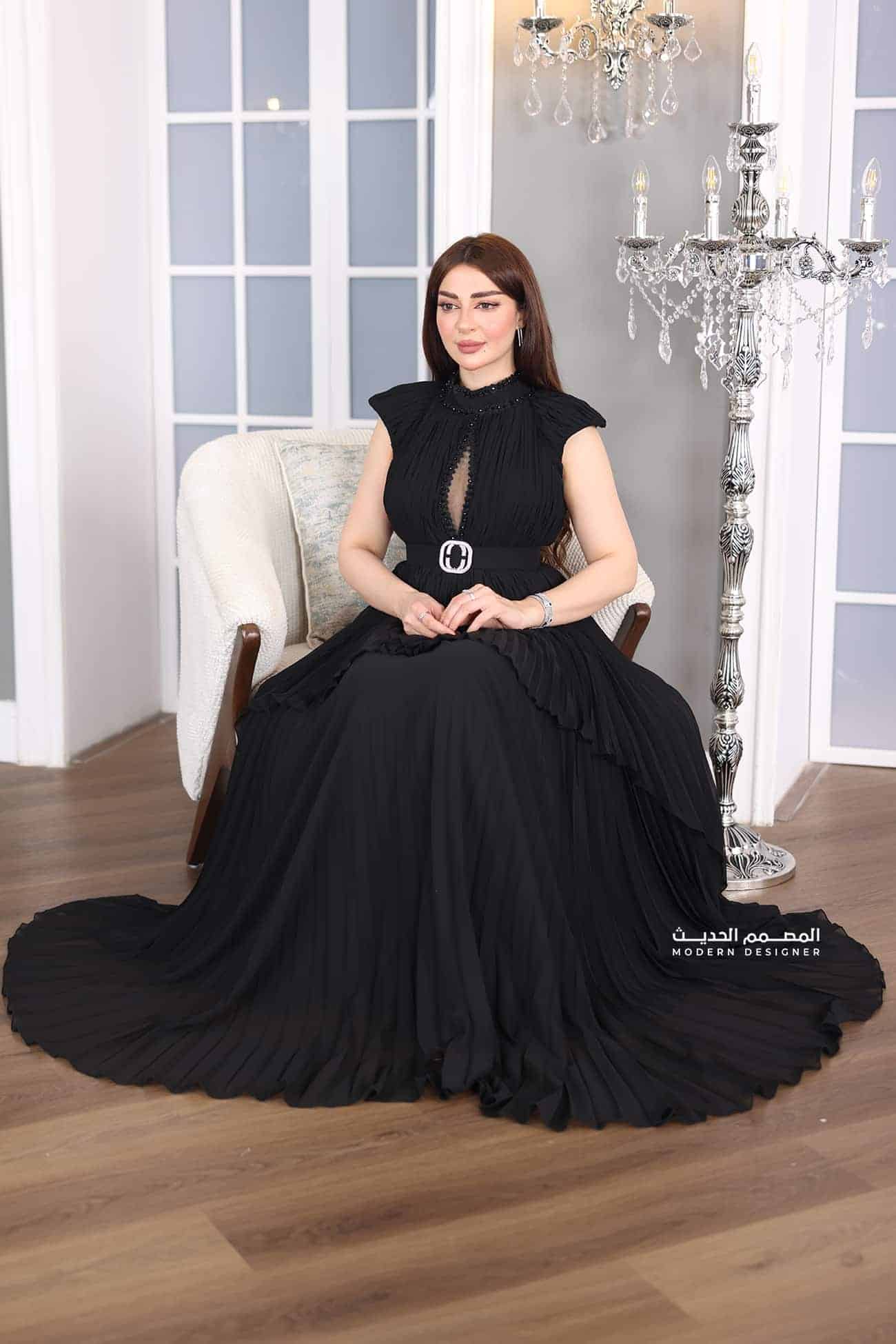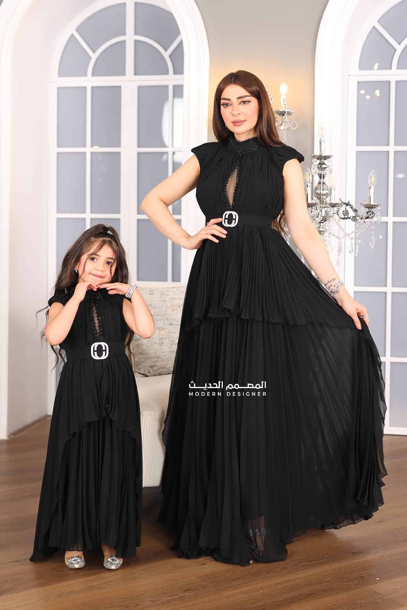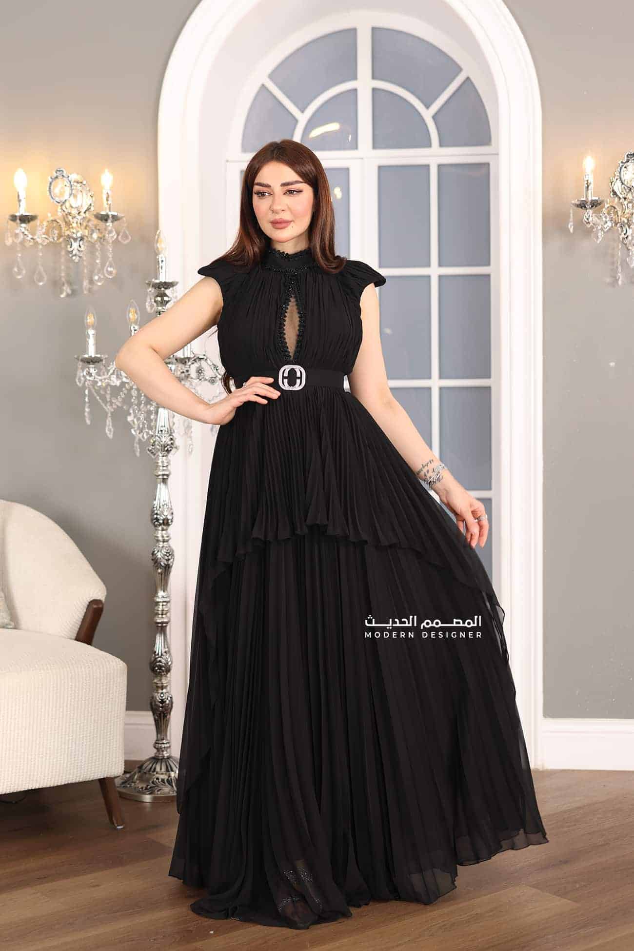 فستان اسود بتصميم فاخر بوليسيه بتصميم كات فاخر بفتحة على الصدر بحزام انيق خيار مثالي للمناسبات الخاصة والسهرات الرسمية. سيبرز الفستان جمالك وأناقتك، ويمنحك إطلالة ساحرة ومميزة.