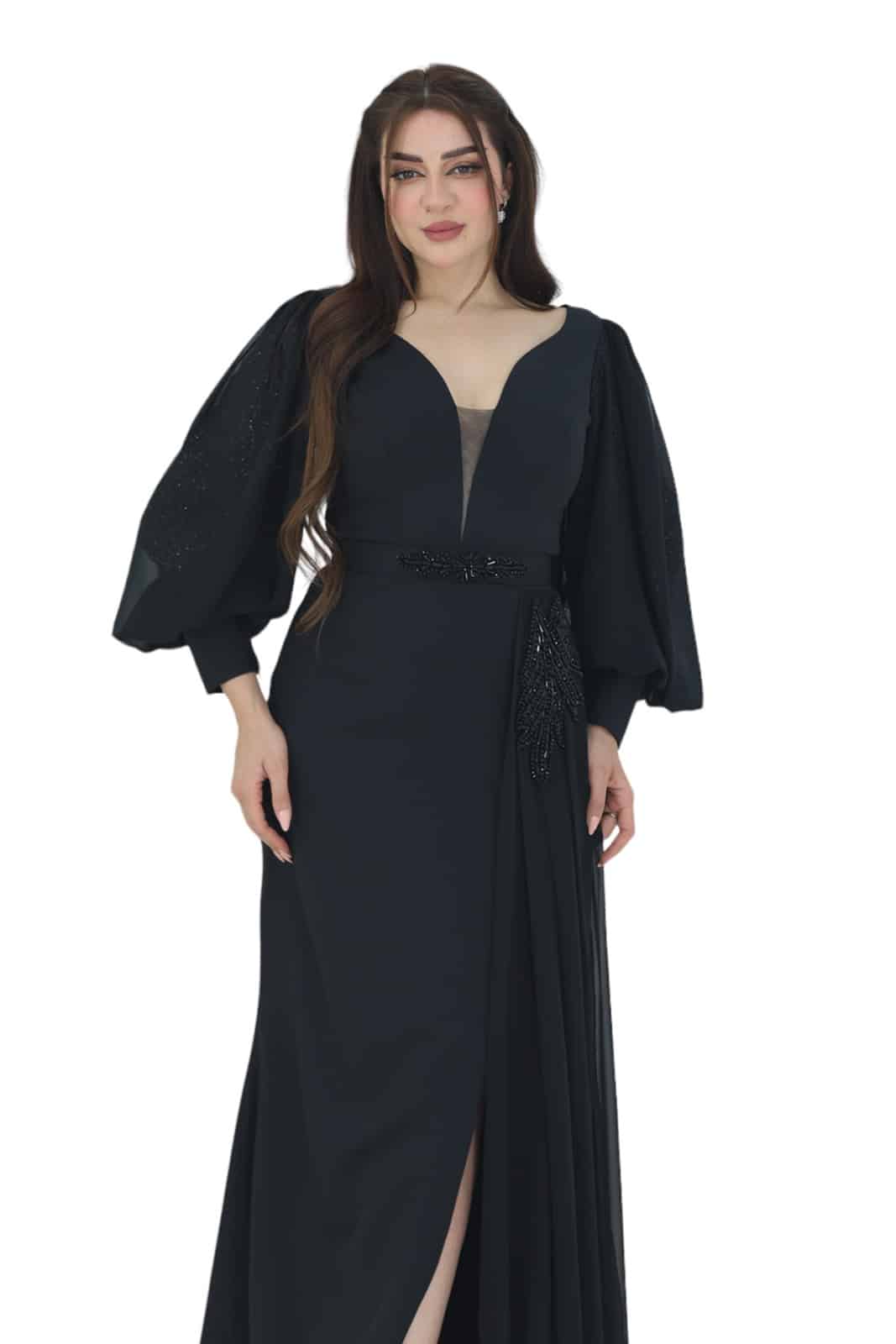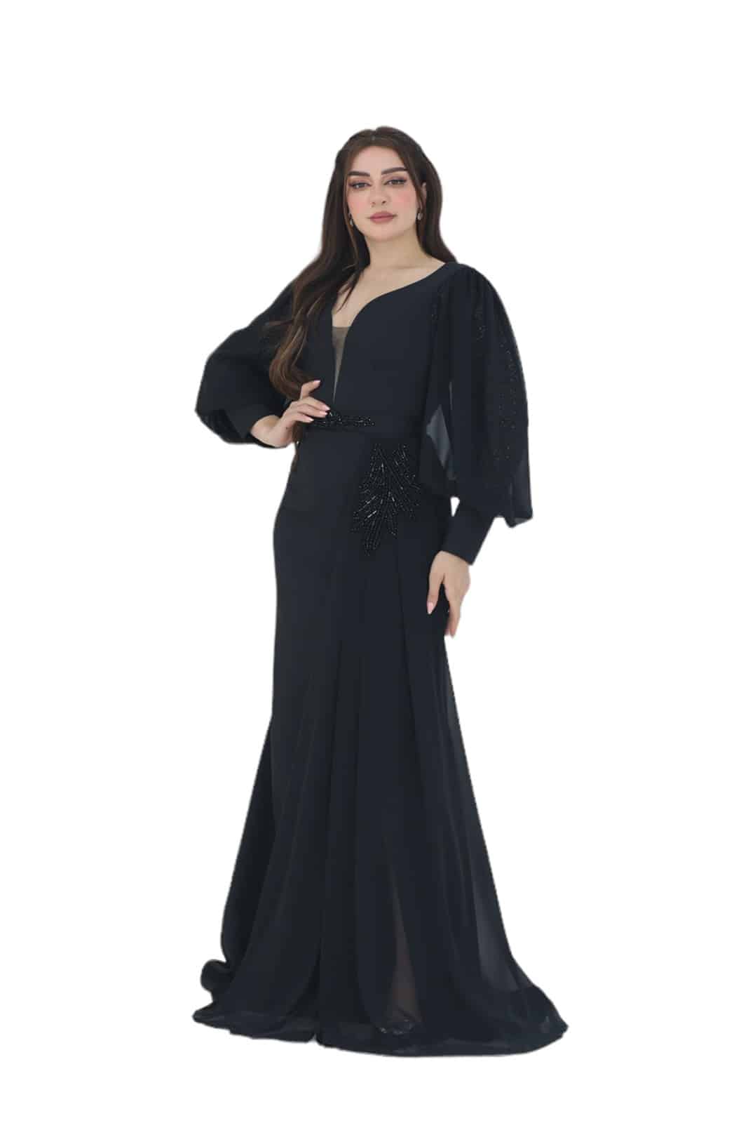 فستان اسود فاخر للمناسبات بتصميم راقي وبأكمام شفافة وشال جانبي بتطريز فخم ويجمع الفستان بين الأناقة الكلاسيكية والجاذبية العصرية و الفستان مصنوع من خامة الكريب الفاخرة، وهو باللون الأسود الأنيق الذي يليق بجميع المناسبات.