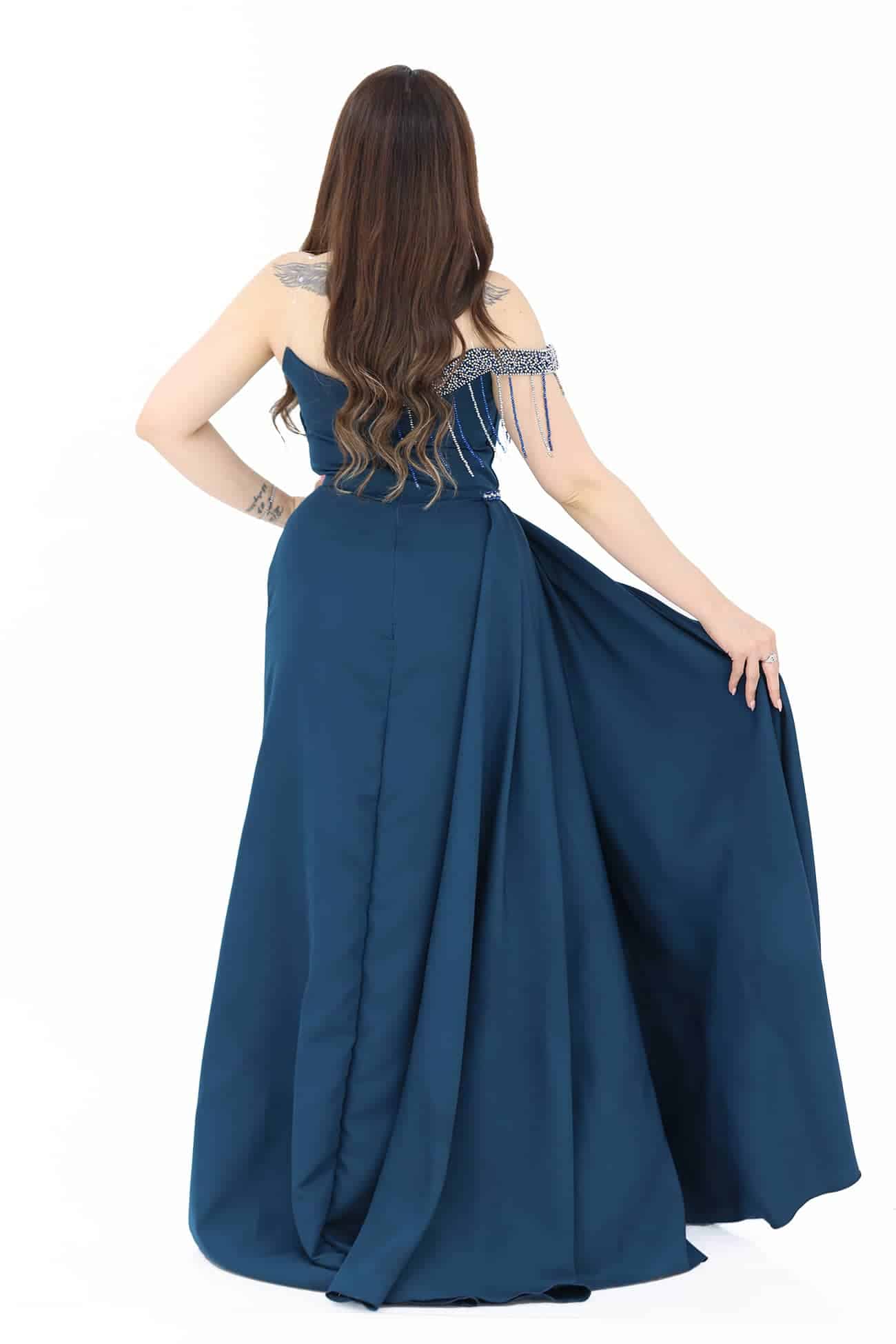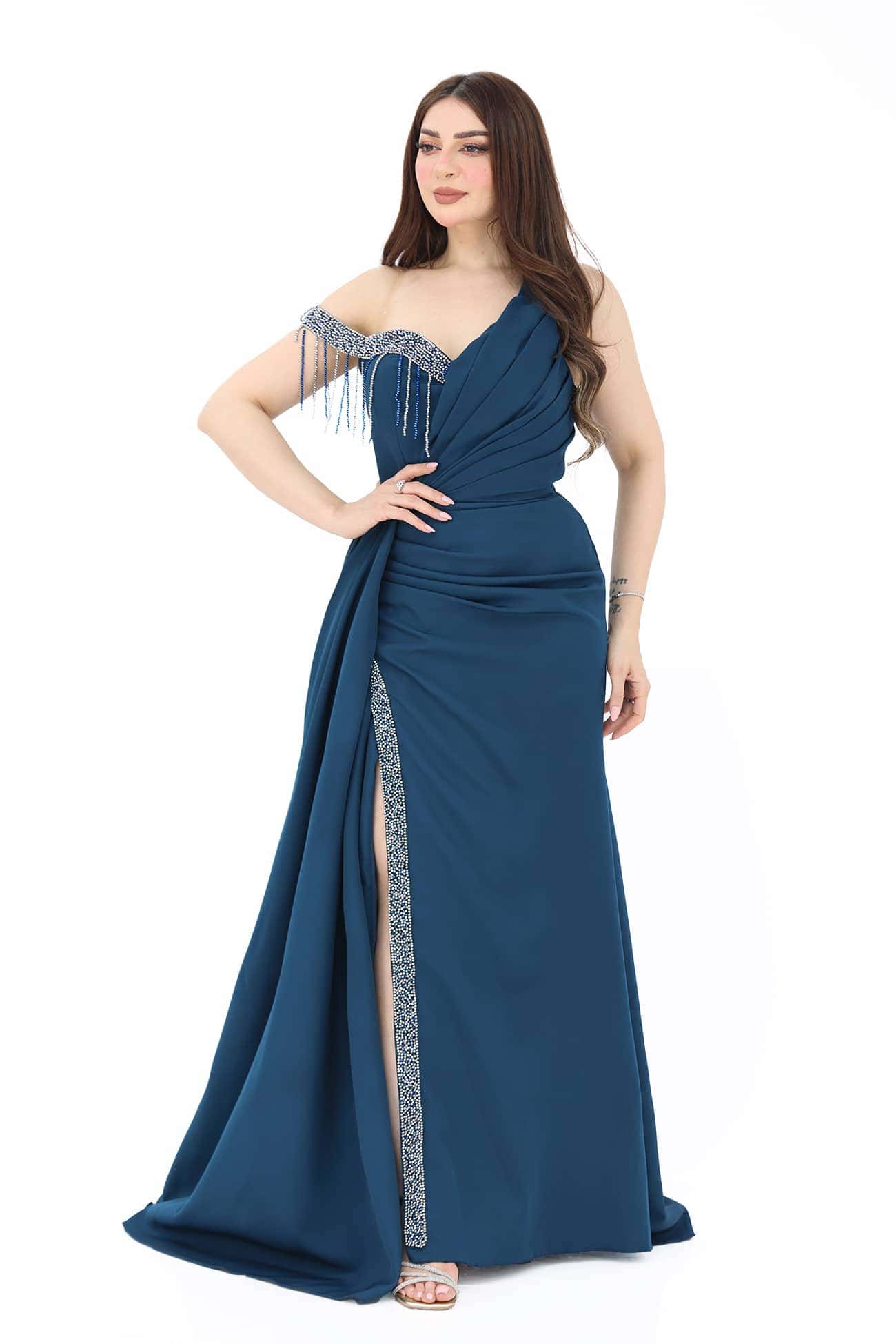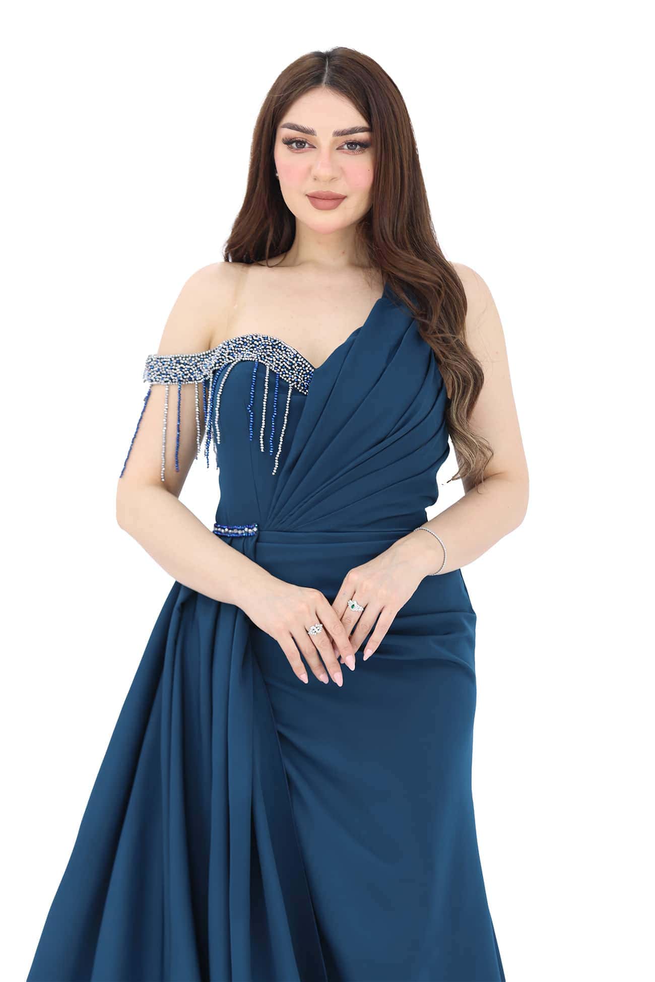 فستان سهرة بتصميم فرنسي بشال جاني طويل من نفس الفستان بكتف واحد وكتف عليه تطريز مع سلاسل انيق لتزين الفستان من خامة الكريب الباربي يتميز الفستان باللون التركوازي قطعة فاخرة وجذابة. يتميز بتفاصيل التطريز الجميلة والكتف المكشوف، مما يعطيه مظهرًا مميزًا ومثيرًا. إن الكريب الباربي الناعم واللون البترولي الجميل يجعلان الفستان يبدو أنيقًا وفاخرًا. ستشعرين بالثقة والأناقة عند ارتداء هذا الفستان الراقي، وسيكون خيارًا مثاليًا للمناسبات الخاصة والسهرات الرسمية.