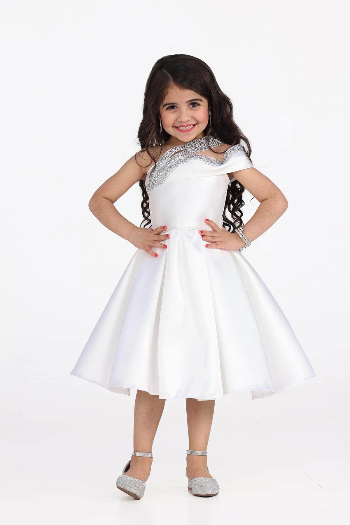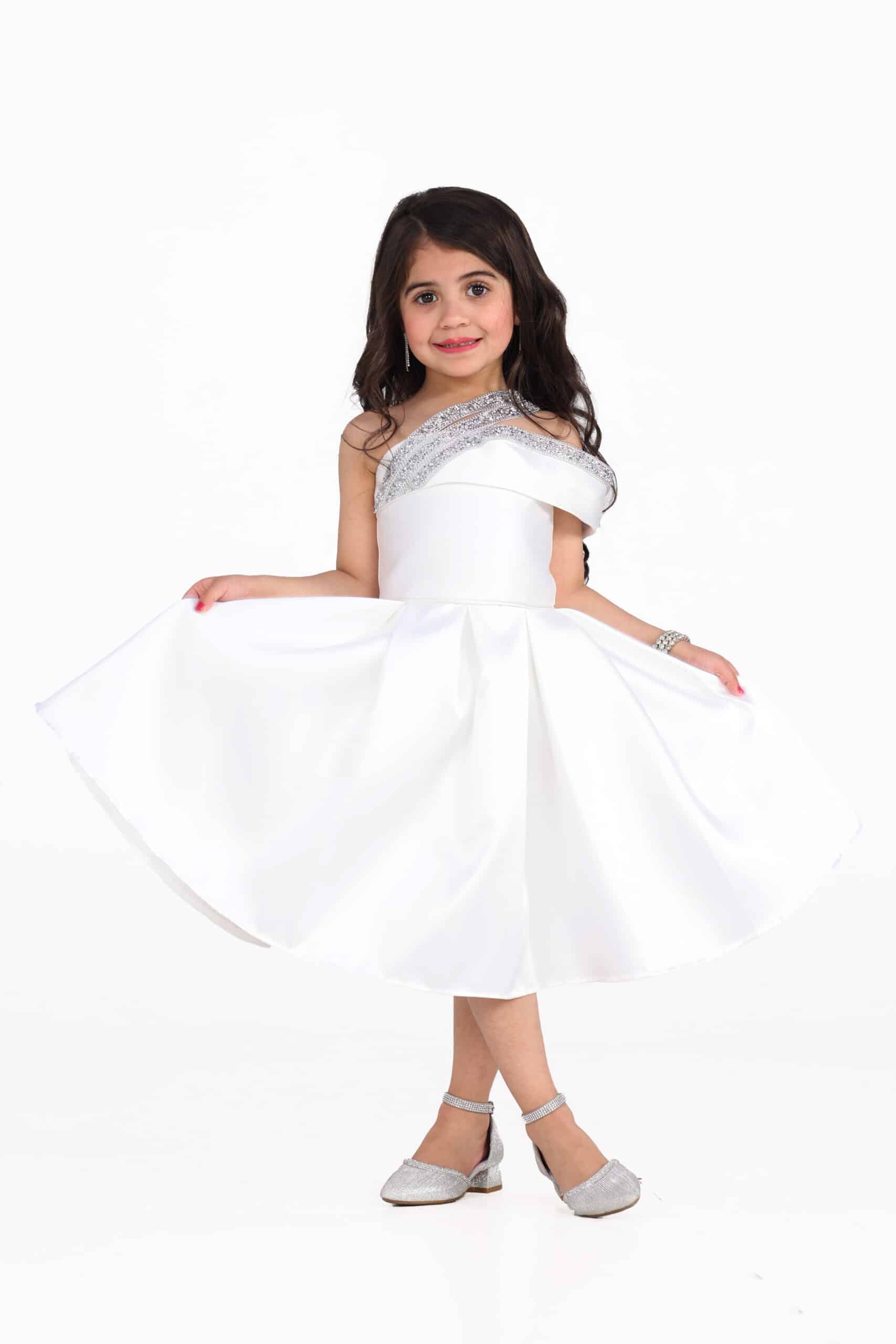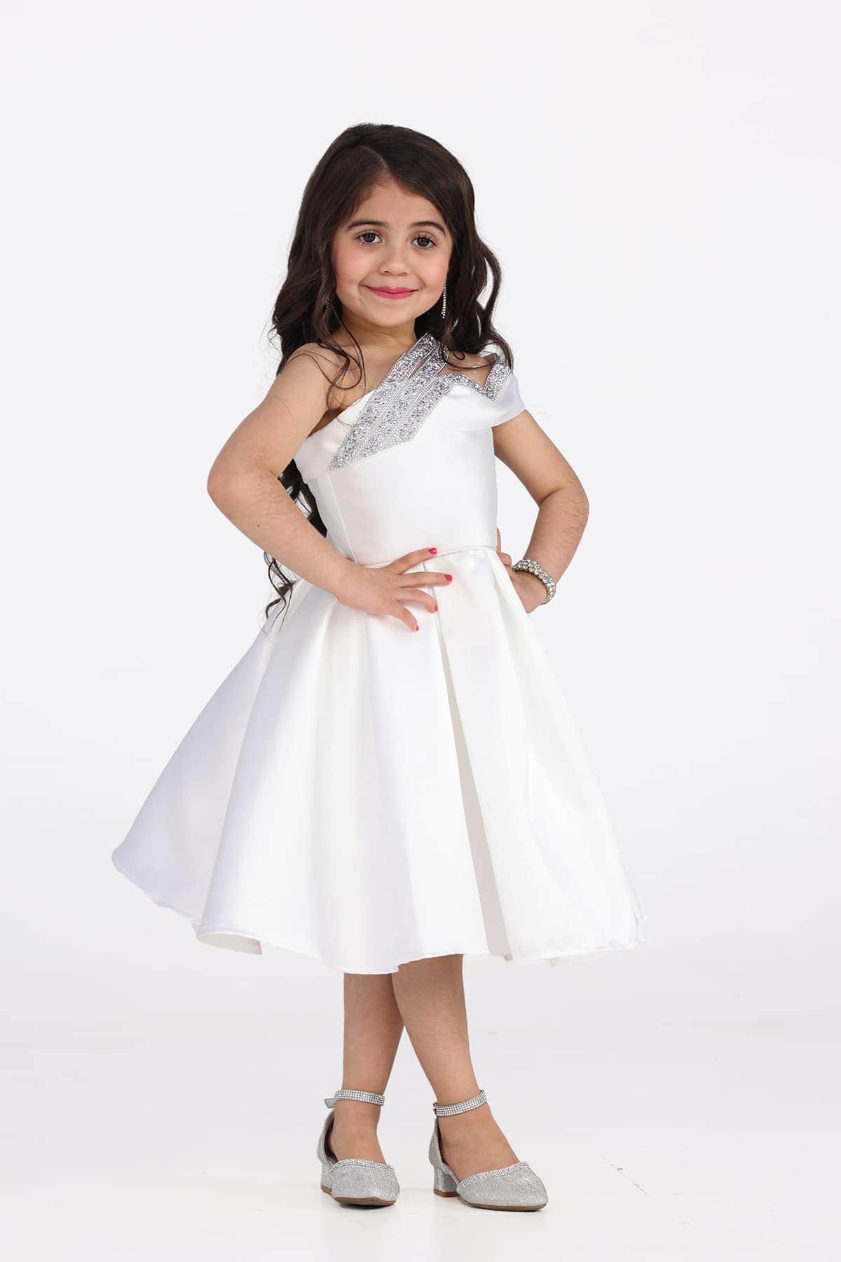 فستان بناتي أبيض بشرائط كرستال مطرز بشرائح كرستال في الأعلى صمم هذا الفستان على ايادي خبراء في التصميم لسنوات صمم ليناسب إطلالتك واناقة طفلتك .