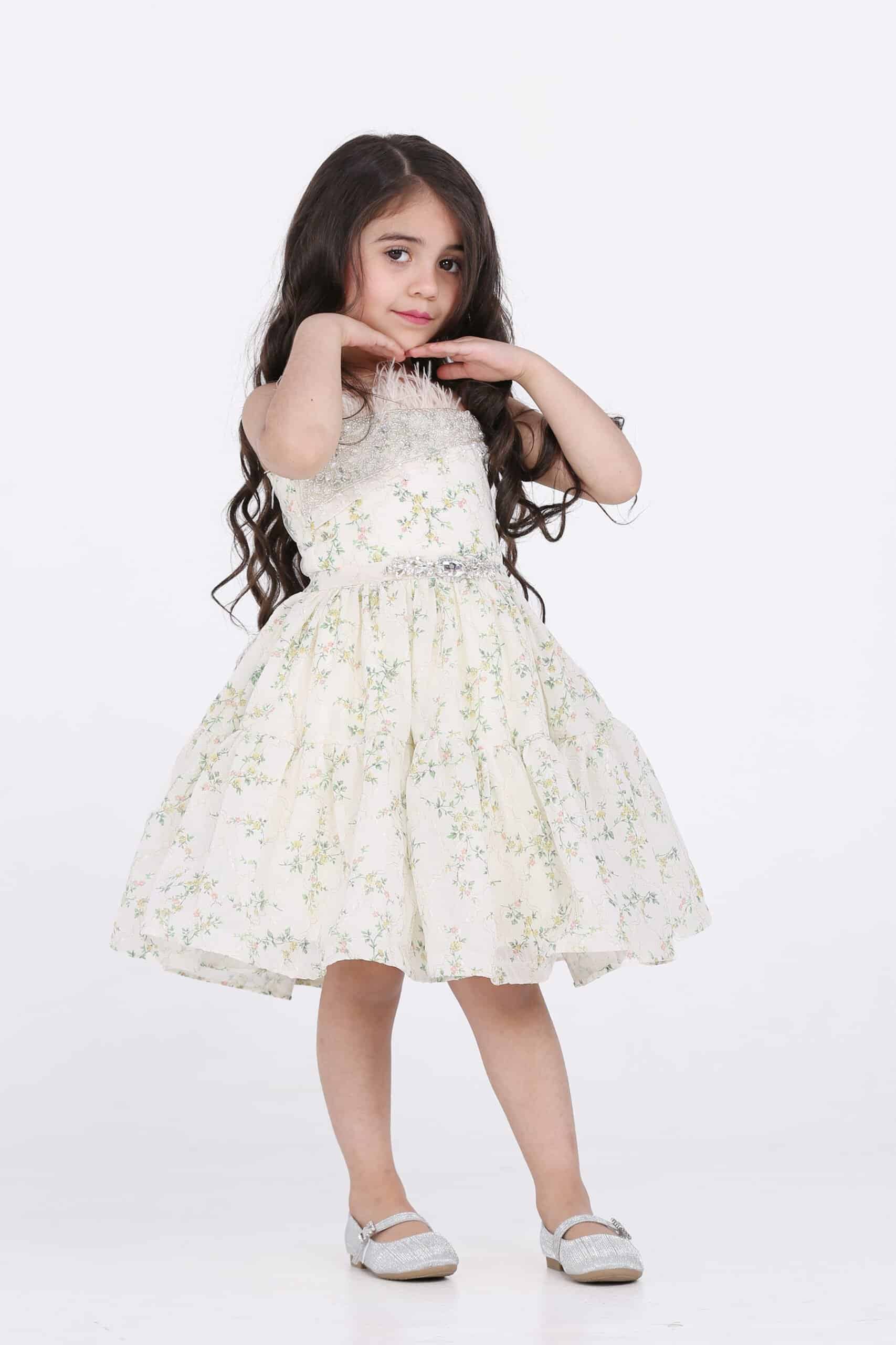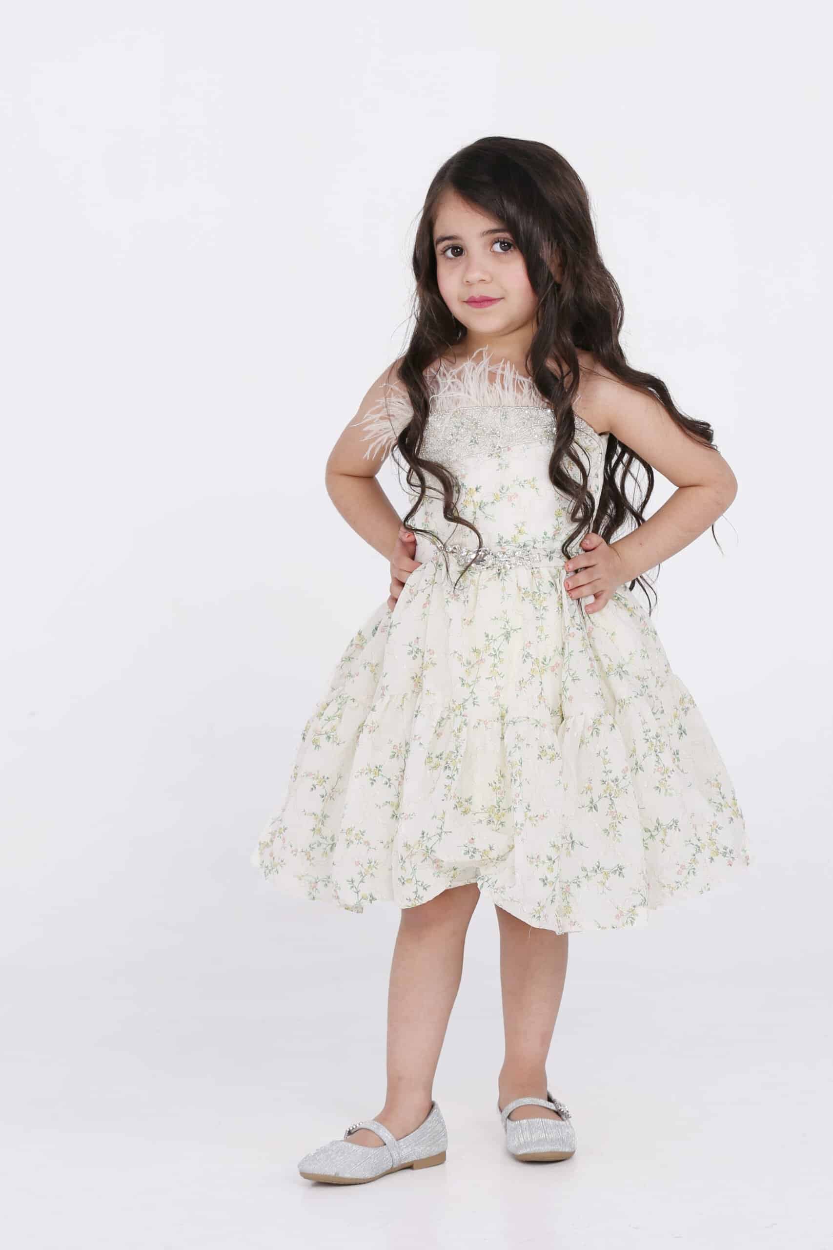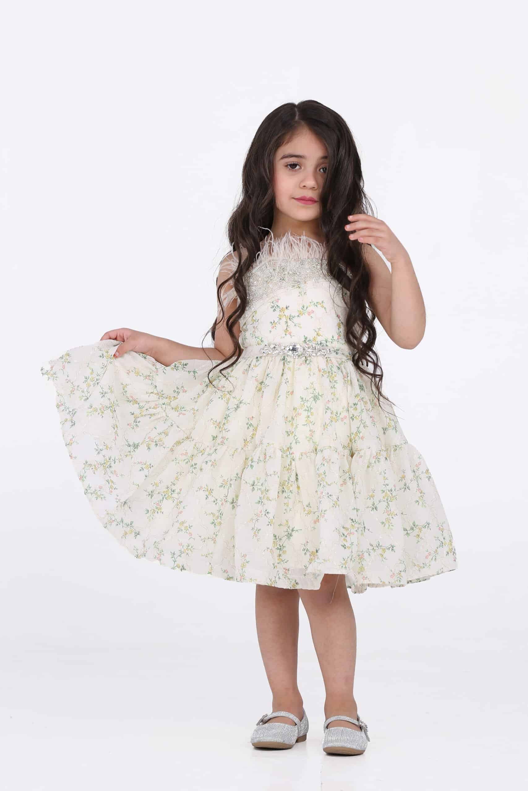 فستان بناتي بريش بالصدر مورد بنقشة أنيقة ولمسة الريش في الصدر والكرستالات المزينة في الخصر هو اختيار رائع للصغيرات اللواتي يرغبن في إطلالة أنيقة ومميزة. إن تصميم الفستان وتفاصيله المبتكرة والمزينة تضفي لمسة من الأناقة والجمال على الإطلالة، وتجعل الصغيرة تبدو ساحرة ومتألقة في أي مناسبة ترتديه فيها.