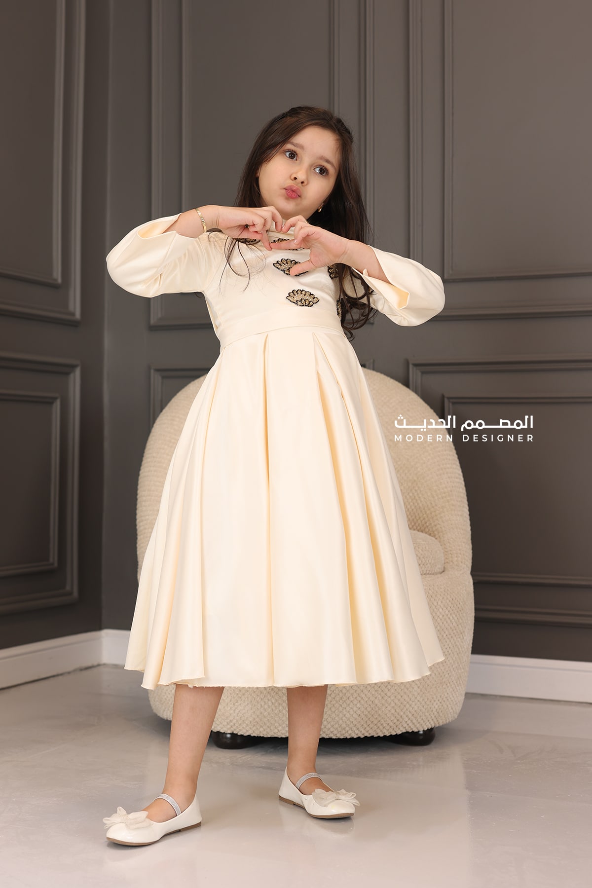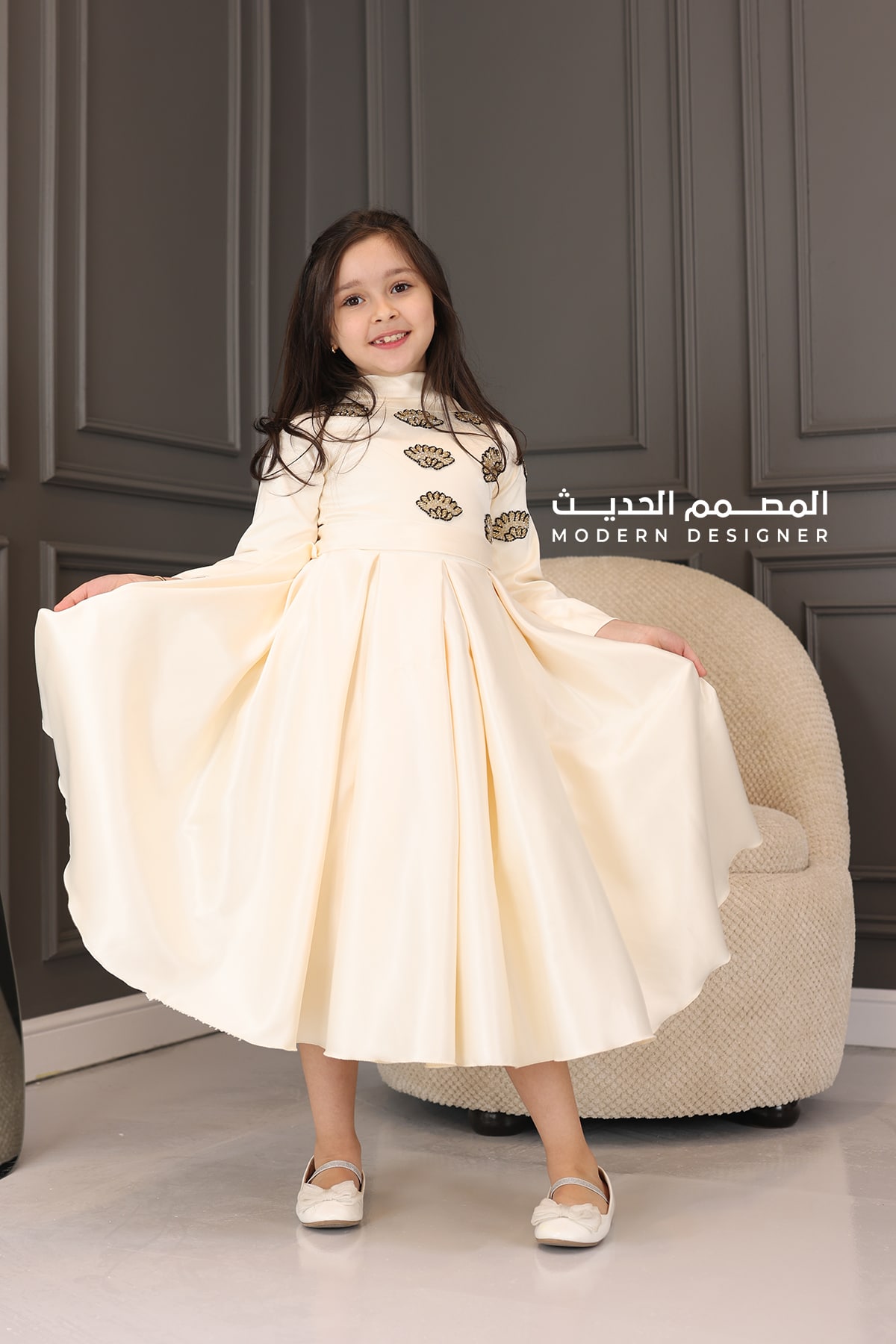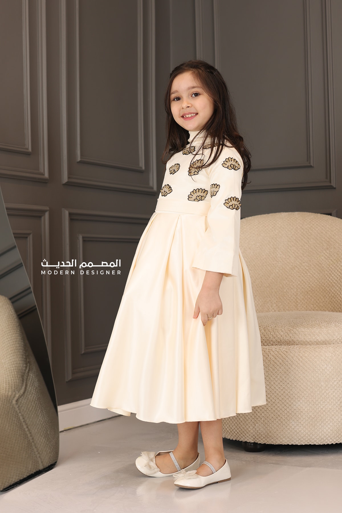 فستان بناتي بيج ناعم يتميز الفستان بأكمام طويل وبتطريز ذهبي على الصدر مما يجعل الفستان فخم  ويعتبر الفستان مميز بطلته الساحرة وصمم الفستان ليكون مناسباُ لكي في جميع المناسبات