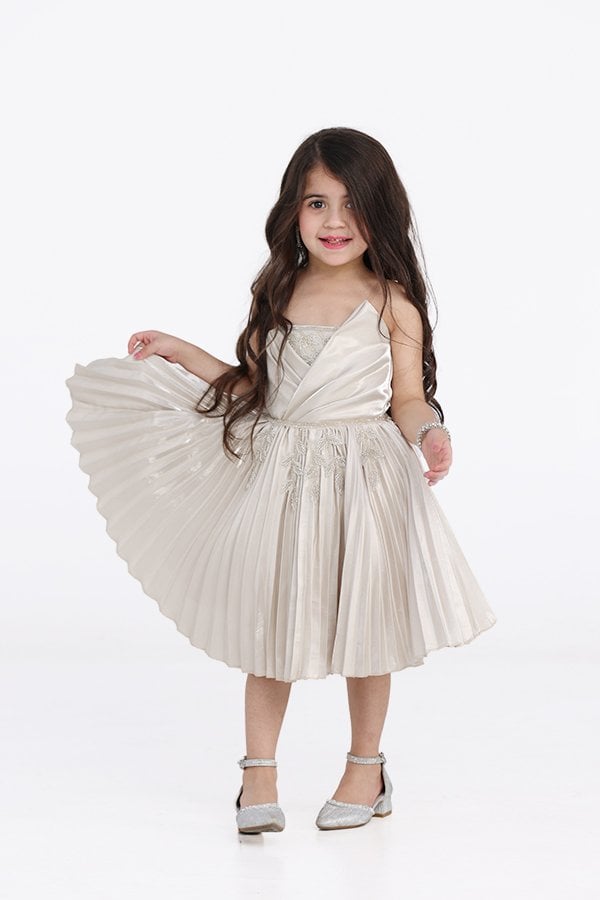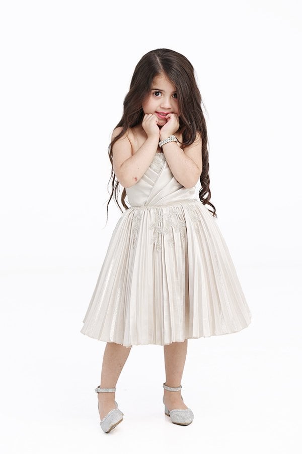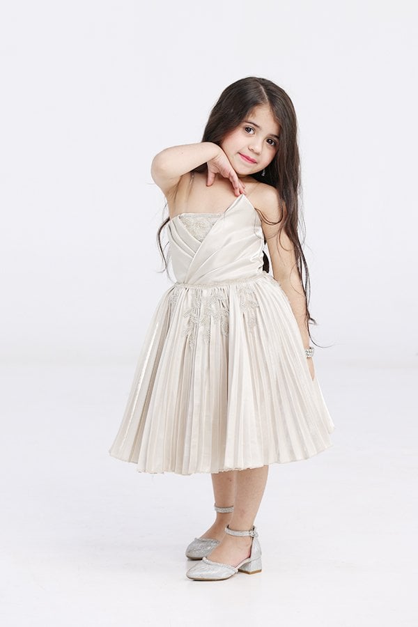 القصة: يتم تصميم الفستان بقصة ملائمة لجسم الطفلة وتناسبها بشكل جيد. يتم الاهتمام بالتفاصيل والقصة العامة للفستان لضمان الراحة