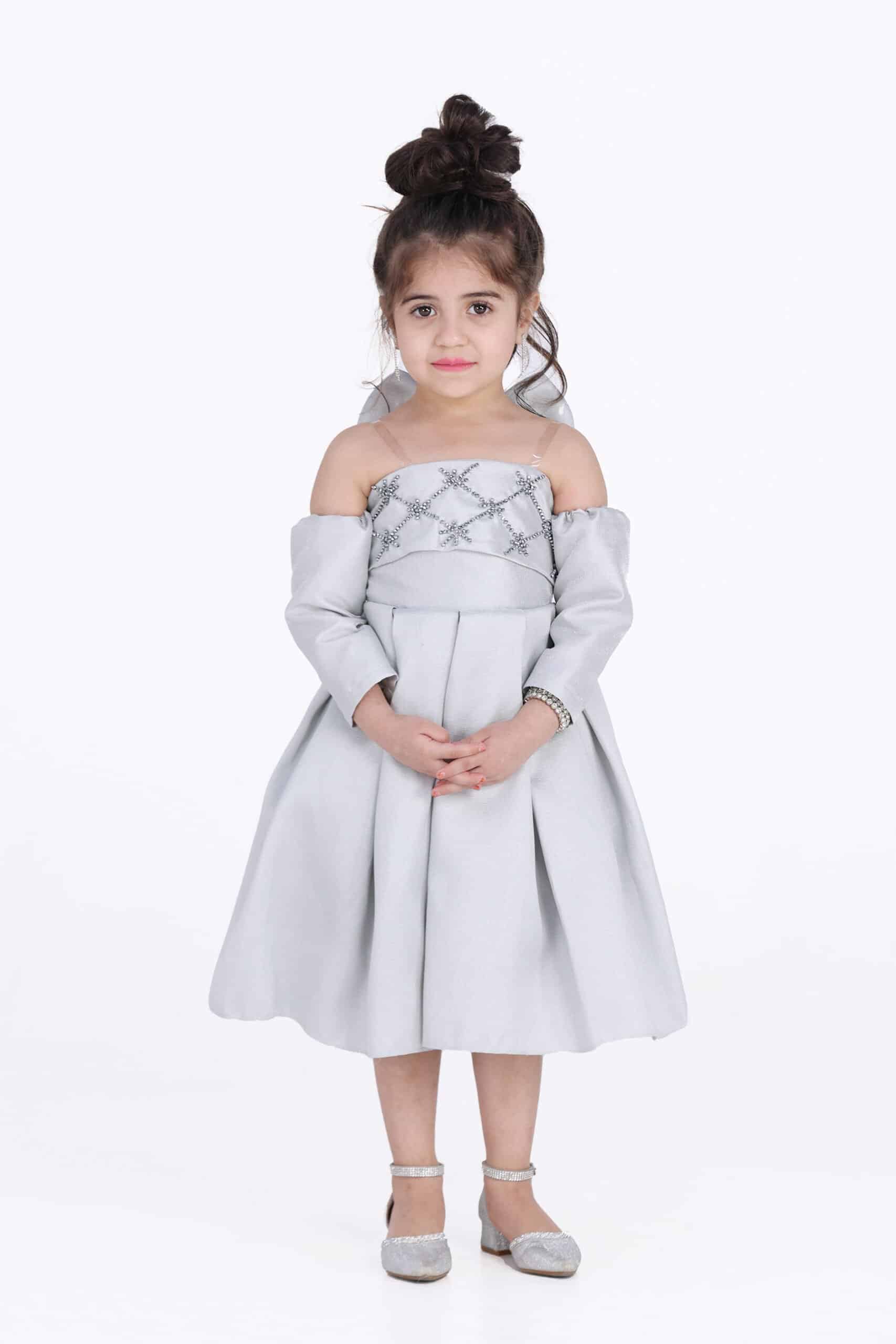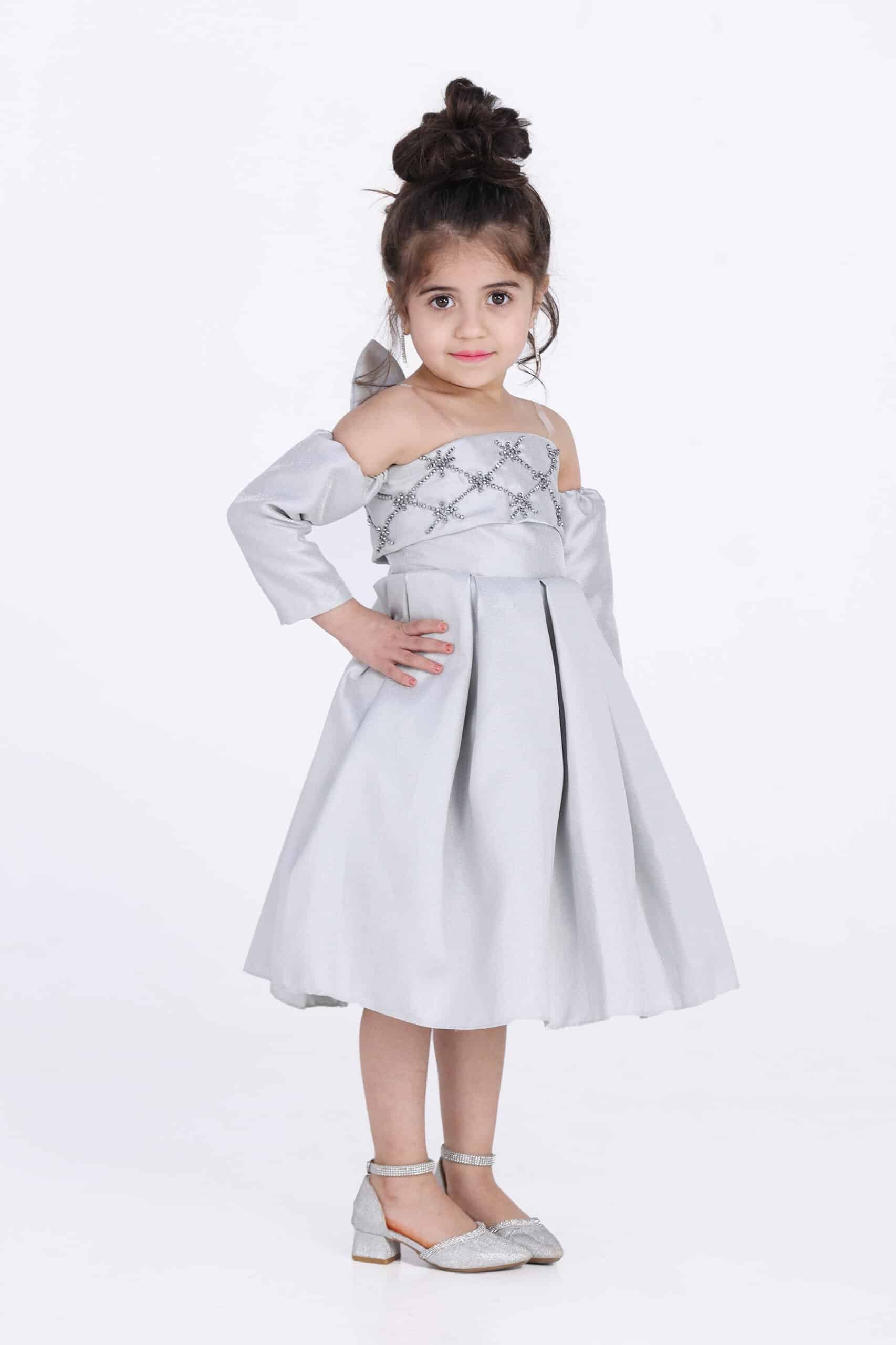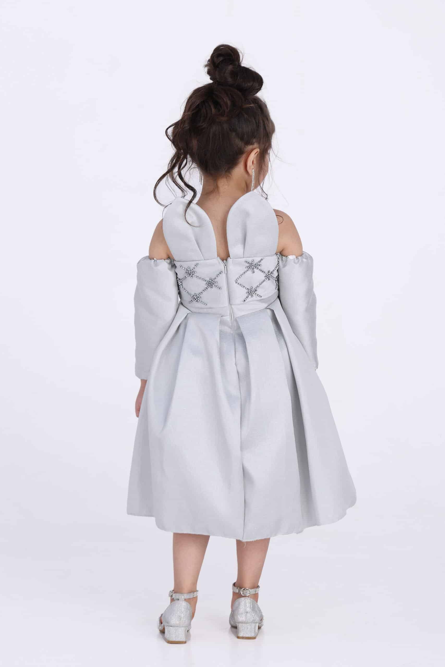 فستان بناتي راقي بإكمام طويلة مكشوف الاكتاف مطرز بالصدر والخلف ومتميز الخلف بشكل اجنحة نحله من احدث تصاميم المصمم الحديث