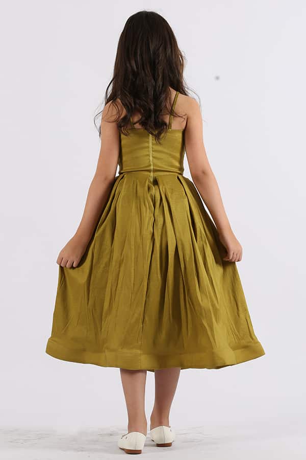 تصميم الفستان يتضمن مزموم الخصر الذي يساعد في إبراز القوام بشكل رشيق وجميل، مما يضيف لمسة من الأناقة والتناسق العام للإطلالة. كما أن عدم وجود الأكمام يعطي الفستان مظهرًا عصريًا يسمح للطفلة بالتنقل بحرية ويمنحها الراحة الكاملة. يمكن تنسيق هذا الفستان مع مجموعة من الأكسسوارات البسيطة مثل أقراط صغيرة أو أحذية لامعة لتكملة الإطلالة.
