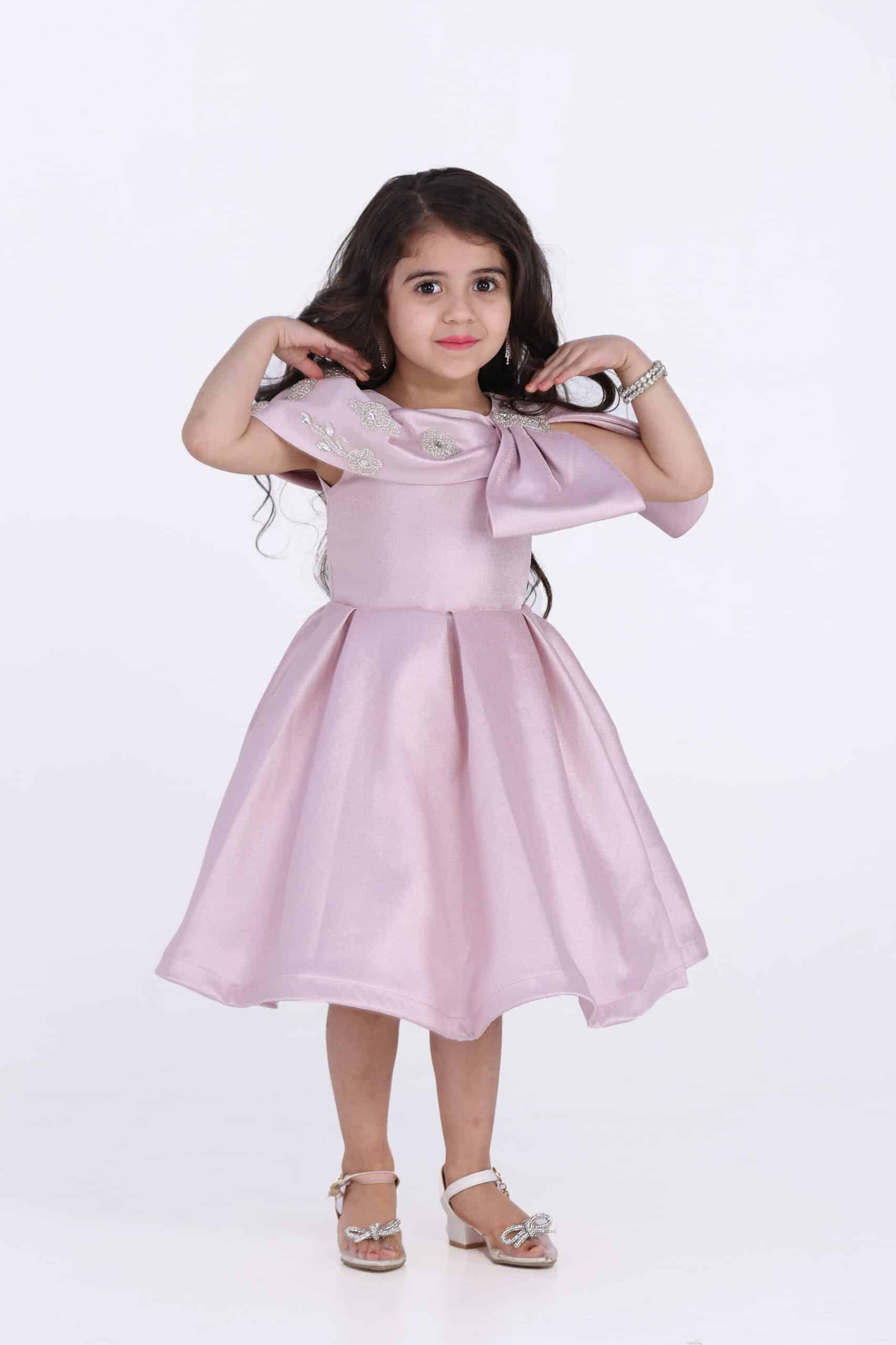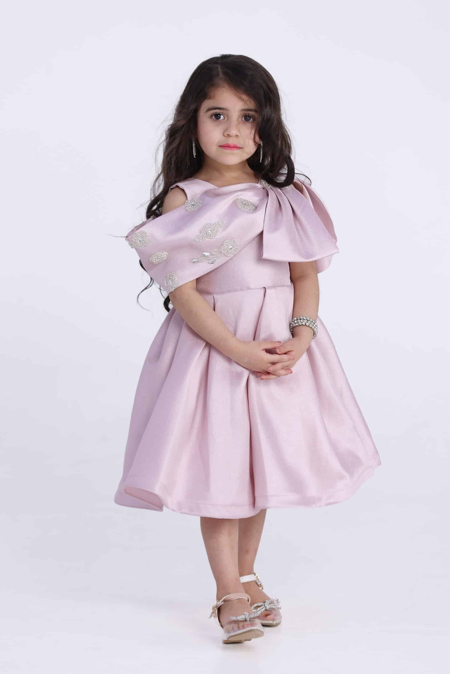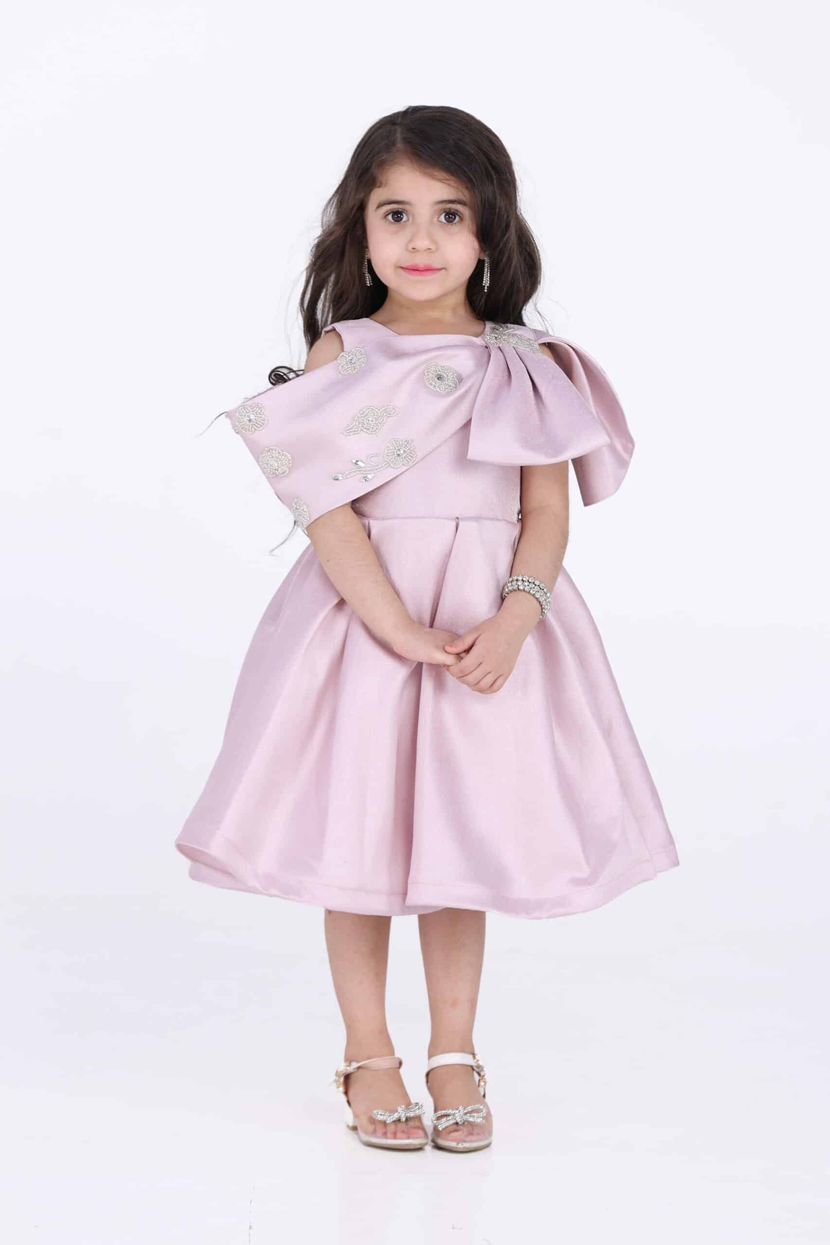 التصميم: يتميز الفستان بتصميمه الأنيق والفريد، الذي يجمع بين الأناقة والفخامة. يتميز الفستان بقصة واسعة وواسعة، مما يمنح الطفلة مظهرًا أنيقًا وجذابًا. كما يتميز الفستان بفيونكة على الكتف، مما يضفي عليه لمسة من الأنوثة والرقة.