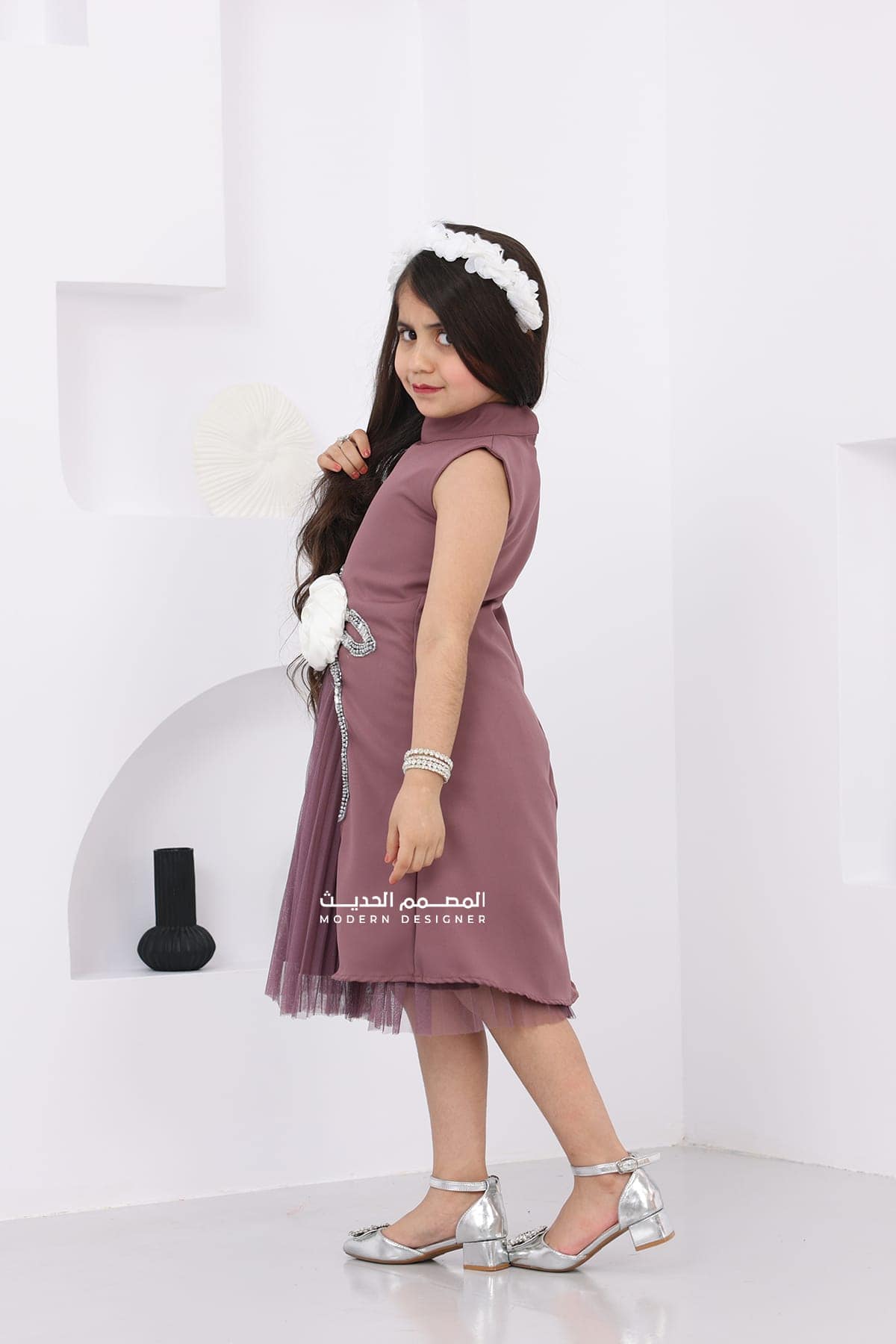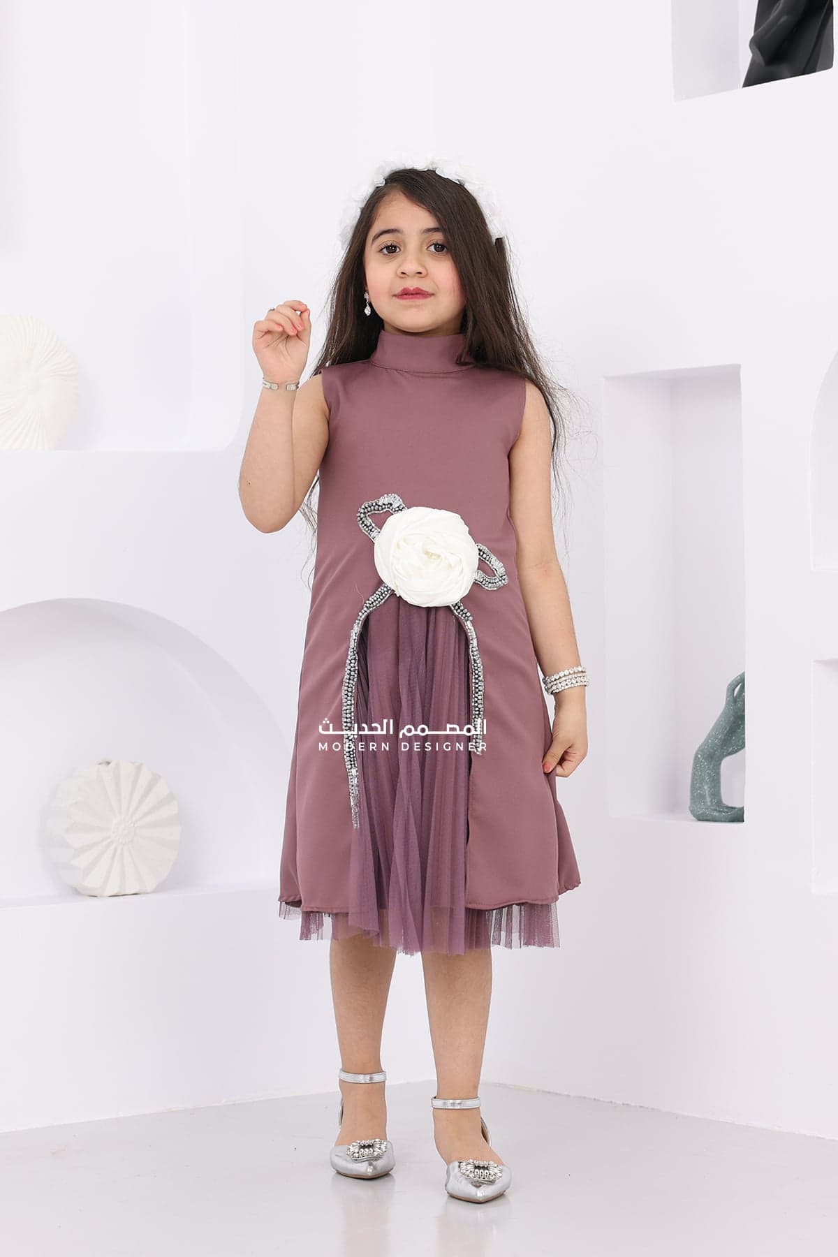فستان بناتي ناعم للمناسبات مصنوع من خامتي كريب باربي والتل الأسود، يتميز بوردة أنيقة على الصدر تضفي لمسة رقيقة وأنثوية. تصميم مثالي لإطلالة مميزة وجذابة تناسب كافة المناسبات.