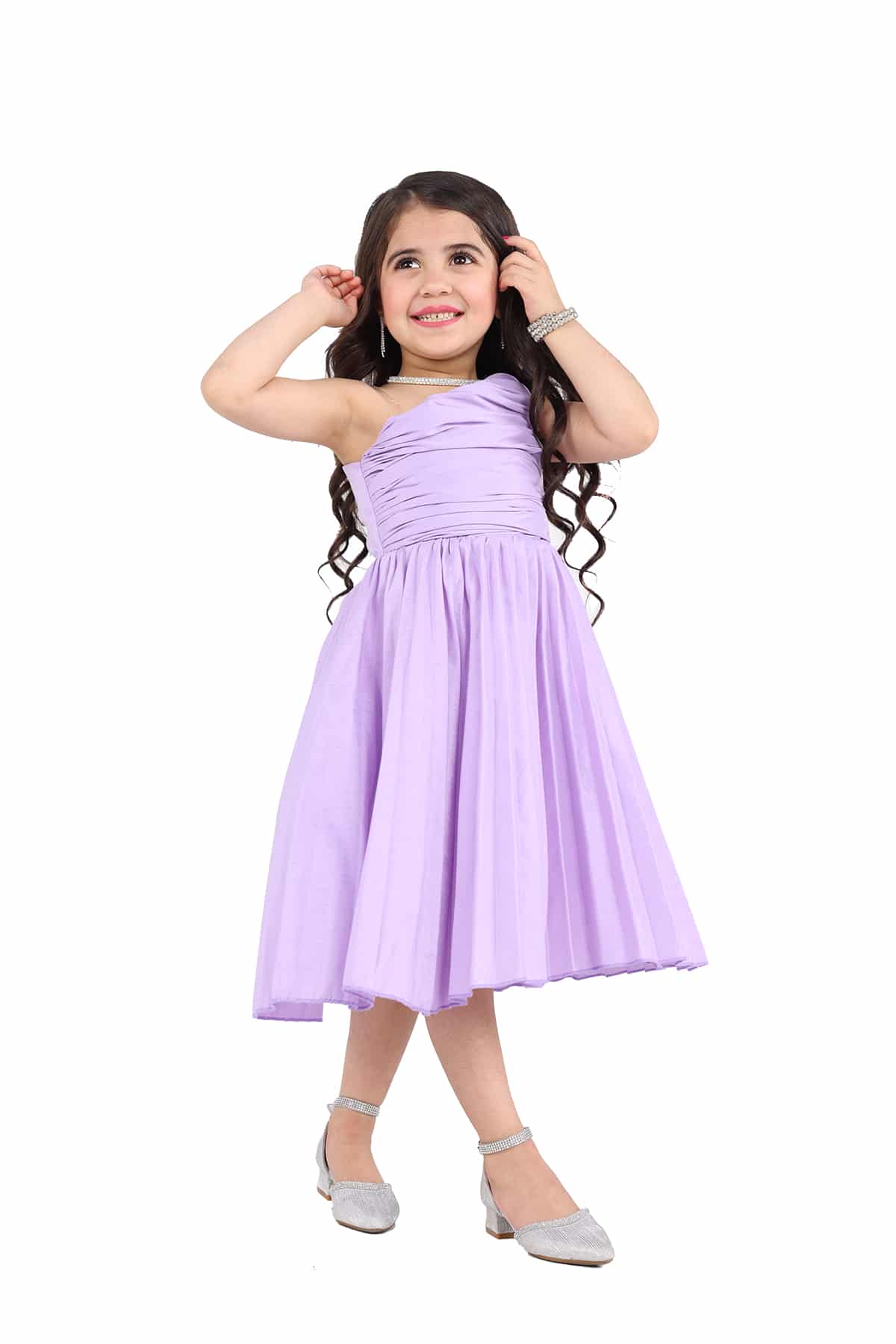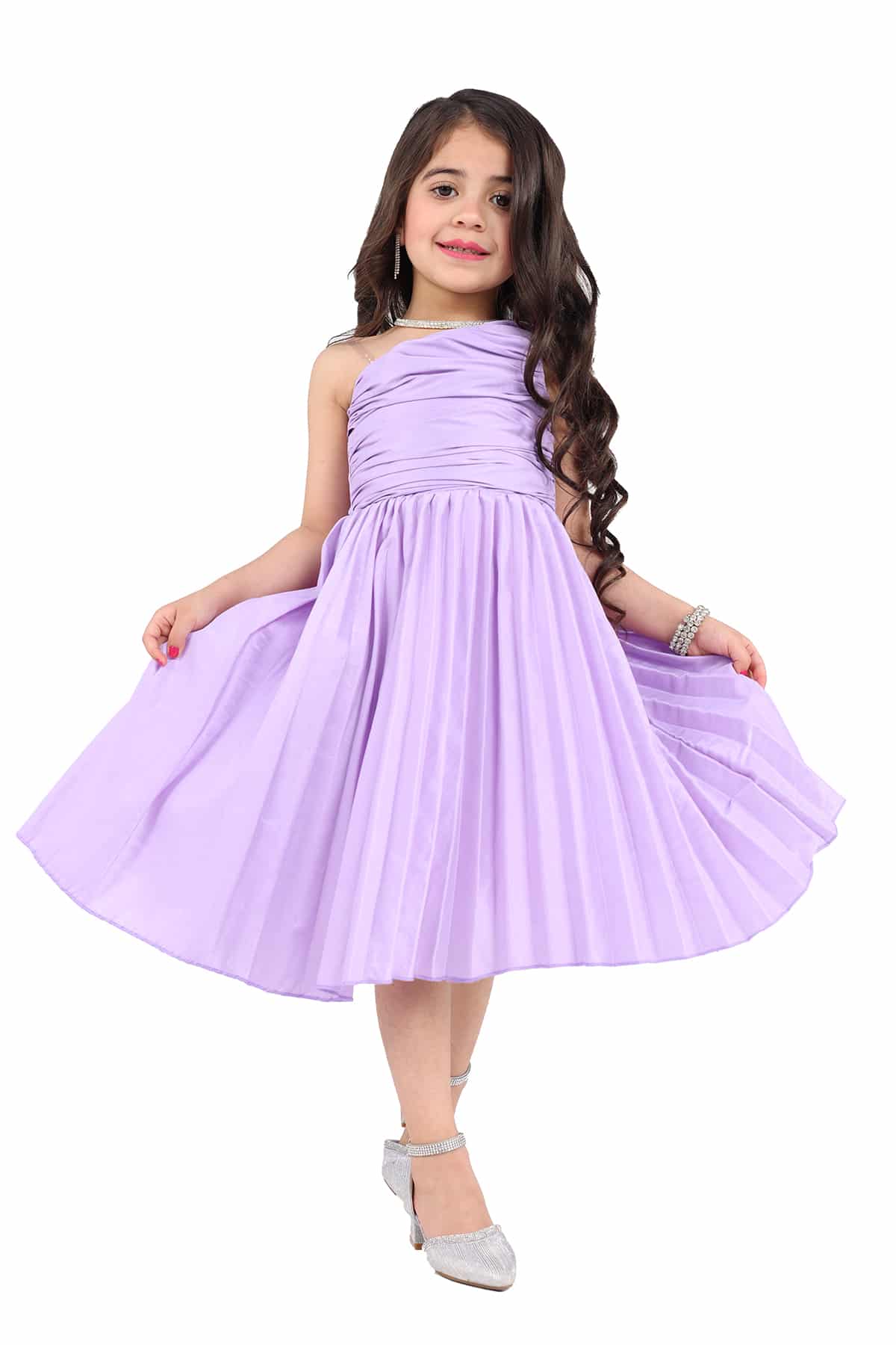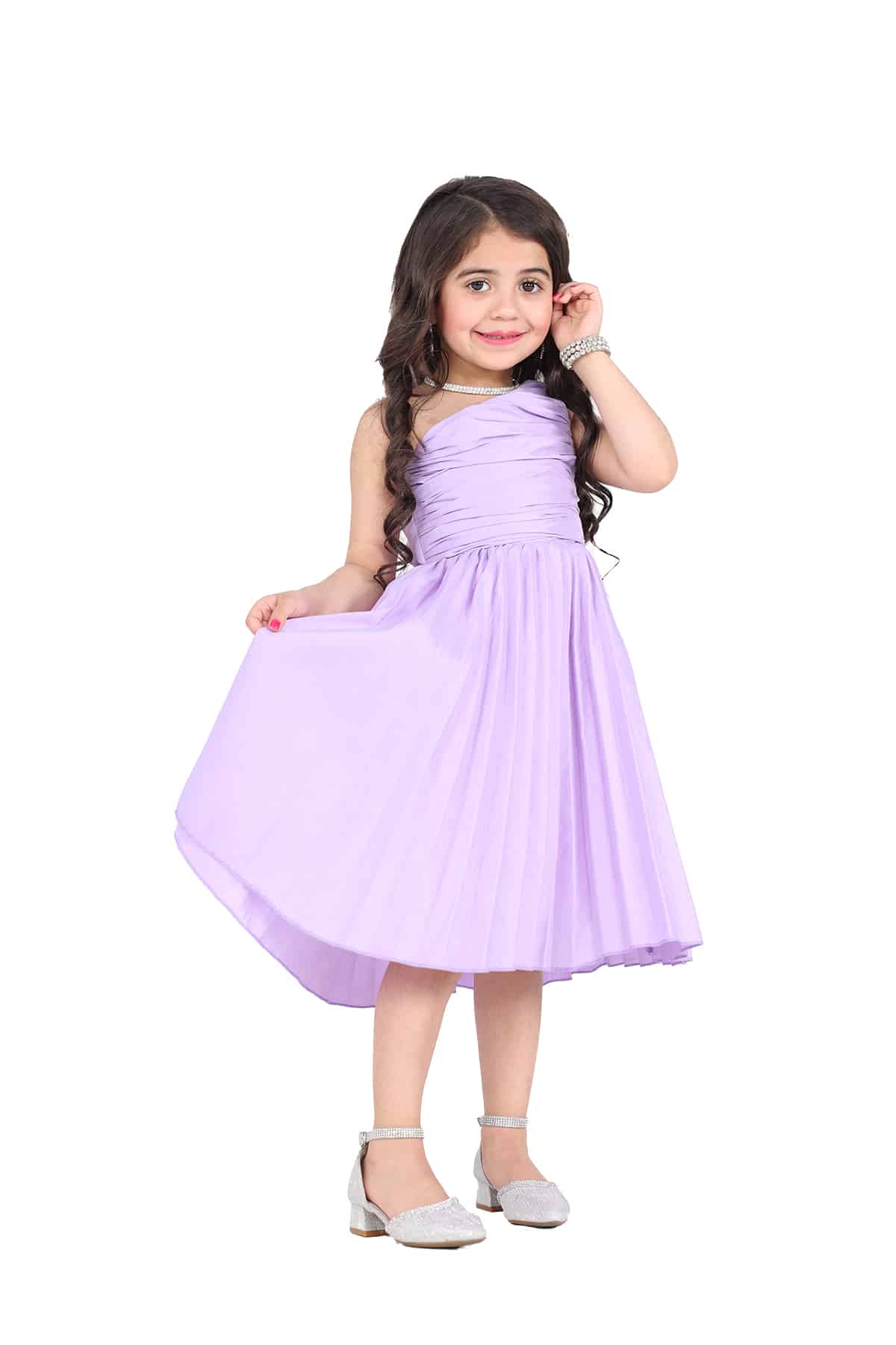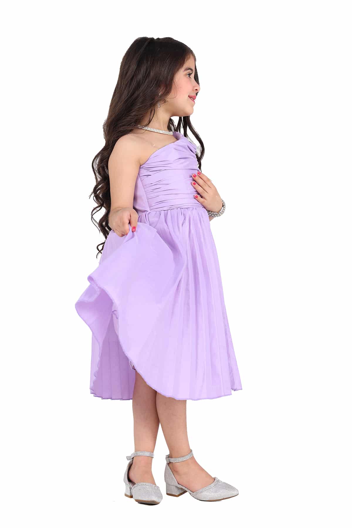 فستان بناتي ناعم كتف واحد من خامة الشانتون البليسيه صمم هذا الفستان بكسرات انيقة لتبرز جمال التصميم بلونه المميز ليمنحك طفلتك اطلالة مميزة وساحرة