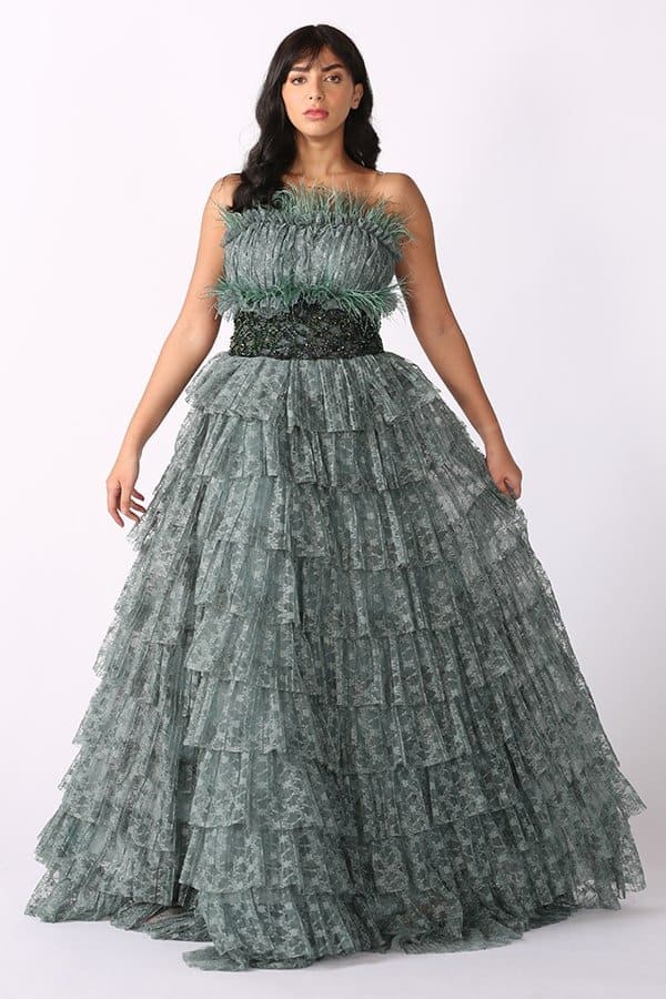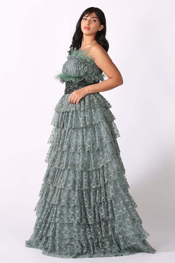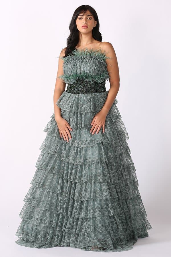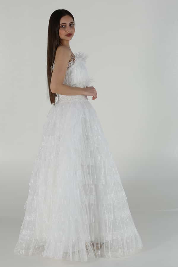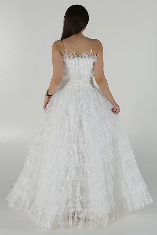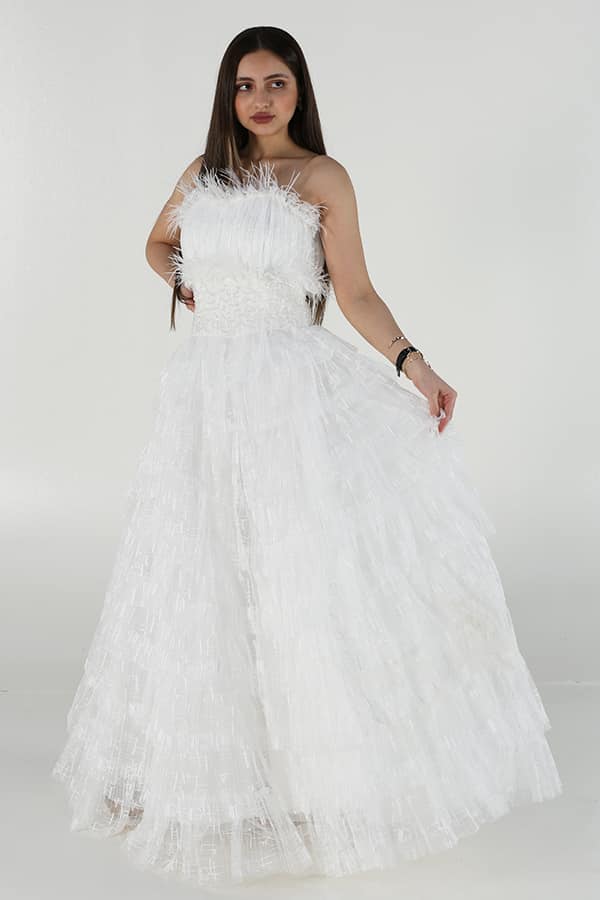 فستان توب سهرة بطبقات دانتيل وريش هو خيار مثالي لإطلالة رومانسية وفاخرة في المناسبات الخاصة. يتميز بتصميمه الراقي والفريد، الذي يجمع بين الفخامة والأناقة في تناغم رائع. فالتفاصيل الدقيقة للطبقات المصنوعة من الدانتيل تضفي على الفستان لمسة من الرقة والأنوثة، في حين يضيف الريش الناعم في الجزء العلوي لمسة من الفخامة والتميز، مما يرفع من جمال الفستان ويجعله يبرز بشكل لافت. يعد هذا الفستان من الخيارات المثالية للسيدات اللواتي يسعين للحصول على إطلالة ساحرة ومبهرّة في المناسبات الرسمية مثل الحفلات الكبرى، الأعراس، والاحتفالات الخاصة. تصميمه الطويل يُضفي لمسة من الأناقة الملكية، في حين أن التفاصيل الدقيقة مثل الريش والدانتيل تساهم في منح الفستان جمالًا استثنائيًا يلفت الأنظار دون مبالغة.