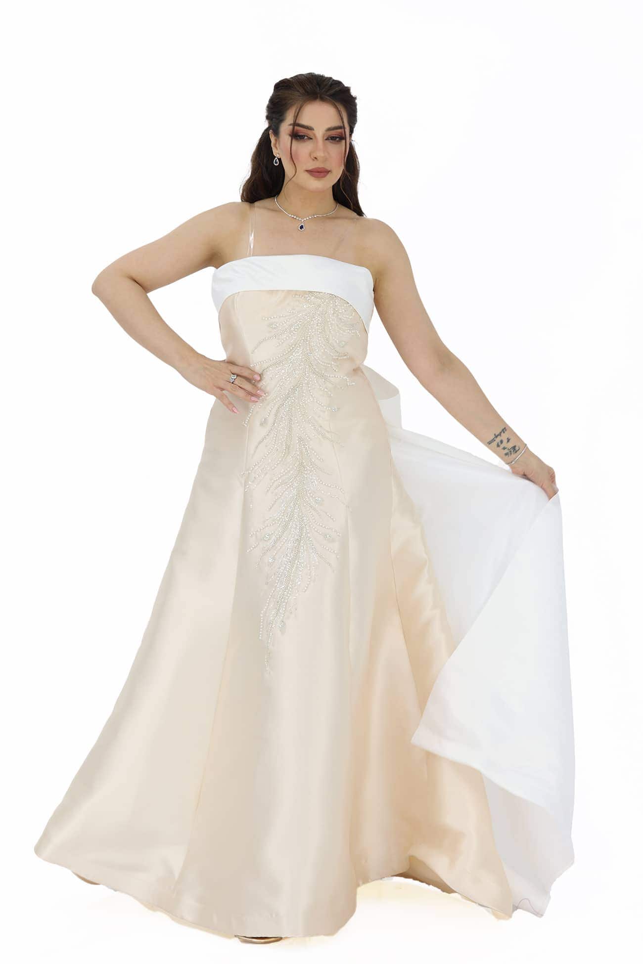 التعامل بحذر: عند ارتداء وخلع الفستان، تجنبي السحب الشديد والتعامل الخشن الذي قد يؤدي إلى تلف الكريستالات والإكسسوارات.