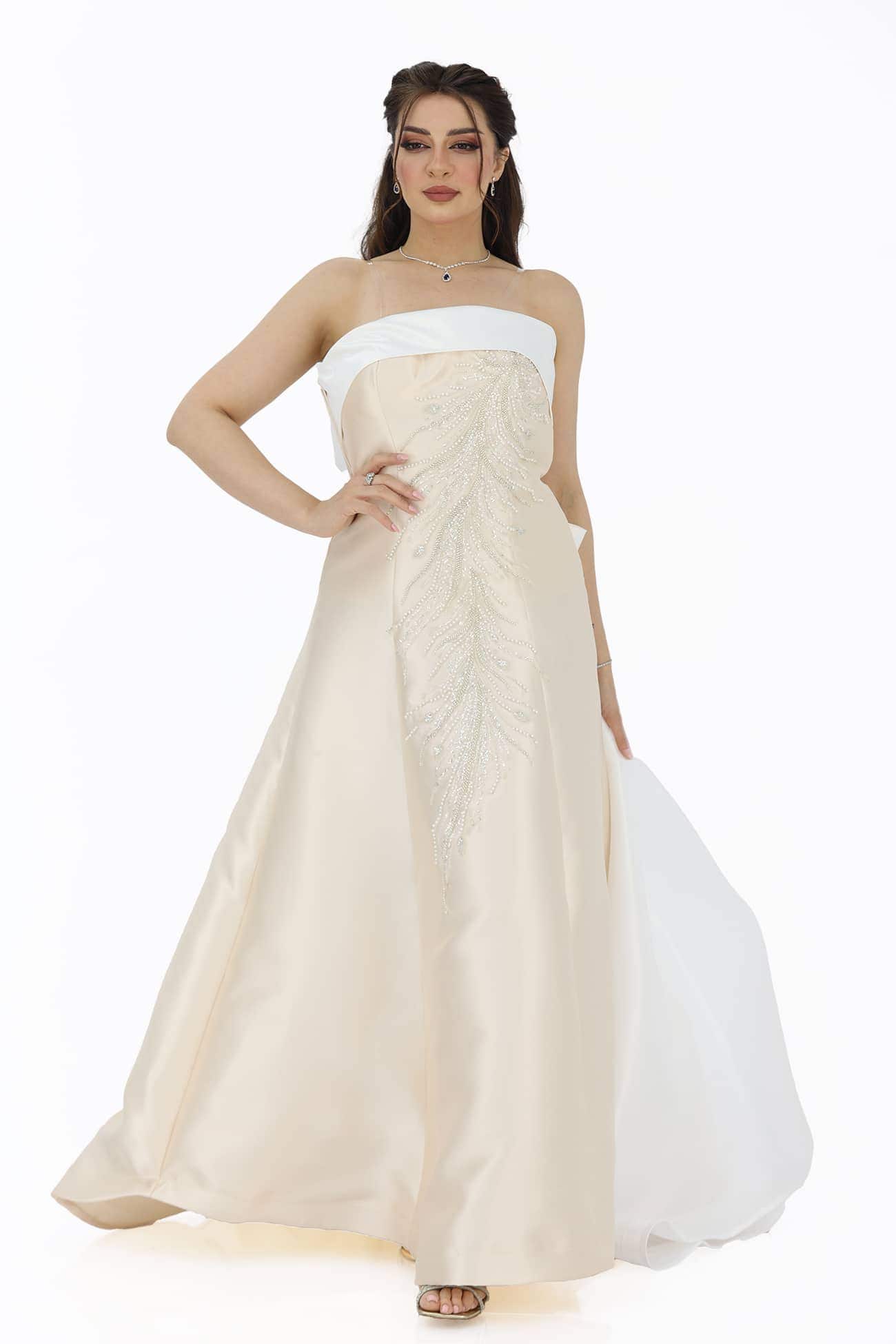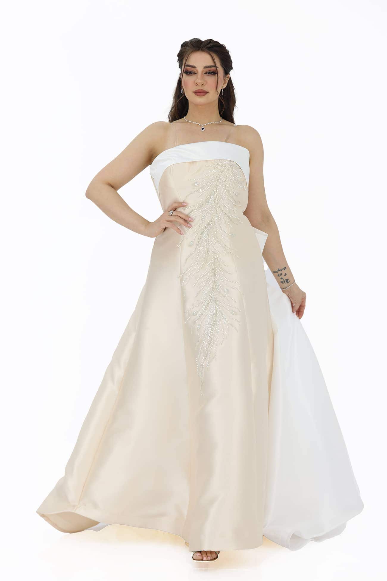 الكلفة : تفصيل الكلفة البيج على الصدر يعتبر تفصيلًا مبهرًا يبرز جمال الفستان ويضفي لمسة من التألق والأناقة على المظهر العام.