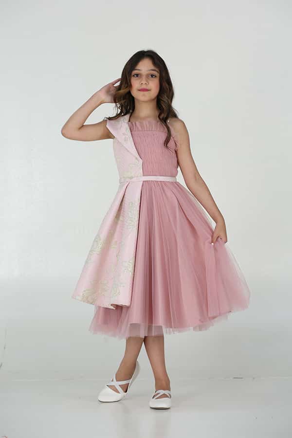 فستان بناتي راقي من خامة التل الناعم مزين بقماش مشجر مع حزام انيق في الخصر كلوش من الاسفل يظهر صغيرتك بمزيد من الاناقة والتميز يتم استخدام قماش مشجر كتفاصيل مزينة على الفستان، مما يعطيه لمسة فريدة وجمالية. يمكن أن يكون القماش مشجرًا بنقوش زهور يضيف للفستان جاذبية وأناقة.