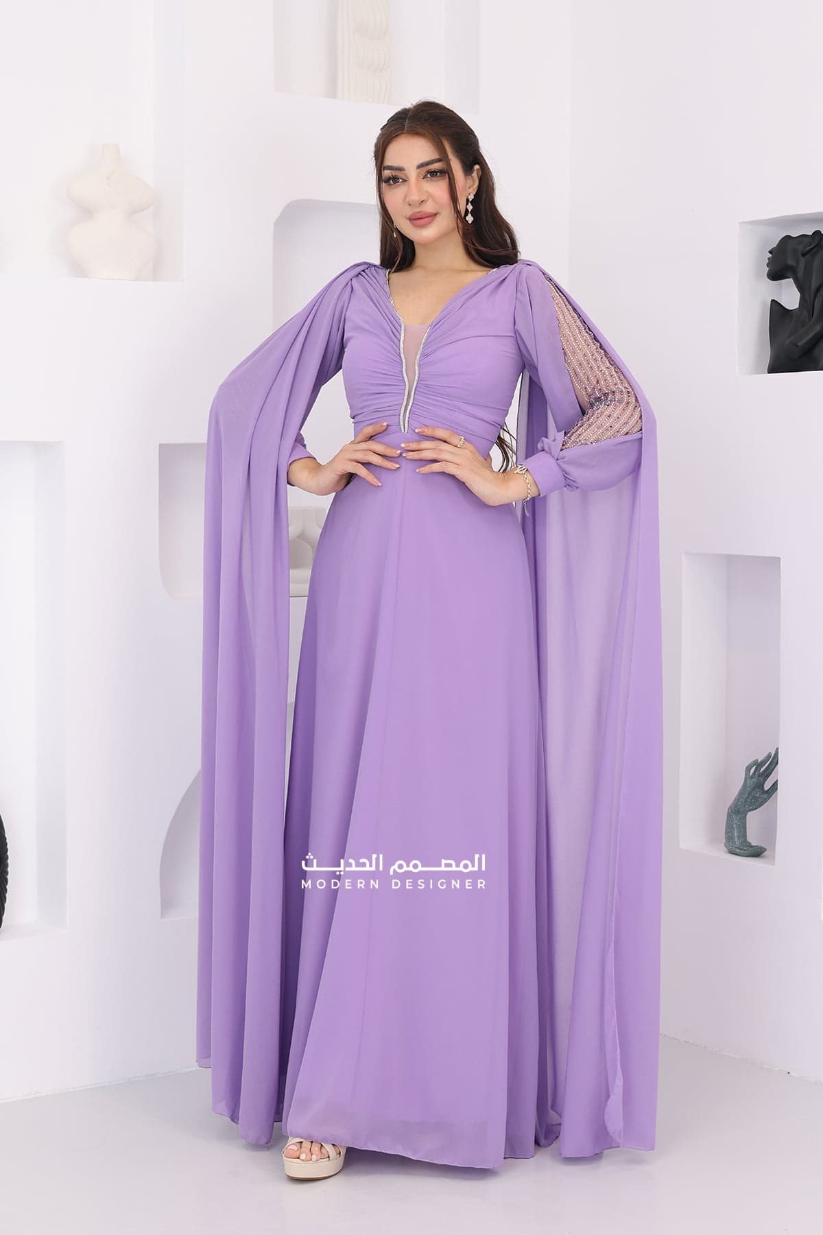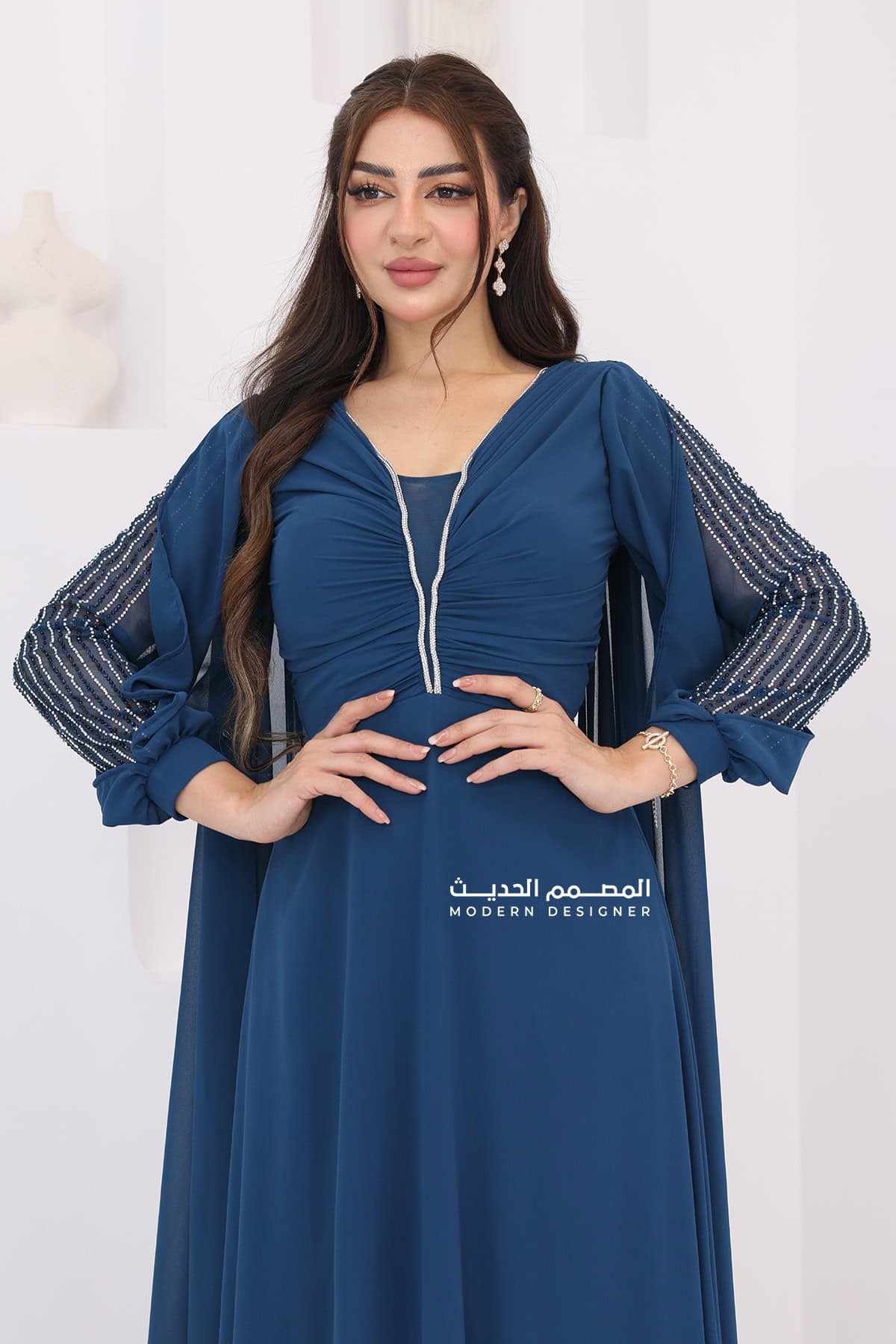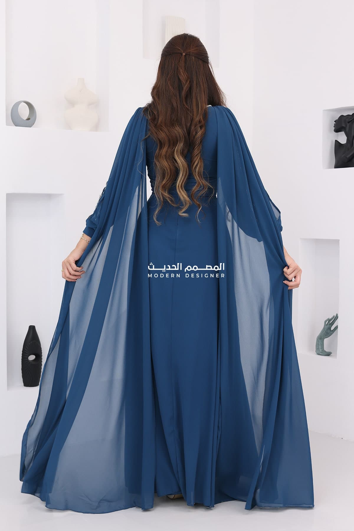 فستان سهرة بأكمام كيب يتميز الفستان بأكمامه الانيقة وتطريز على الاكمام ليعطيه مظهرا انيقا لكي يصبح من أفضل فساتين السهرة في براند المصمم الحديث حيث صنع الفستان من خامة الشيفون لكي يعطيك اطلالة مميزة في جميع المناسبات