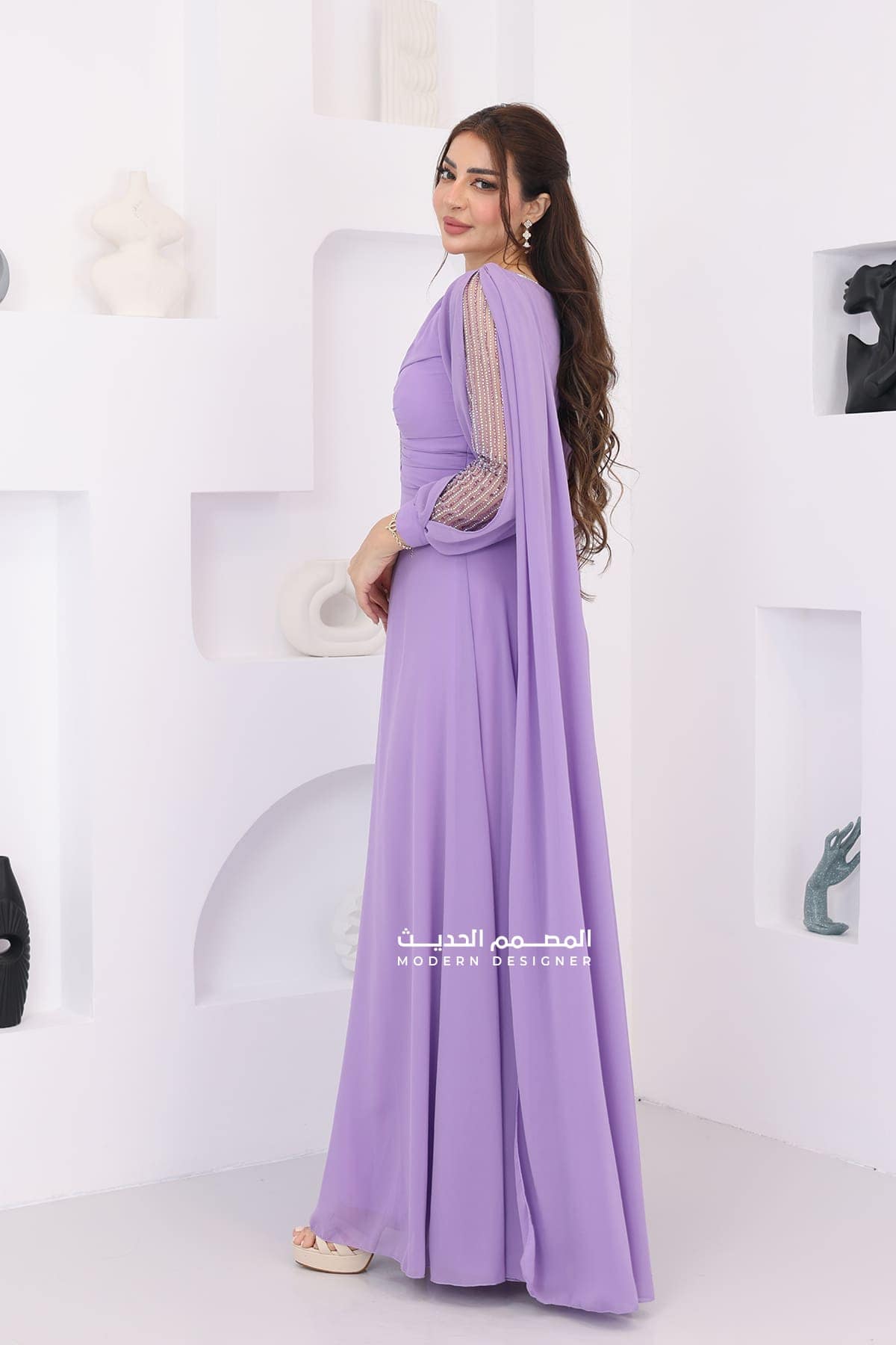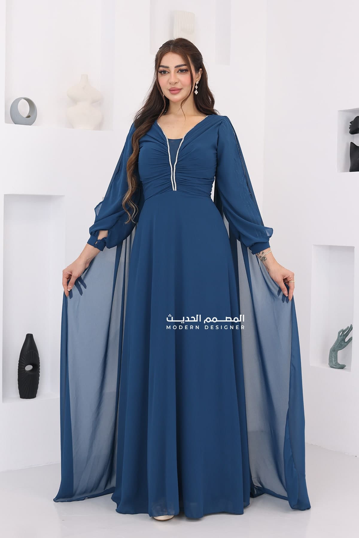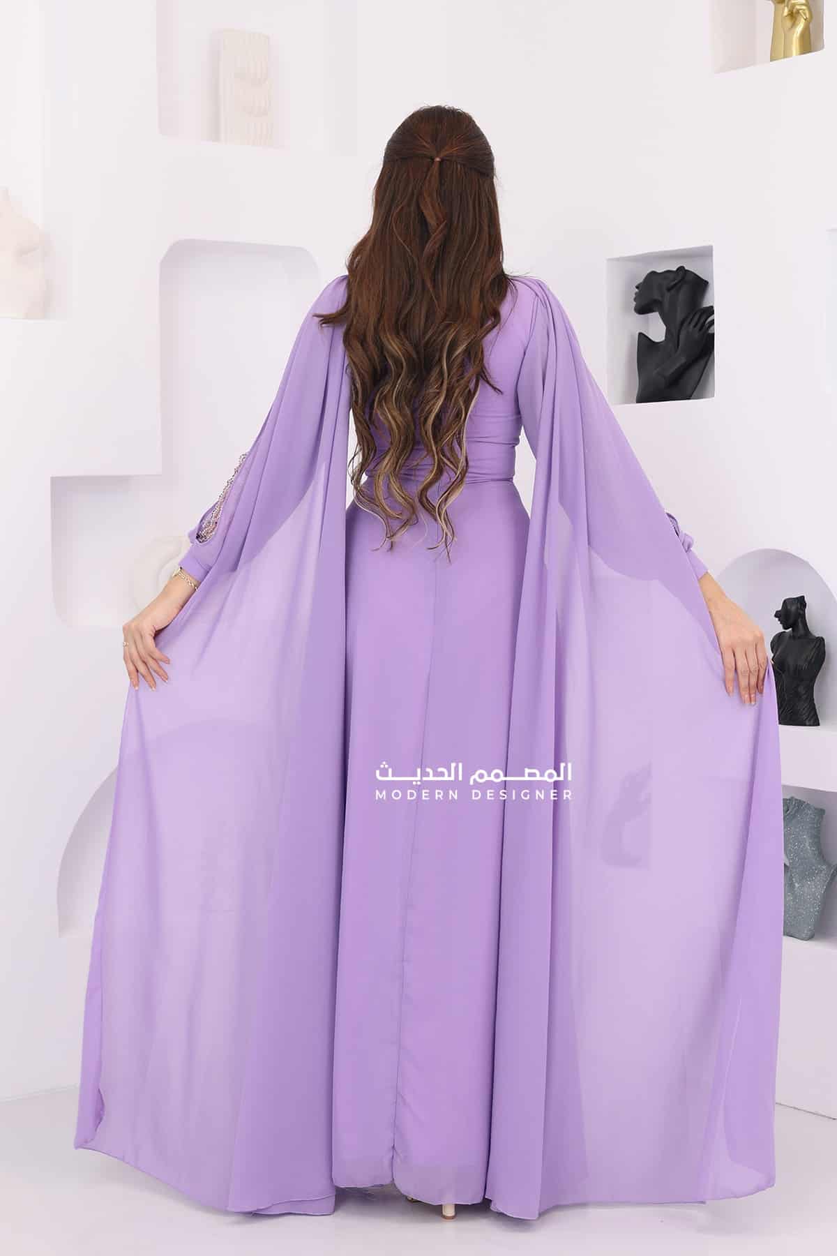 فستان سهرة بأكمام كيب يتميز الفستان بأكمامه الانيقة وتطريز على الاكمام ليعطيه مظهرا انيقا لكي يصبح من أفضل فساتين السهرة في براند المصمم الحديث حيث صنع الفستان من خامة الشيفون لكي يعطيك اطلالة مميزة في جميع المناسبات