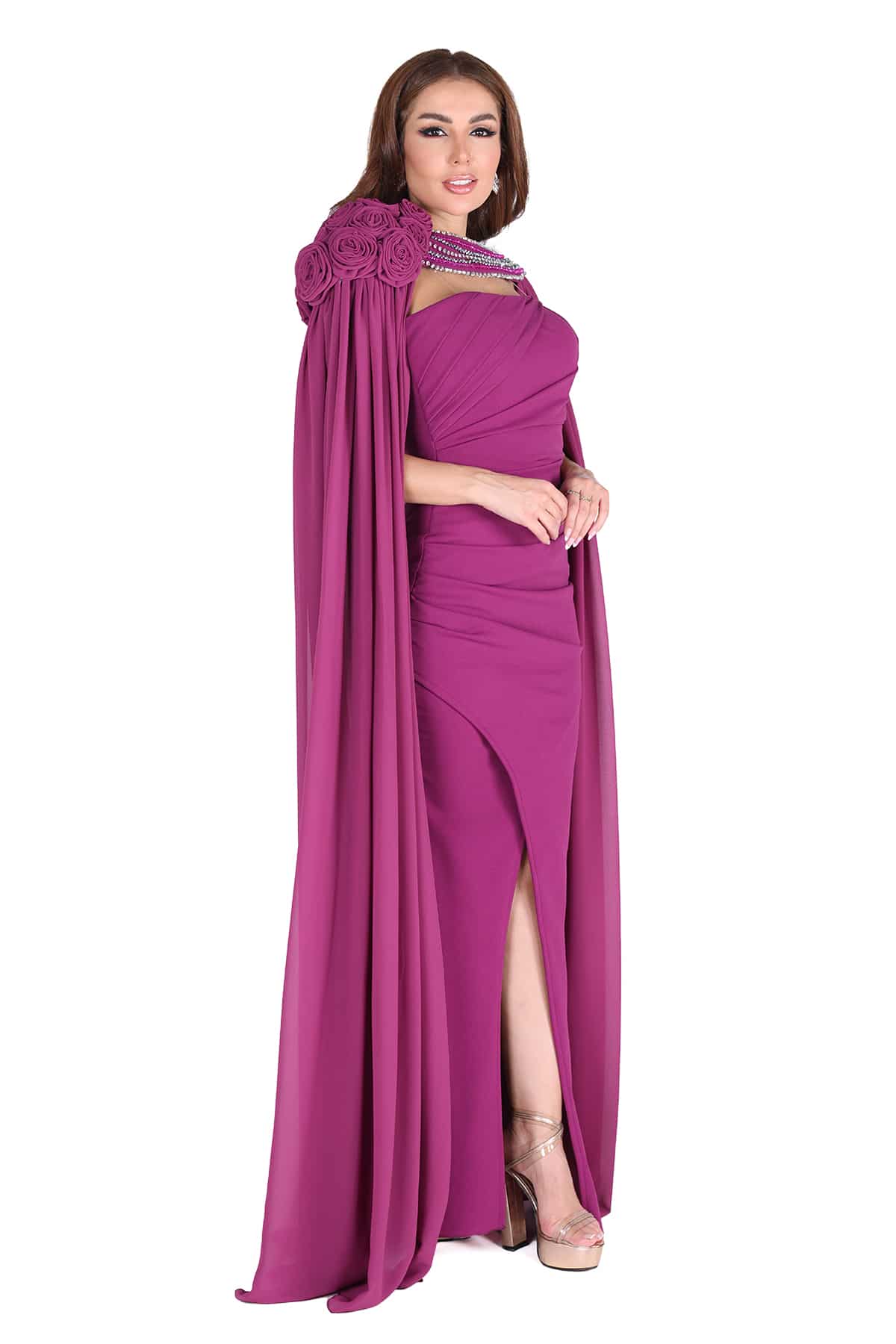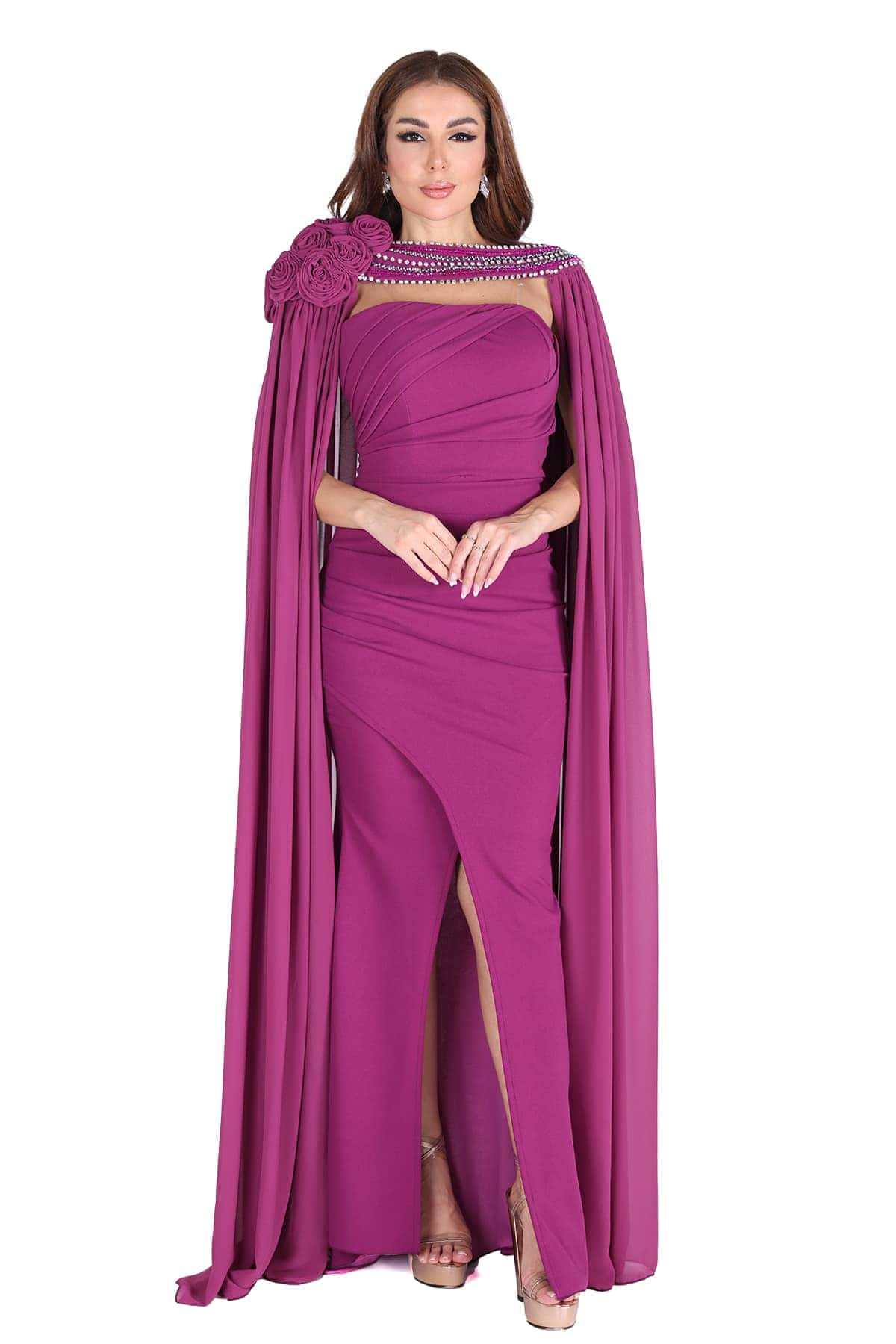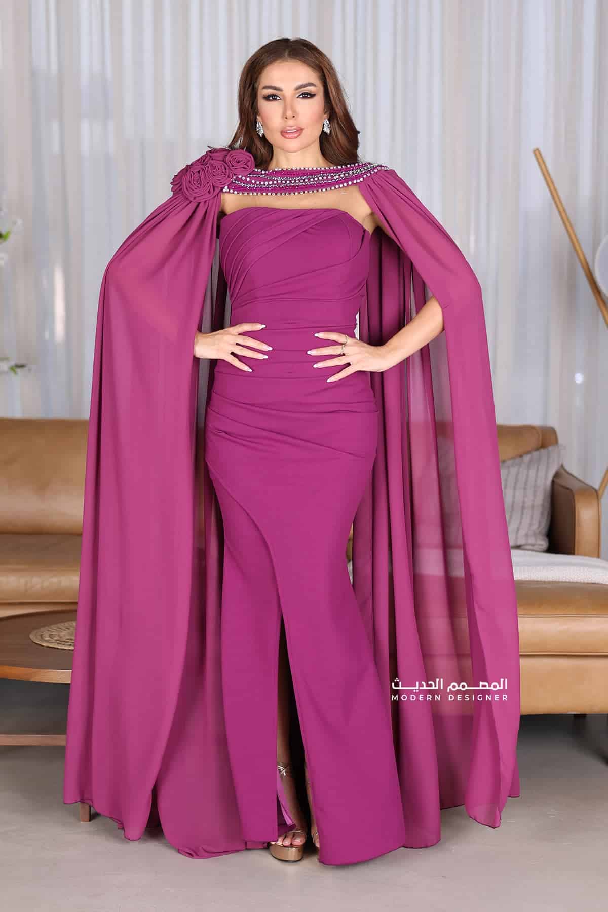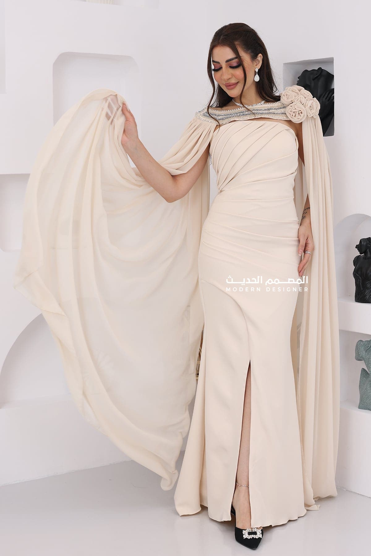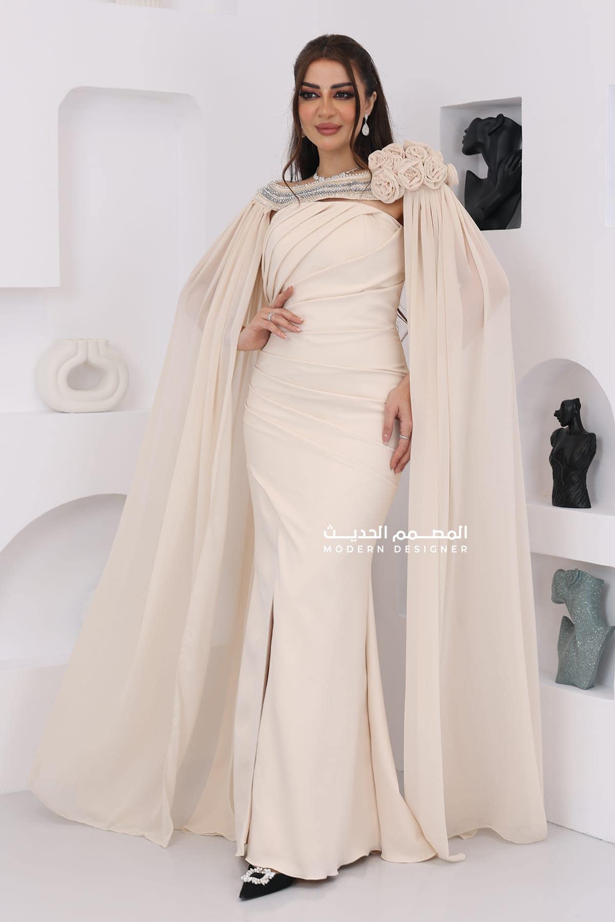 فستان سهرة بأكمام منديل فخمة يتميز الفستان بتصميمه الفريد والأنيق الذي يبرز جمال المرأة التي ترتديه وكما يتميز بقطعتين القطعة العلوية مطرزة وبوردة فاخرة وفي الأسفل مفتوح مما يعزز جمال التصميم ويضفي لمسة سحرية وأنثوية على إطلالة المرأة