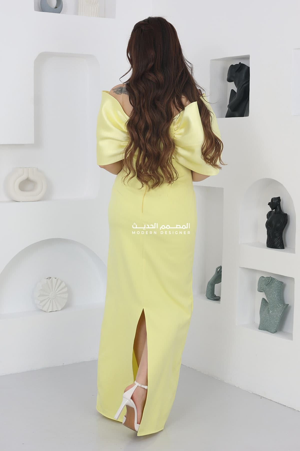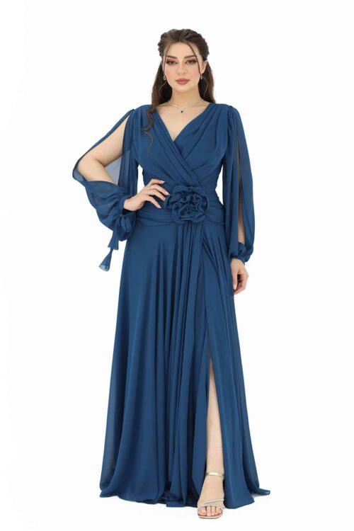 التصميم: يتميز الفستان بتصميمه الطويل والأنيق، مما يعطي للإطلالة لمسة راقية وأنيقة. يمتد الفستان على طول الجسم، مما يعزز التناسق الجمالي ويساعد في إبراز قوام الشخص الذي يرتديه.
