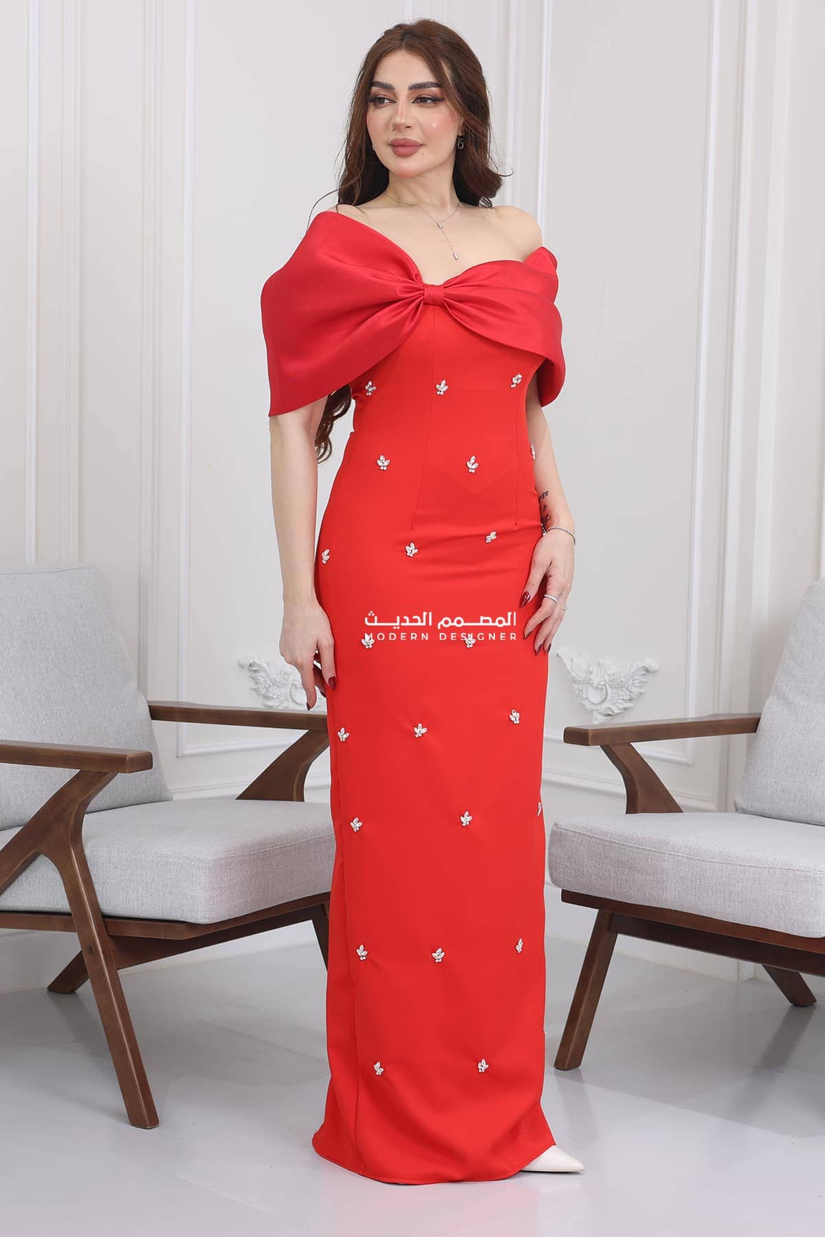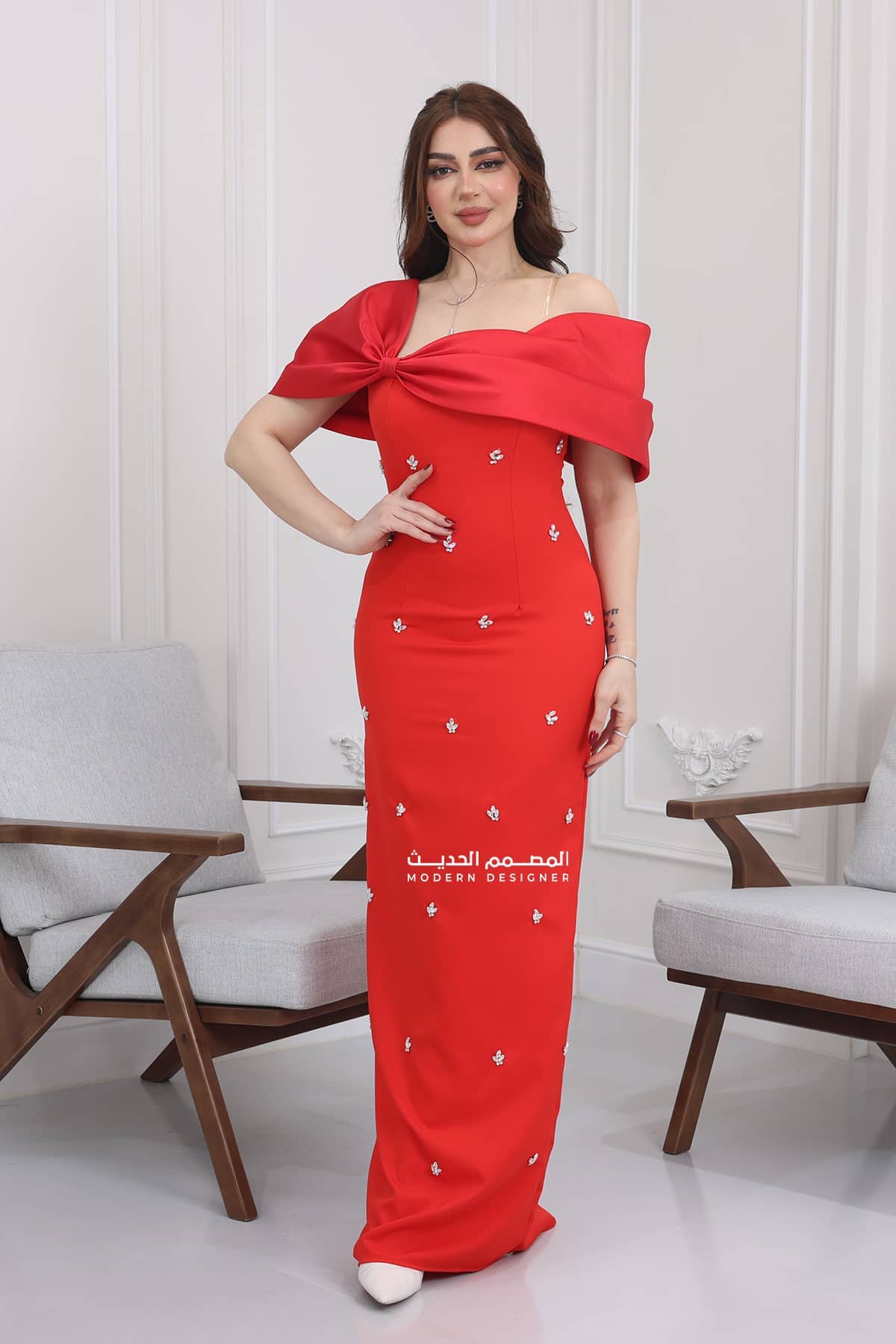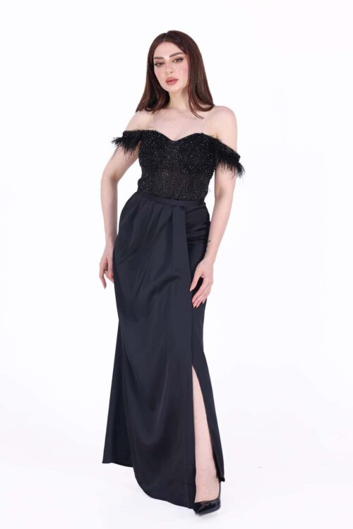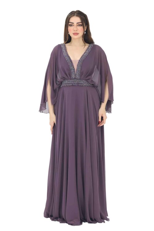 فستان سهرة بتصميم حديث يتميز بخامة الكريب هو قطعة رائعة ومميزة تجمع بين الأناقة والفخامة يتم صنع الفستان من خامة التفتة شانتون، وهي خامة فاخرة وراقية. تتميز التفتة شانتون بقوامها الناعم واللامع، مما يضفي لمسة من الفخامة والتألق على الفستان. تتدفق التفتة شانتون بشكل جميل وتتحرك بأناقة عند الحركة، مما يضفي جمالًا ورقيًا للإطلالة.