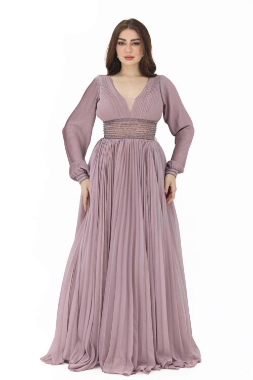 الخامة : يتم صنع الفستان من خامة الكريب، وهي خامة فاخرة وراقية. يتميز الكريب بقوامها المميز، مما يضفي لمسة من الفخامة والتألق على الفستان.