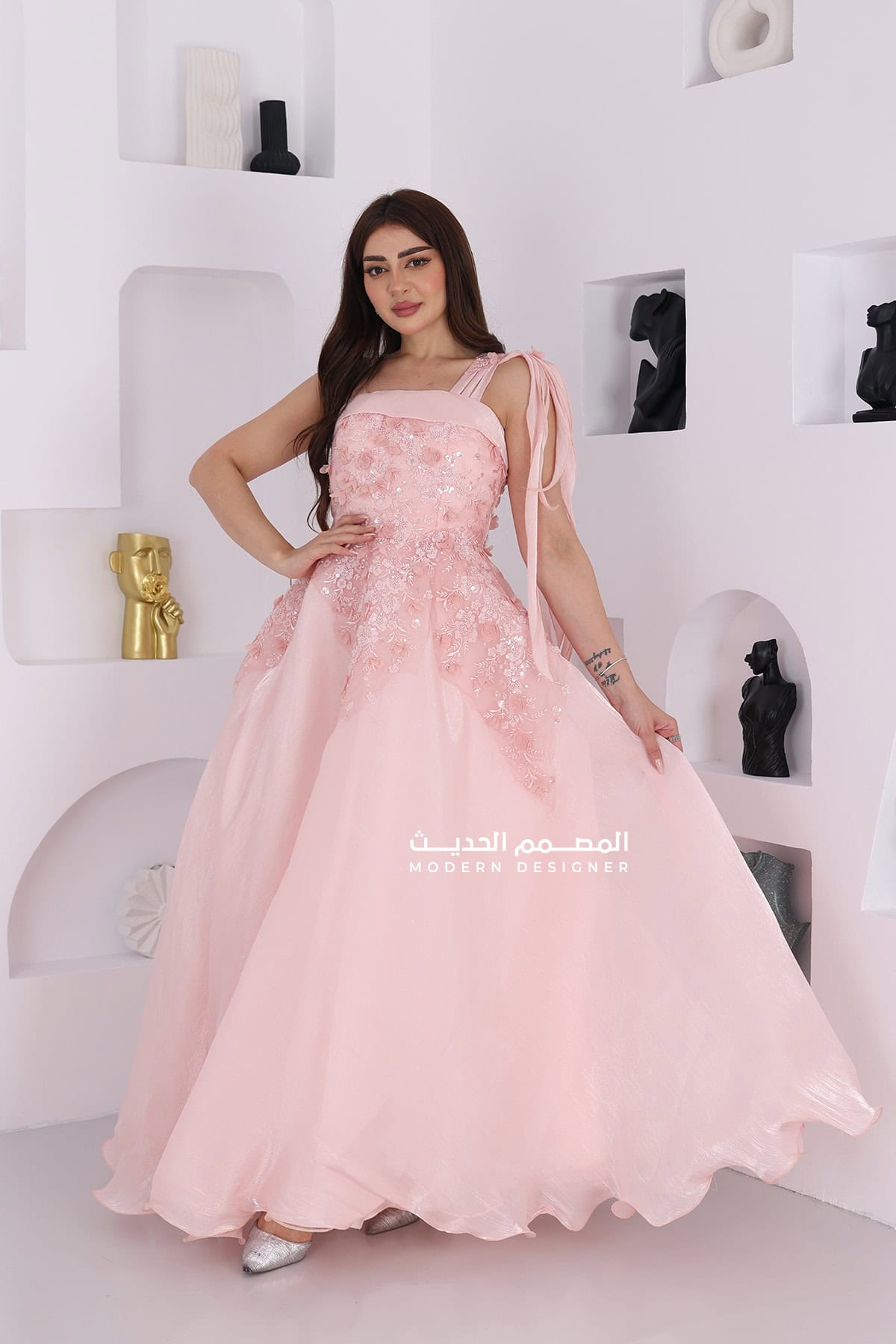 فستان سهرة بتطريز فخم على الصدر خامة الأورجانزا الفاخرة بفيونكة على شكل شرائح في الكتف ليبرز جمال التصميم يتميز بأناقته وفخامته. يبرز جمال التصميم ويضفي لمسة من الأنوثة والجاذبية. ستكونين محط الأنظار وتشعرين بالثقة والأناقة عند ارتداء هذا الفستان الجميل.