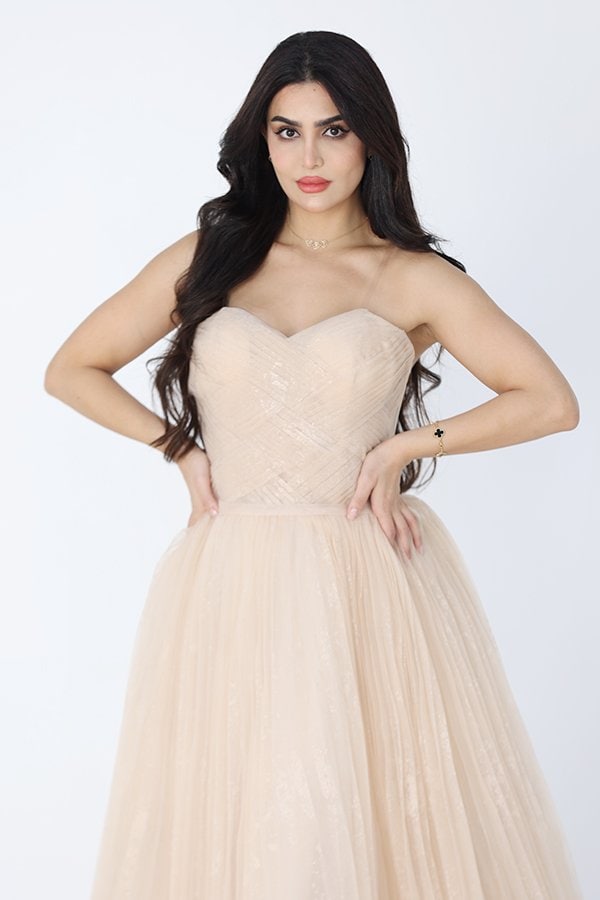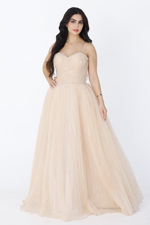 تألقي بإطلالة عصرية أنيقة مع فستان السهرة الطويل المنفوش الذي يتميز بتصميمه الرائع والجذاب. يتميز هذا الفستان بدون أكمام، مما يضيف لمسة من الأنوثة والنعومة، بينما تمنحك التفاصيل الجذابة لمسة من الفخامة والتميز.