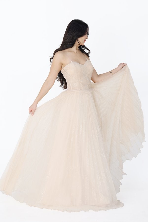التعامل بحذر: عند ارتداء وخلع الفستان، تجنبي السحب الشديد والتعامل الخشن الذي قد يؤدي إلى تلف الكريستالات والإكسسوارات.