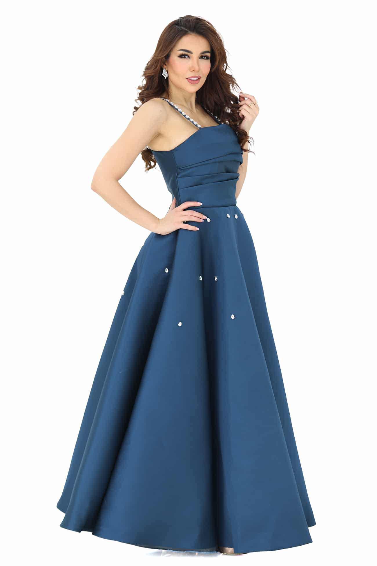 التخزين السليم: قومي بتخزين الفستان في مكان جاف ومنعزل عن الرطوبة للحفاظ على جمال الكريستالات والإكسسوارات.