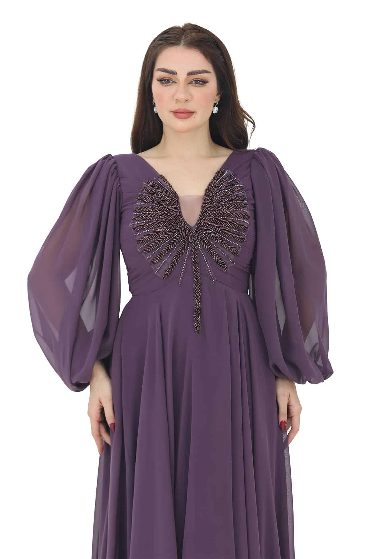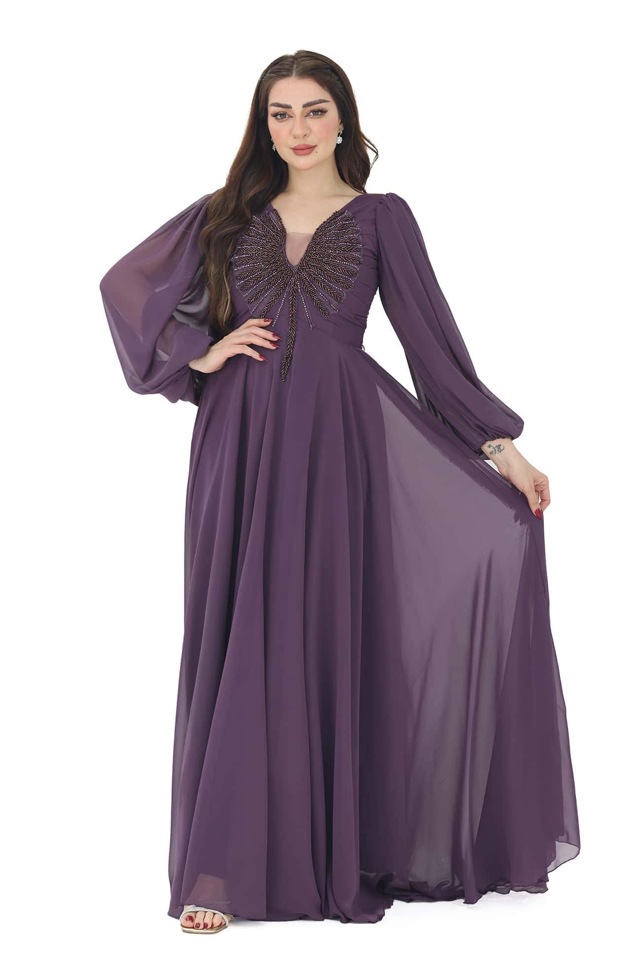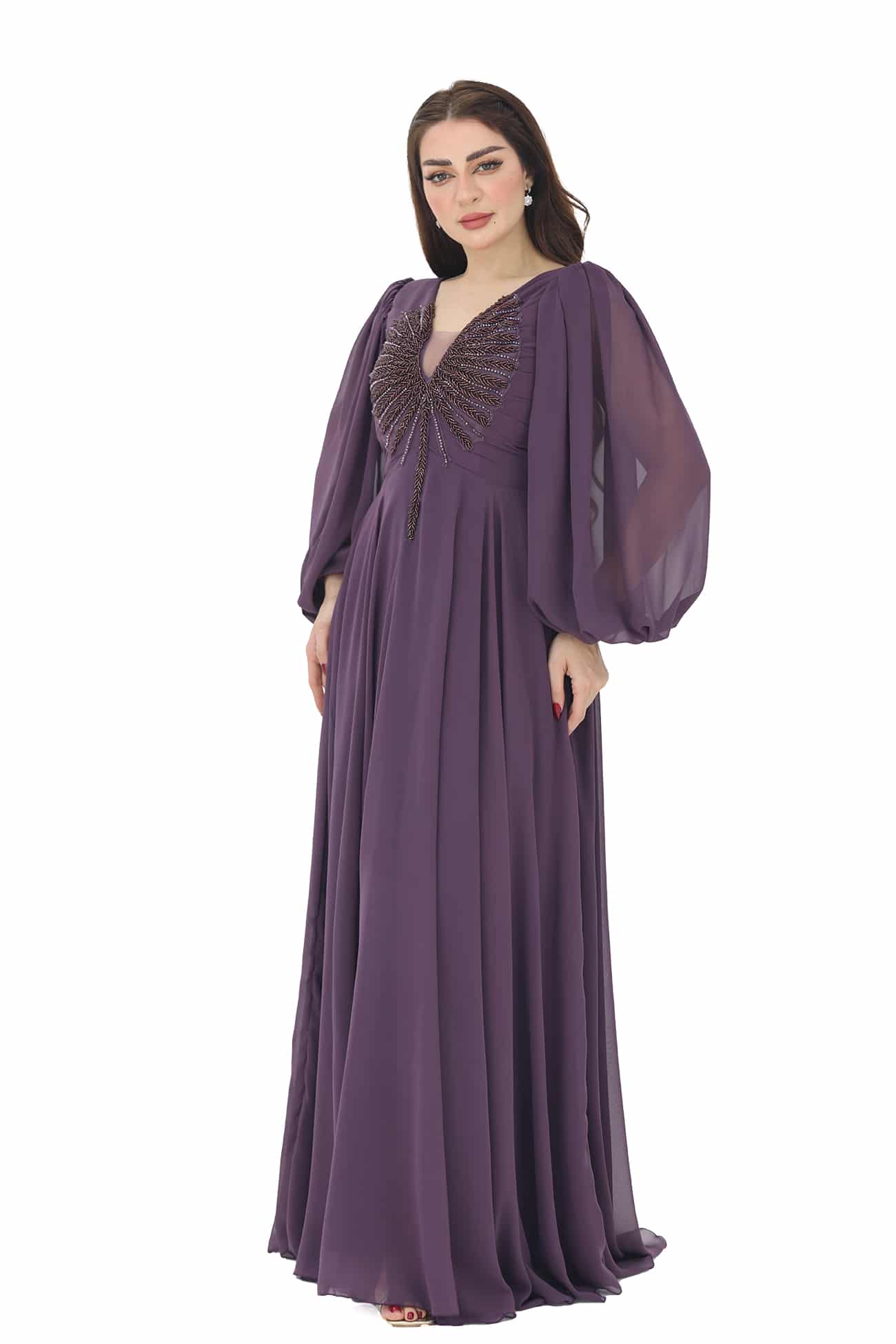 فستان سهرة كم طويل من خامة الشيفون بتطريز دائري على الصدر ليبرز جمال الصدر والتصميم بكسرات انيقة يجمع بين الأناقة والفخامة والراحة. ستبدين ساحرة ومتألقة بهذا الفستان في أي مناسبة سهرة خاصة. سوف تظهرين ساحرة ومشعة بالثقة بهذا الفستان في أي مناسبة سهرة خاصة أو حفلة