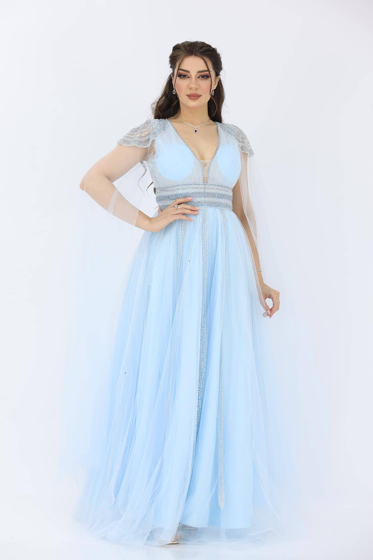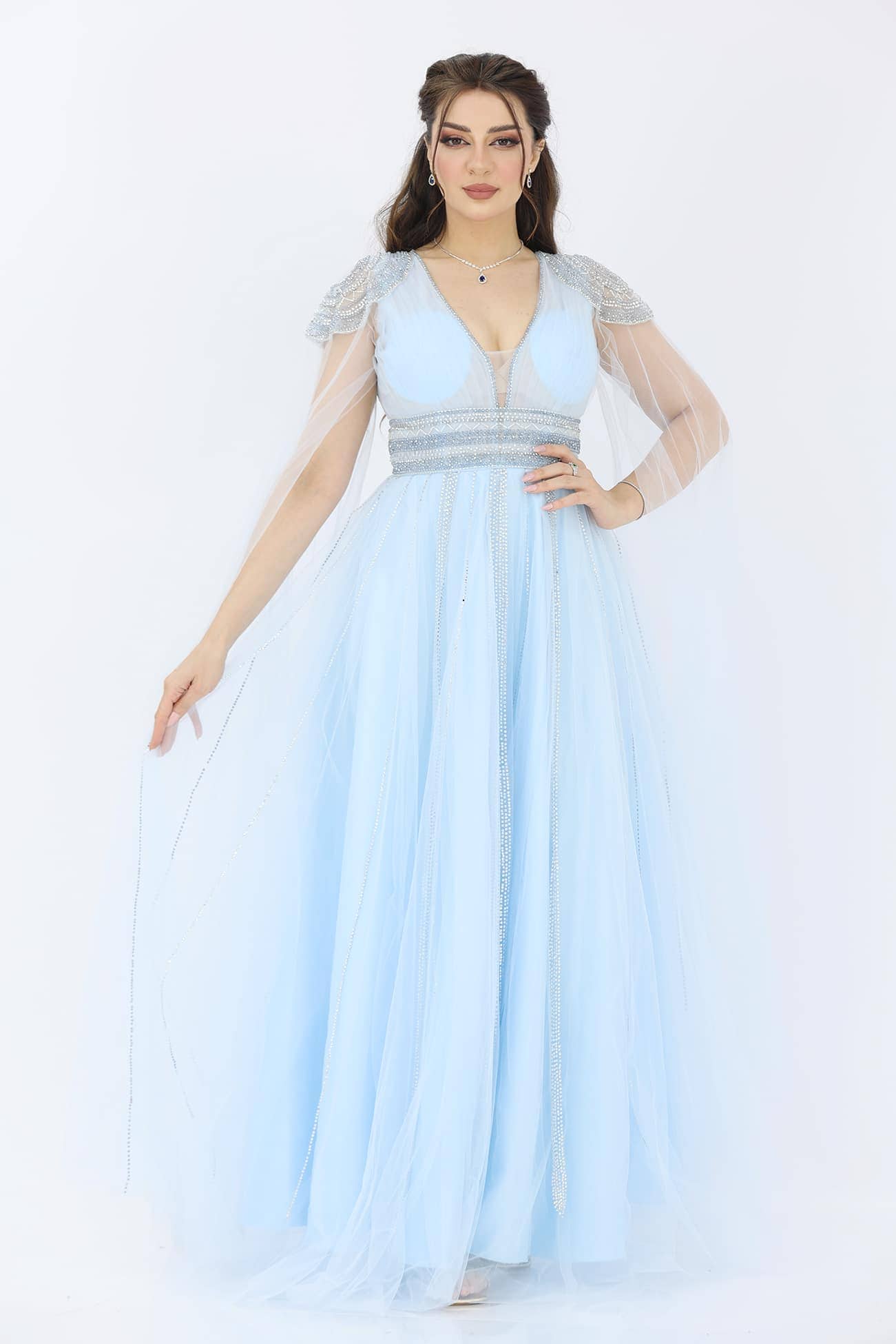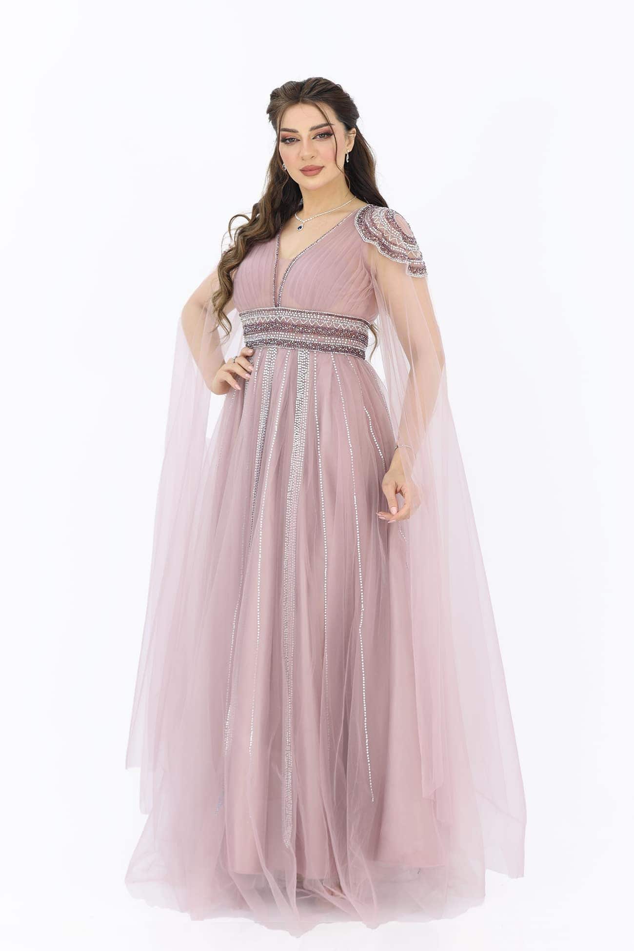 فستان سهرة تل فخم من خامة التل بتطريز يدوي انيق على الاكتاف والخصر قصة الصدرV يتوفر الفستان بلونين اللحمي والسماوي بأكمام طويلة بشرائط كرستال على التل ستكونين محط الأنظار في أي مناسبة راقية. تفاصيل التطريز اليدوي والتصميم الأنيق سيضيف عليك لمسة من الرقي والجمال. ستشعرين بالثقة والأناقة بارتداء هذا الفستان الساحر.