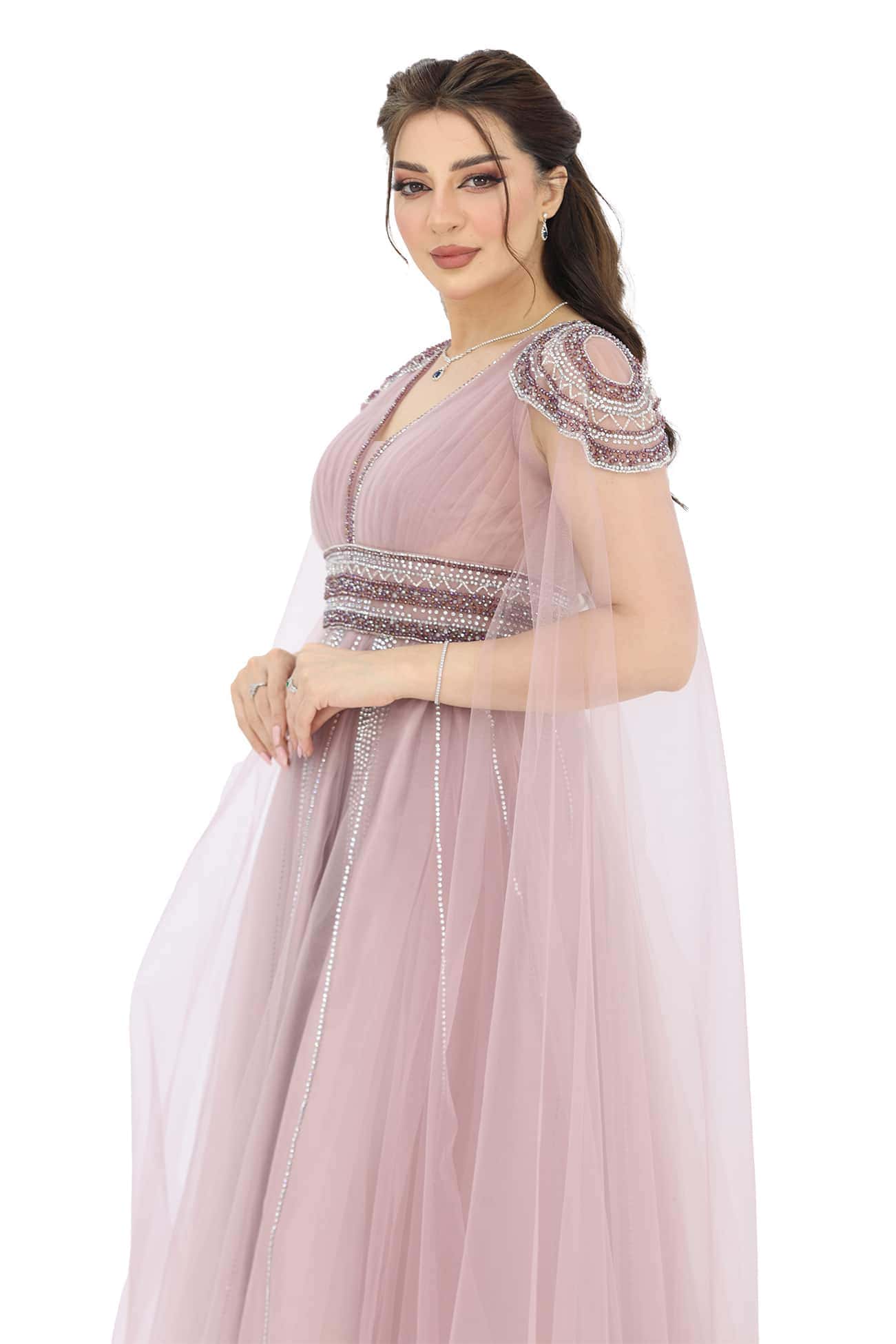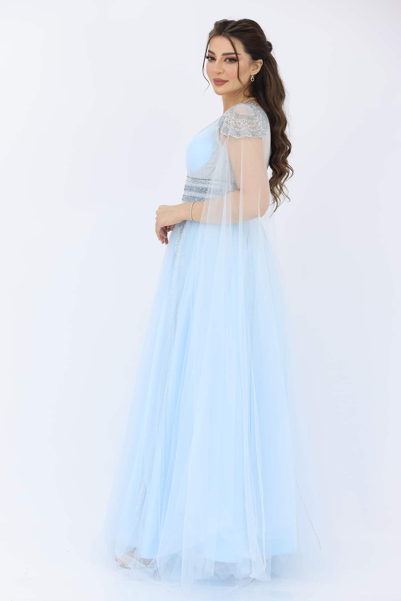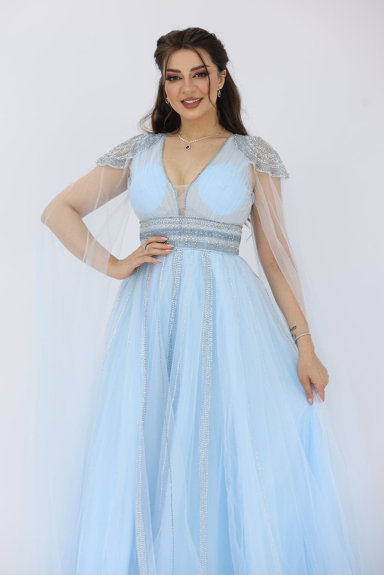 فستان سهرة تل فخم من خامة التل بتطريز يدوي انيق على الاكتاف والخصر قصة الصدرV يتوفر الفستان بلونين اللحمي والسماوي بأكمام طويلة بشرائط كرستال على التل ستكونين محط الأنظار في أي مناسبة راقية. تفاصيل التطريز اليدوي والتصميم الأنيق سيضيف عليك لمسة من الرقي والجمال. ستشعرين بالثقة والأناقة بارتداء هذا الفستان الساحر.