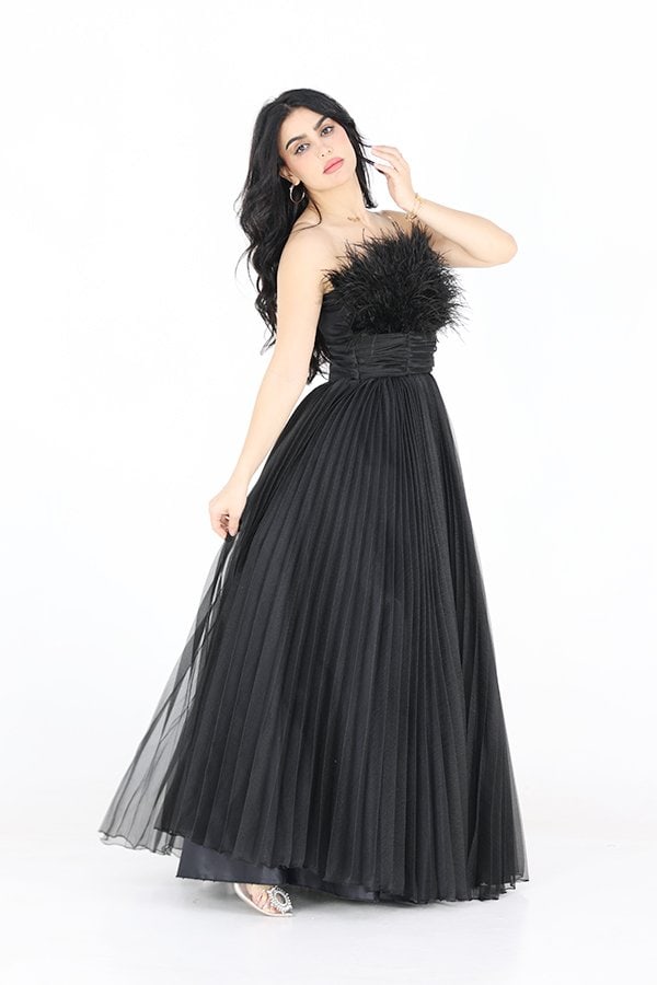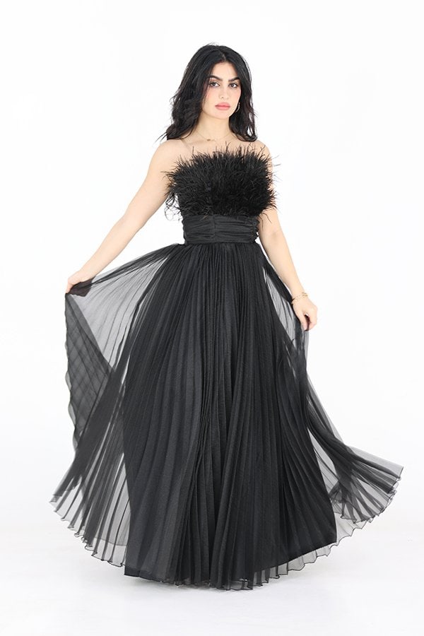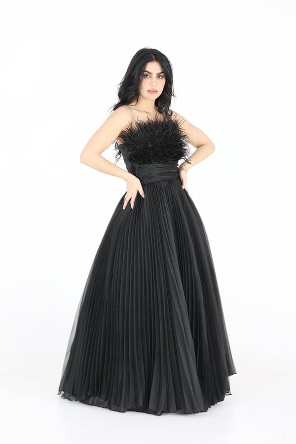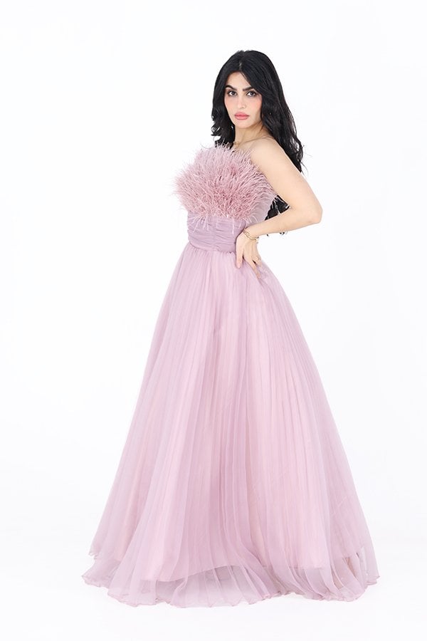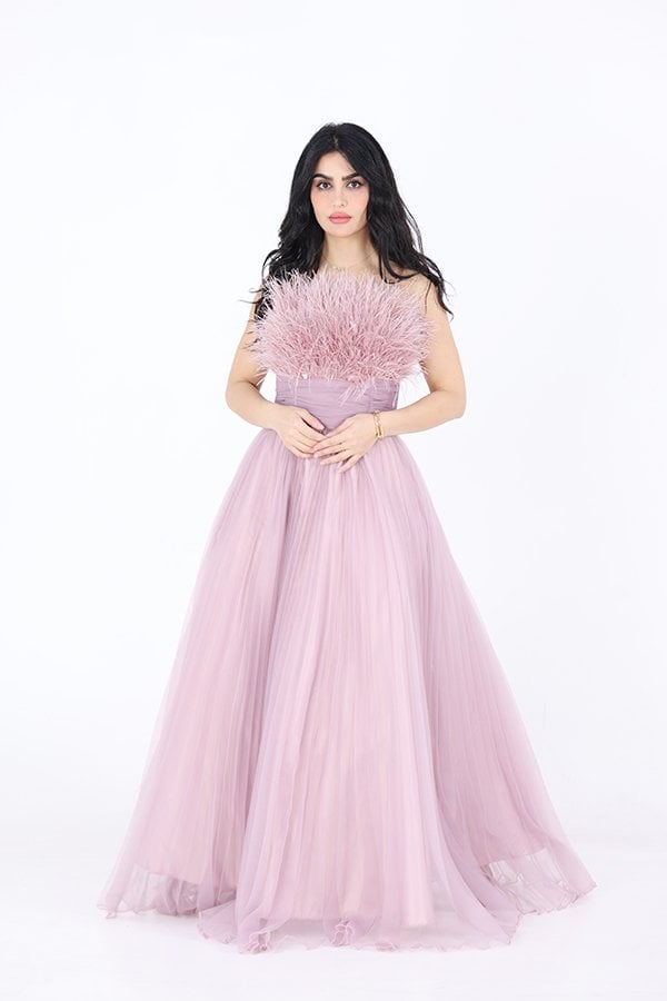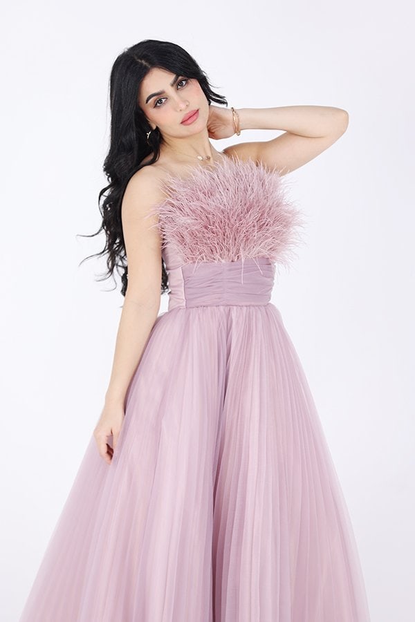 التفاصيل الدقيقة في الفستان تجعل منه قطعة فنية متكاملة، حيث يتميز بتزيينه بريش ناعم يمتد من أعلى الصدر ليضيف لمسة من الحركة والحيوية. هذه الريشات تتناغم بشكل رائع مع تصميم الفستان، مما يجعل الإطلالة تبدو أكثر حيوية وملفتة للأنظار. الريش يساهم في إبراز أنوثة التصميم ويمنح الفستان طابعًا دراميًا يعكس الرقي والفخامة.