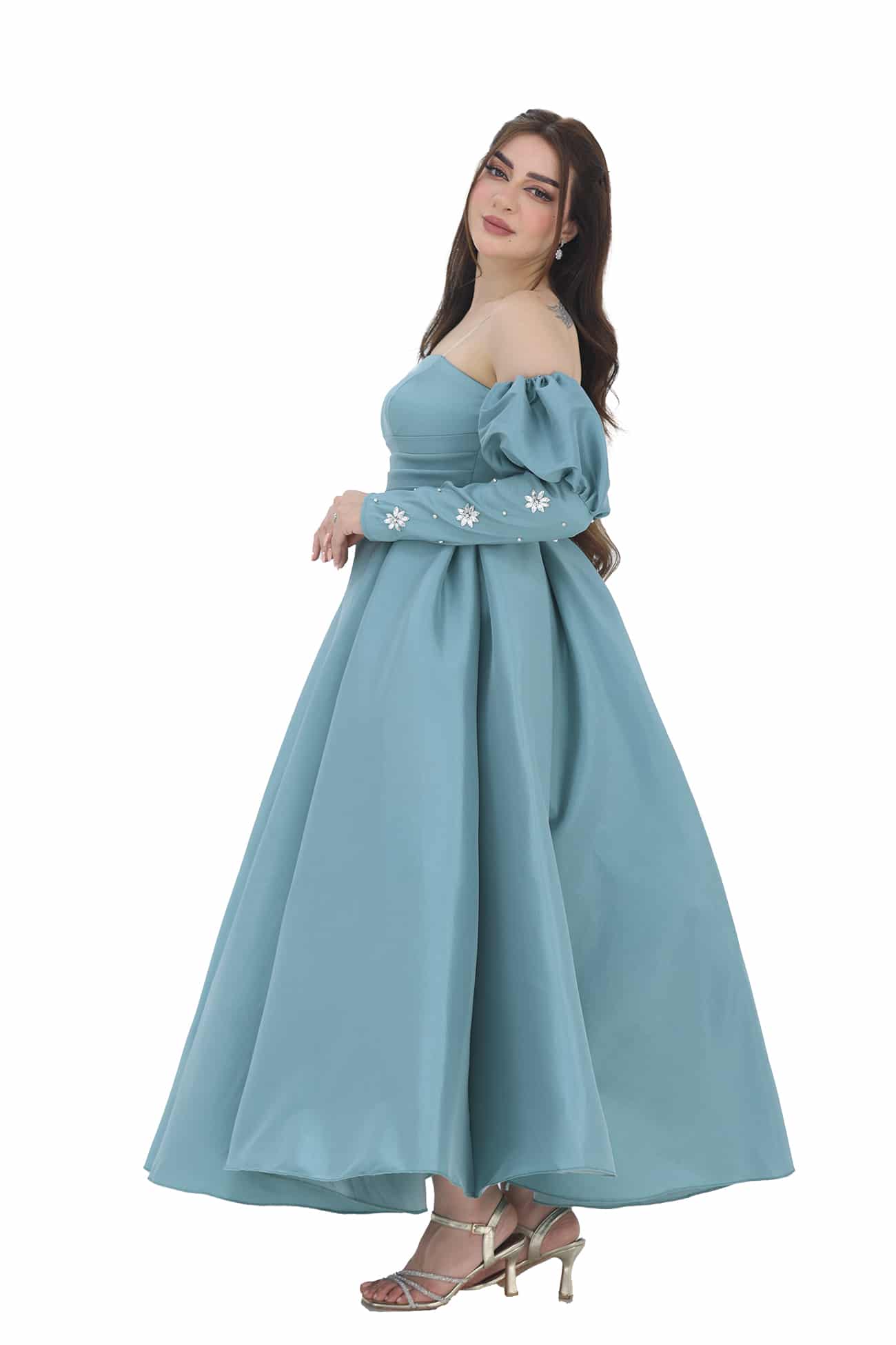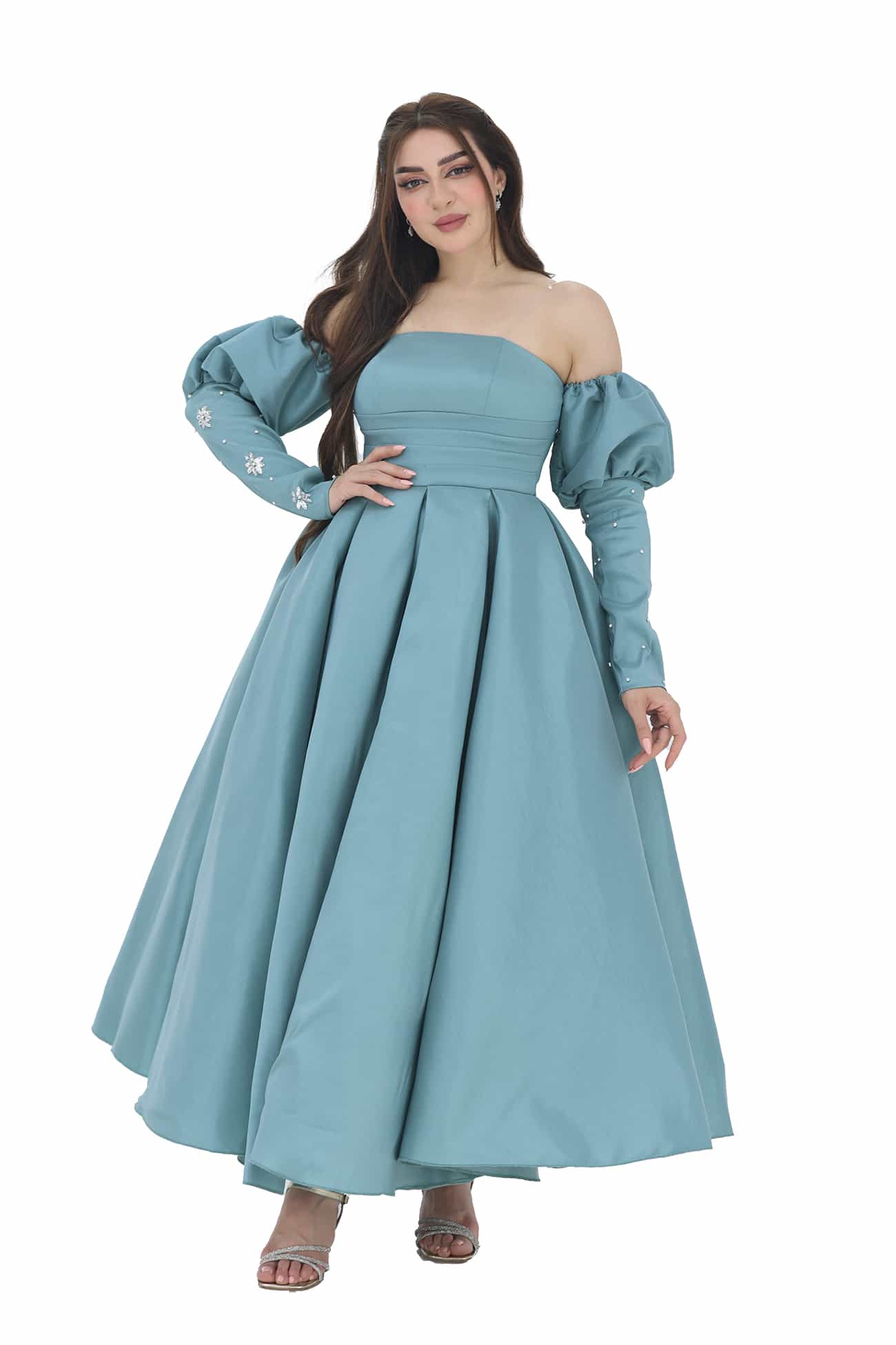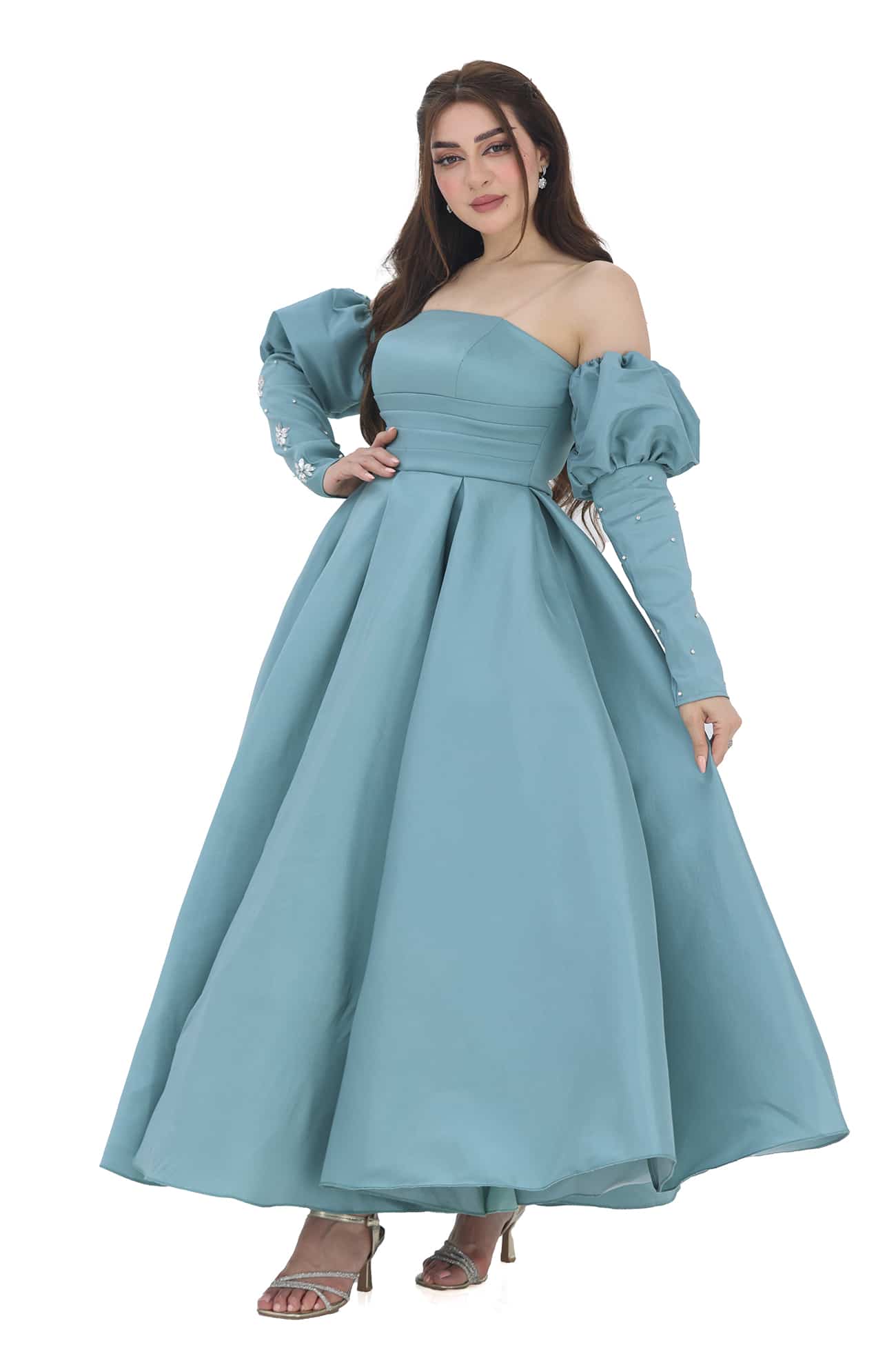 فستان سهرة تيفاني بأكمام طويلة من خامة الميكادو يأتي الفستان بأكمام طويله منتفخة من الكتف يتميز الفستان بكسرات انيقة تبدو بجمال بالفستان قطعة فريدة وساحرة تضفي عليك جاذبية وأناقة في المناسبات الخاصة والسهرات.