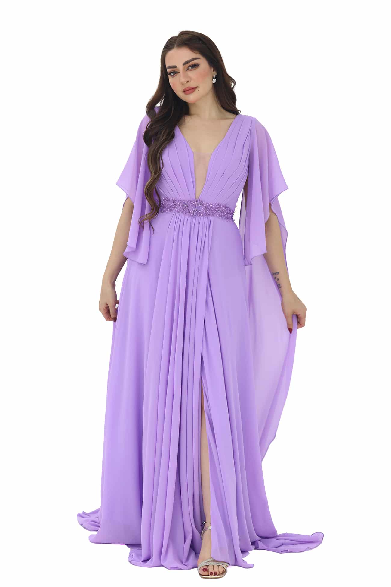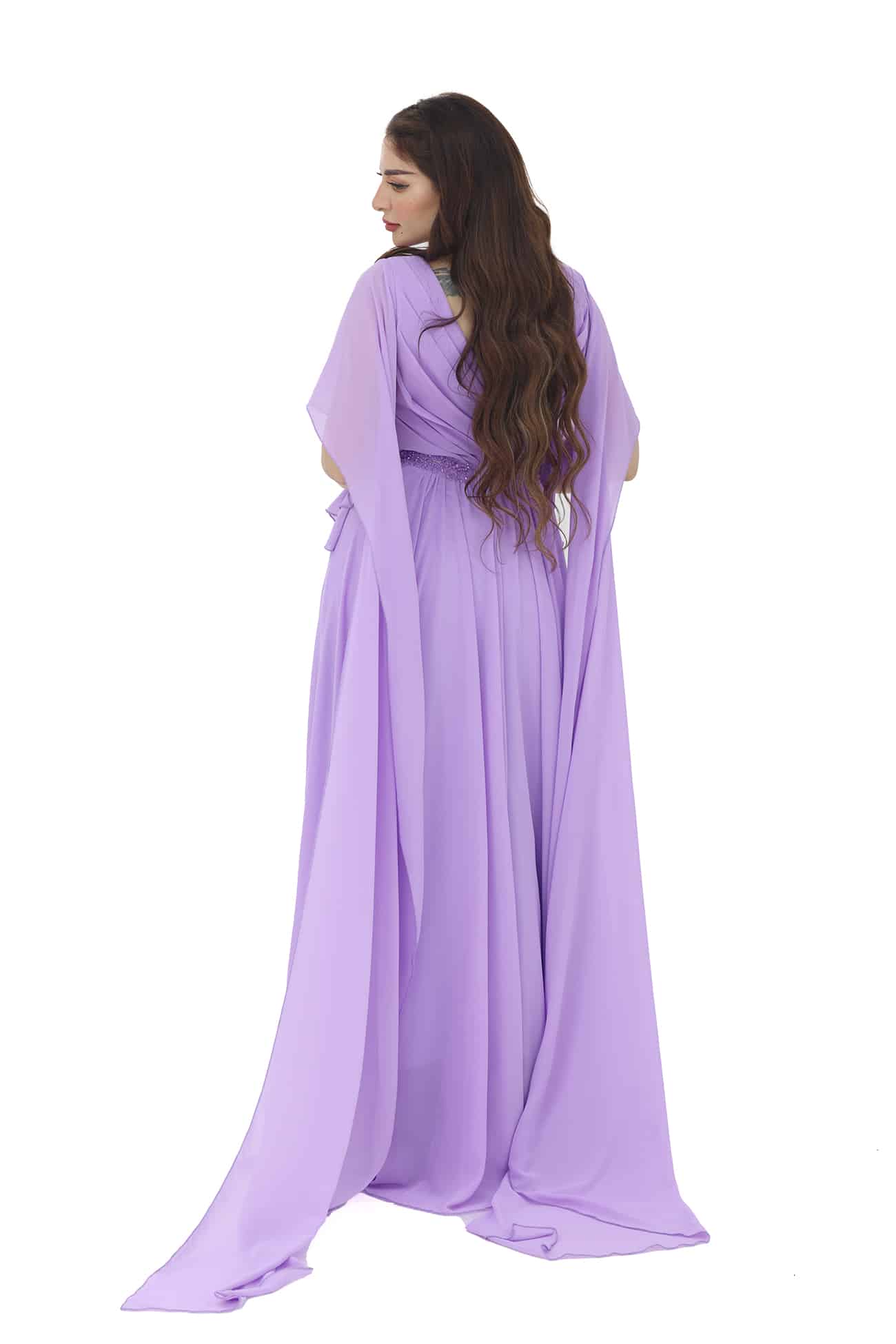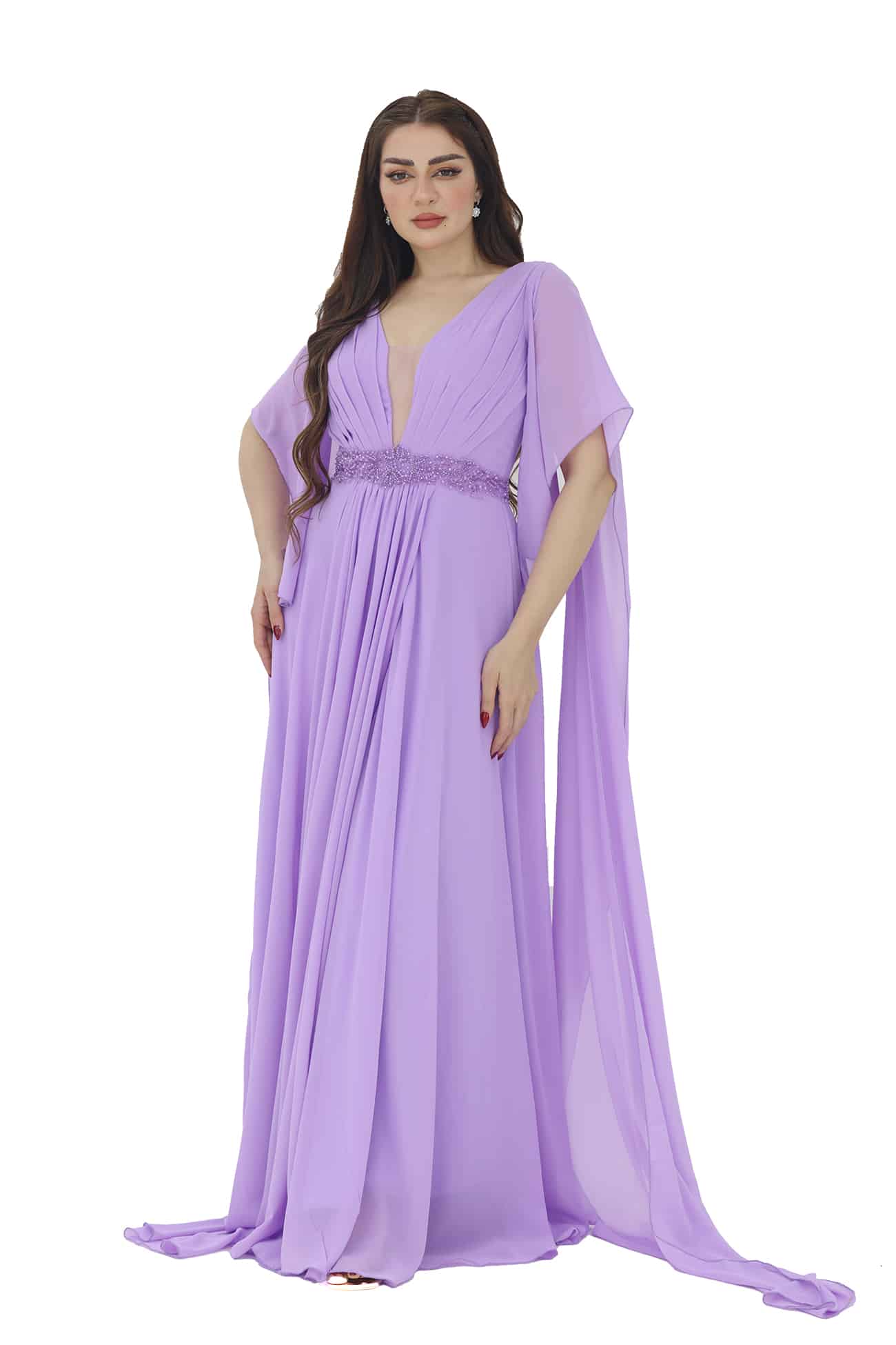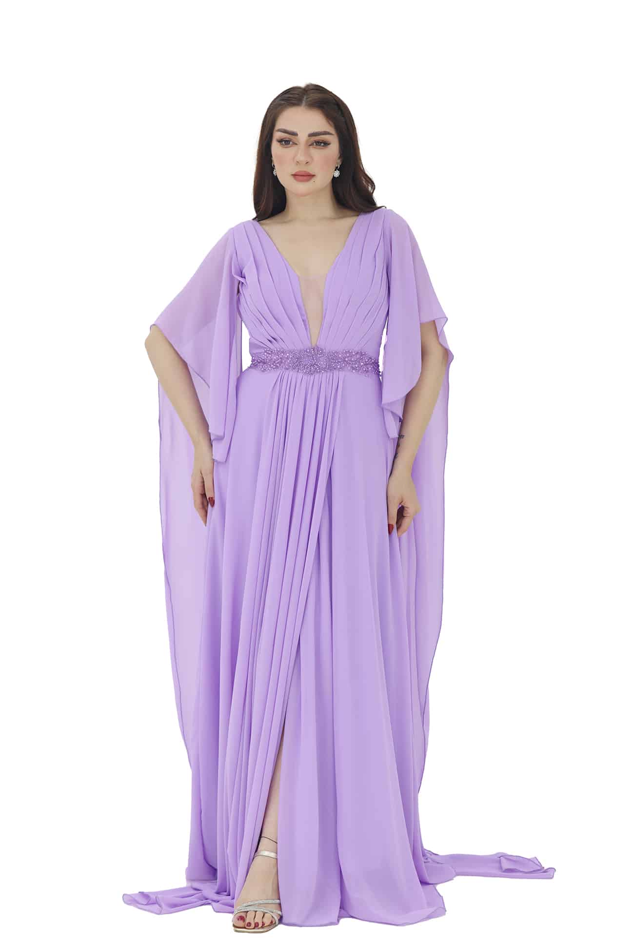فستان سهرة راقي بأكمام شال من خامة الشيفون بتصميم حديث فخم بأكمام طويلة بطرحة خلفيه طويلة بتطريز انيق في الصدر خيار رائع للمناسبات الرسمية والسهرات الخاصة. ستشعرين بالأناقة والسحر عند ارتداء هذا الفستان حيث ستلفتين الأنظار بجاذبيتك وأناقتك اللافتة يتميز الفستان بتصميم عصري وفاخر، مما يعطيك مظهرًا متألقًا ومميزًا في المناسبات الرسمية والسهرات الخاصة. تفاصيل الأكمام تضيف لمسة رقيقة وأنيقة إلى الفستان، وتساهم في خلق مظهر مذهل وجميل.تعزز الأناقة والسحر العام للفستان، وتضفي لمسة من الجاذبية والأنوثة عندما تتحرك.