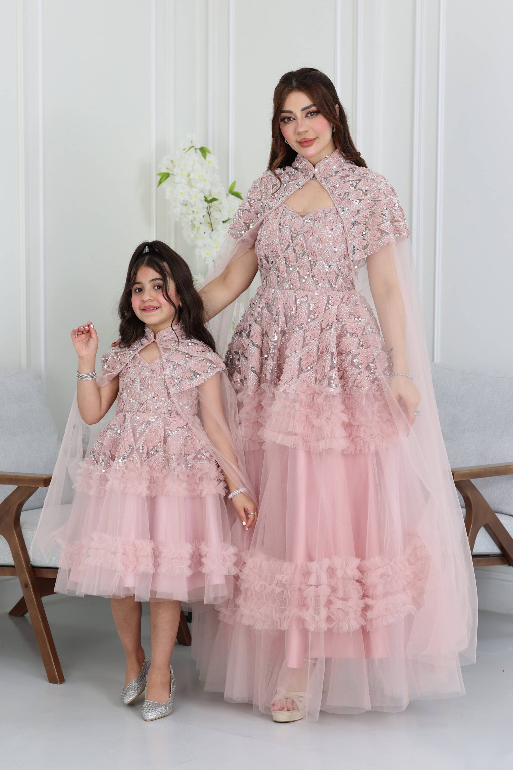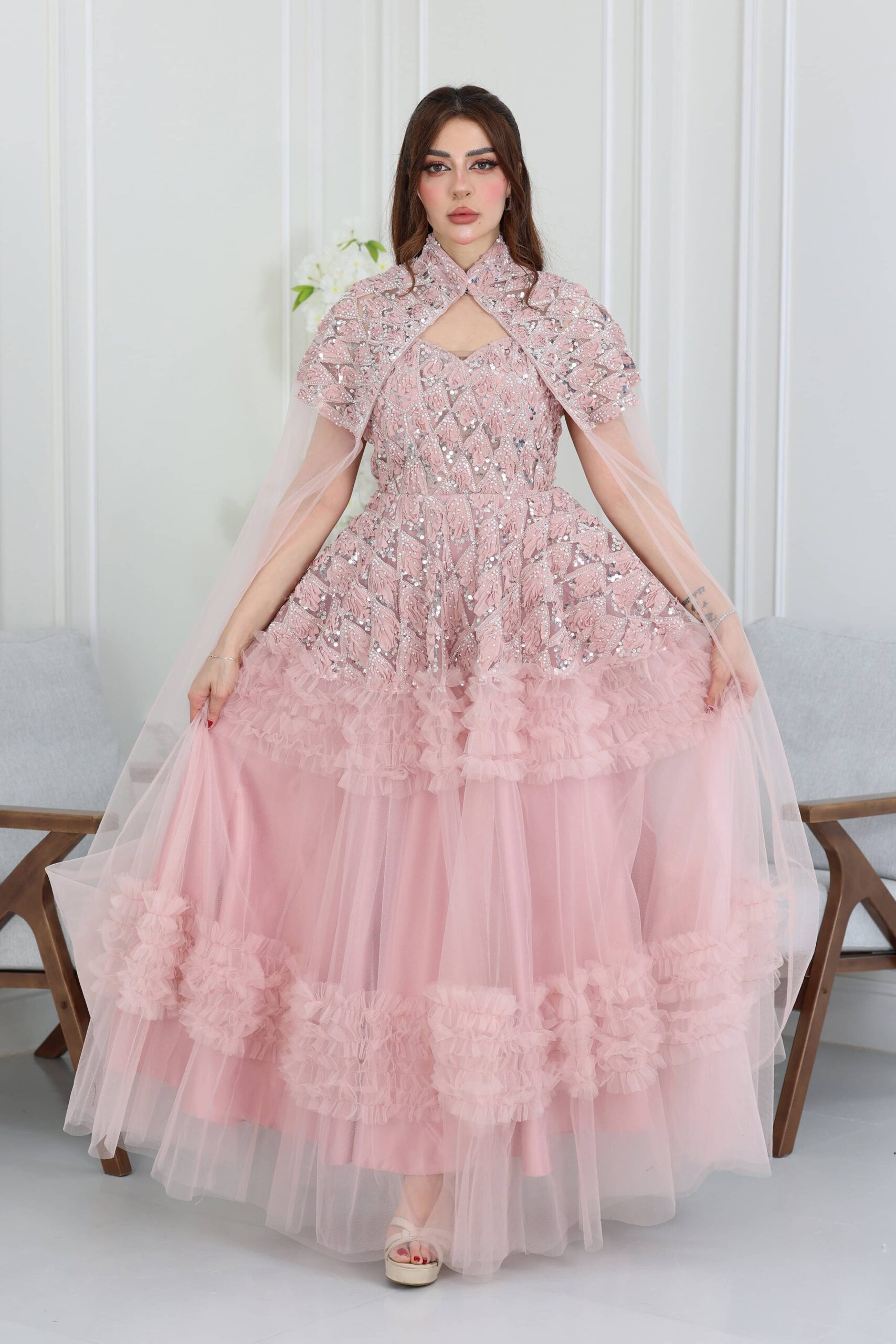 فستان سهرة شك فاخر بتصميم يتميز بـ تطريز شك يدوي على كامل الصدر والخصر، وهذا الشغل المتقن مع اللمعة الخفيفة هي اللي تخلي الفستان قطعة فنية. الموديل طويل ومكون من طبقات تل مكشكش، ويبرز جماله بياقة عالية، يمنحك تغطية راقية وطلّة محتشمة وجذابة. تنورة الفستان بقصة واسعة وطبقات من التل، وهذا يعطيه فخامة وحجم مميز. هذا الموديل الأنيق من المصمم الحديث يضمن لك تميزاً وجاذبية في أي سهرة، الأكثر طلباً. اطلبيه الآن قبل ما تخلص الكمية