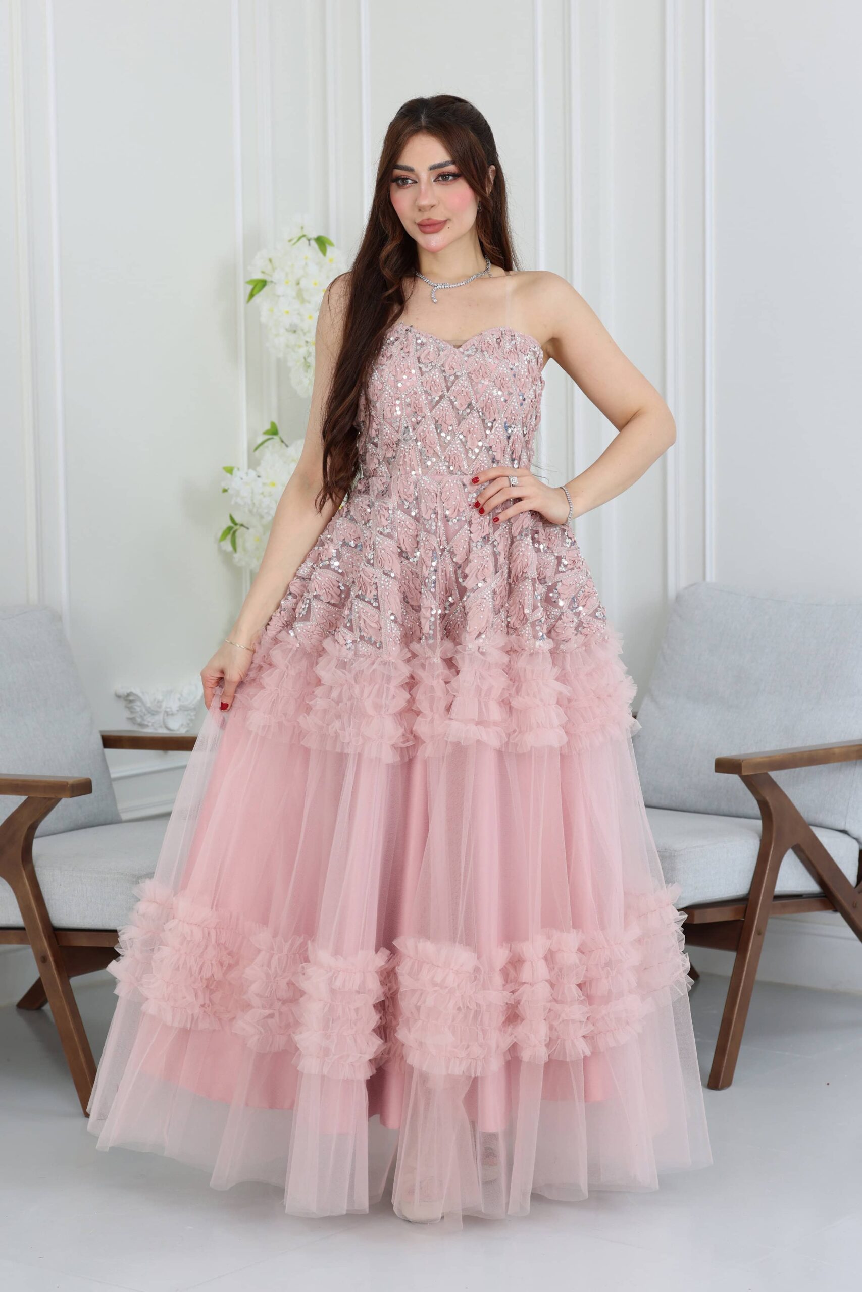التعامل بحذر: عند ارتداء وخلع الفستان، تجنبي السحب الشديد والتعامل الخشن الذي قد يؤدي إلى تلف الكريستالات والإكسسوارات.