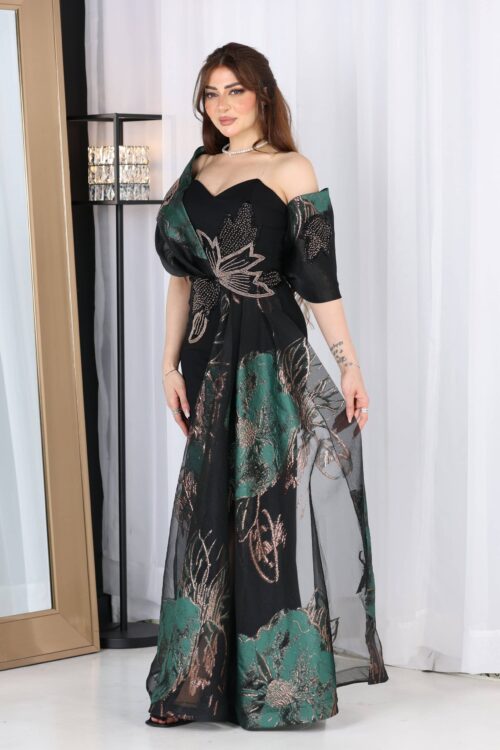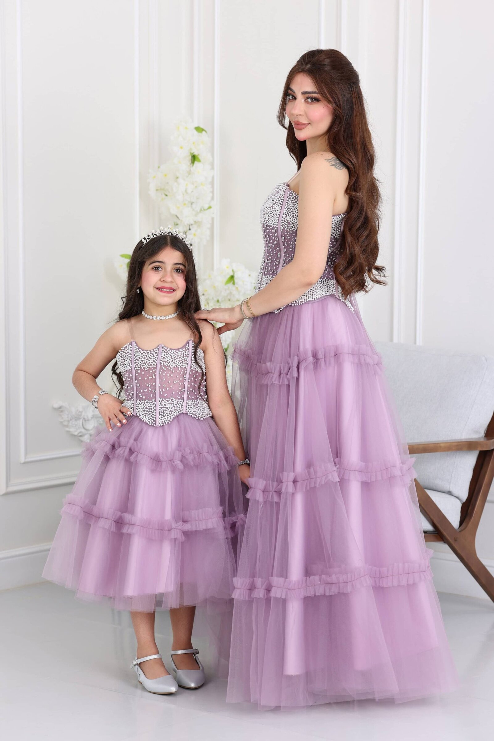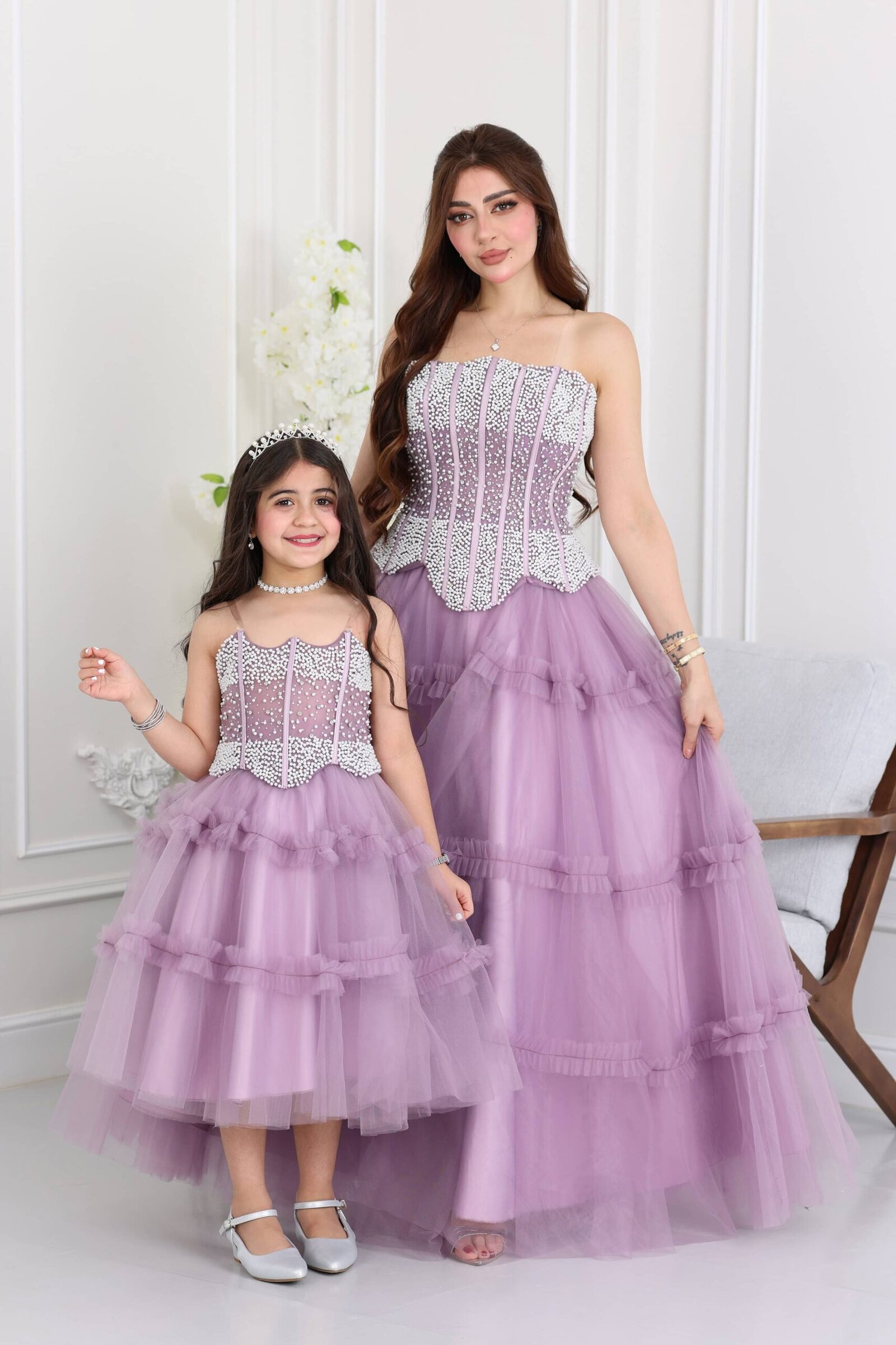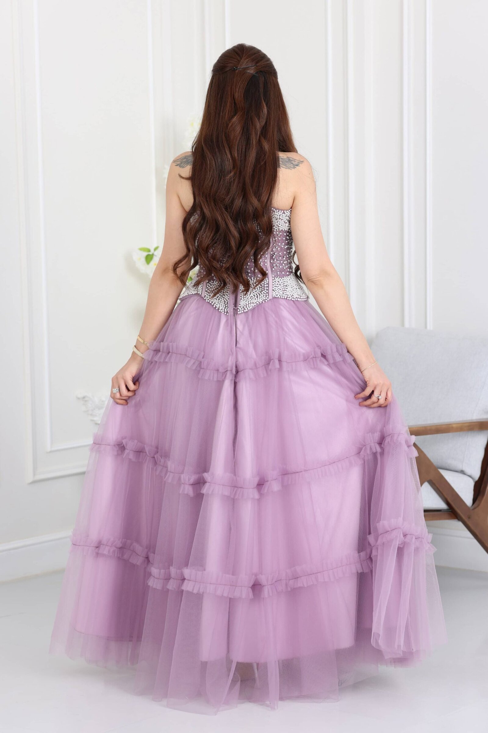 فستان سهرة طبقات تل بتصميم يركز على الفخامة والأناقة الباهرة. يتميز الجزء العلوي (التوب) بزخرفة كاملة بالشك البراق والخرز الفاخر، وهذا يضمن لكِ جاذبية وبريقاً يلفت الأنظار تحت الأضواء. الفستان طويل وبقصة أنيقة بدون أكمام، تمنحك إطلالة أنثوية راقية.الفخامة تتركز في التنورة الطويلة المصممة من طبقات تل مكشكشة ضخمة ومنفوشة، وهذا يعطي الفستان حجماً ملكياً وحركة ساحرة أثناء المشي والرقص. القصة مخصرة في الأعلى وتنسدل بفخامة، مما يجعله من أفخم فساتين السهرة