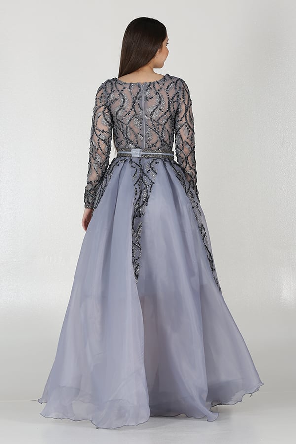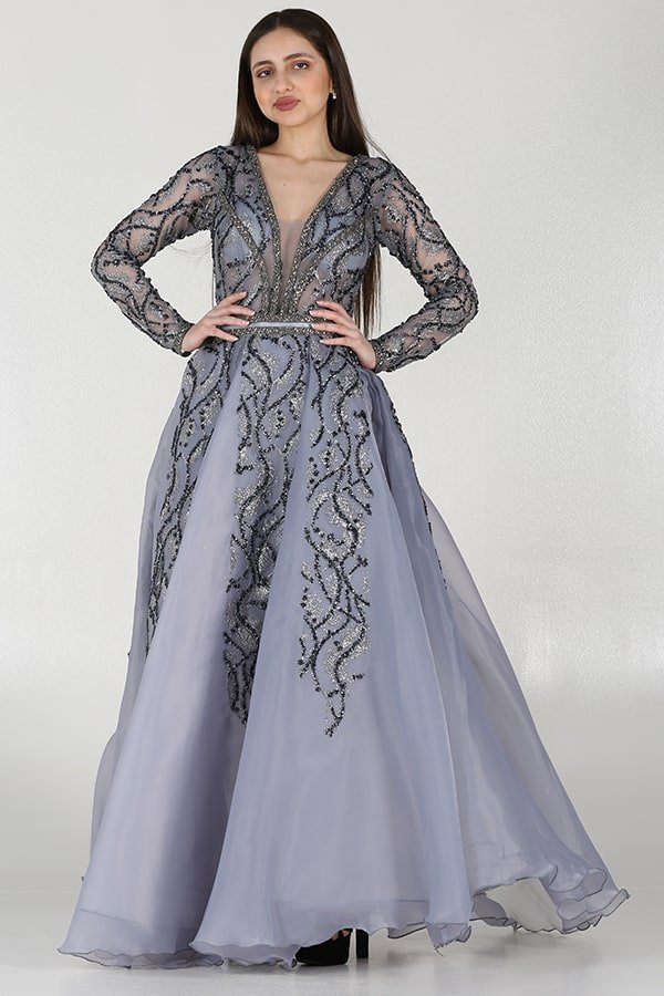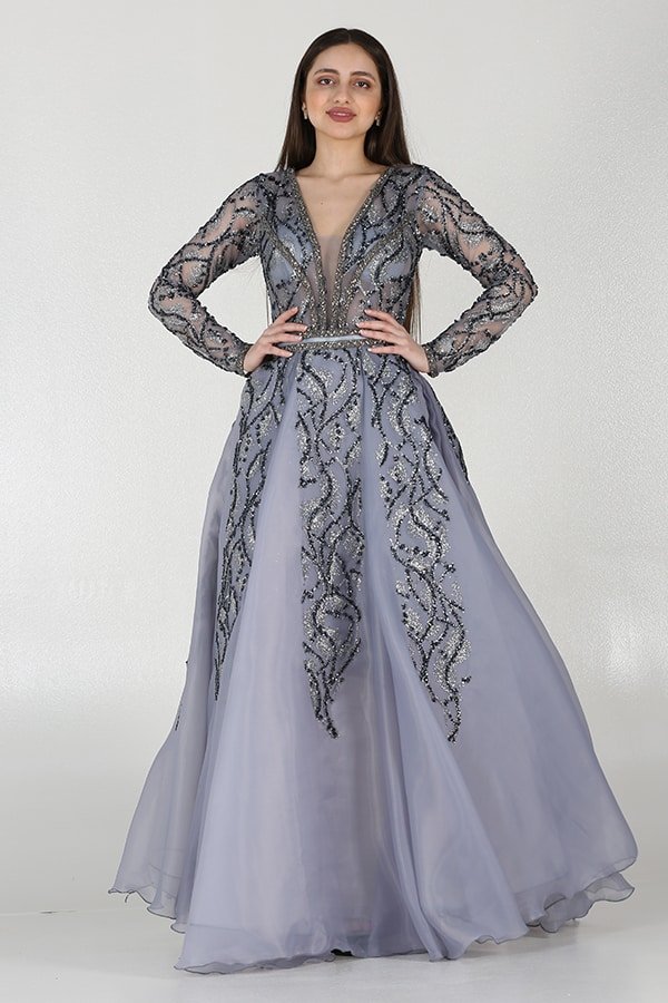 فستان سهرة طويل رصاصي من خامة الأورقنزا، مميز بأكمام طويلة مزمومة ومطرز بشكل احترافي، ومزين بحزام أنيق في الخصر وقصة كلوش، هوبهذه المميزات، ستكونين رائعة في المناسبات الرسمية والسهرات الأنيقة.