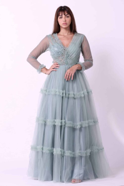 فستان سهرة فاخر يتميز الفستان بتطريز فخم مما يضفه لمسة من الاناقة والفخامة ليعطيك مظهرا انيقا حيث ان الفستان صنع تحت أيادي أفضل المصممين لكي يعطيك أفضل اطلاله وأناقة في جميع المناسبات والحفلات الخاصة والعامة