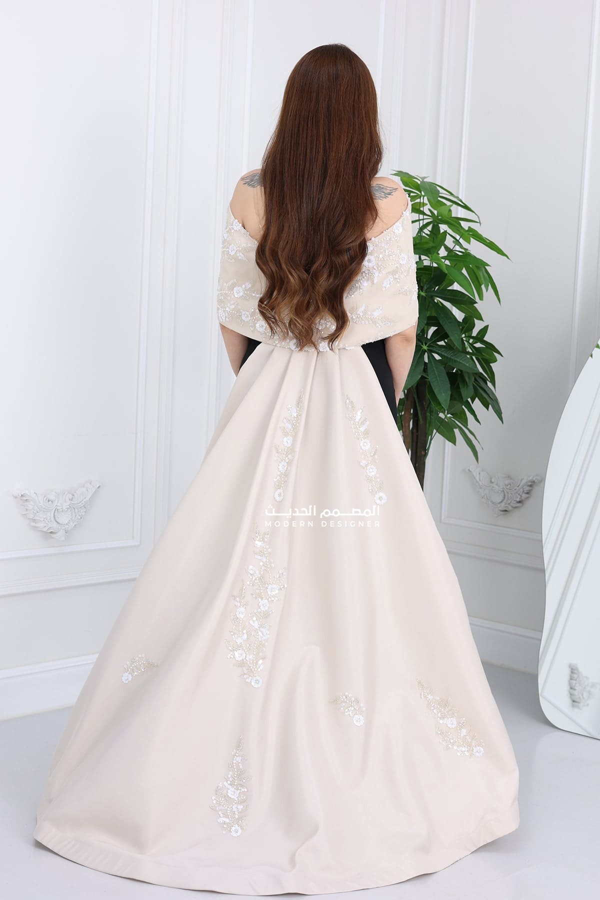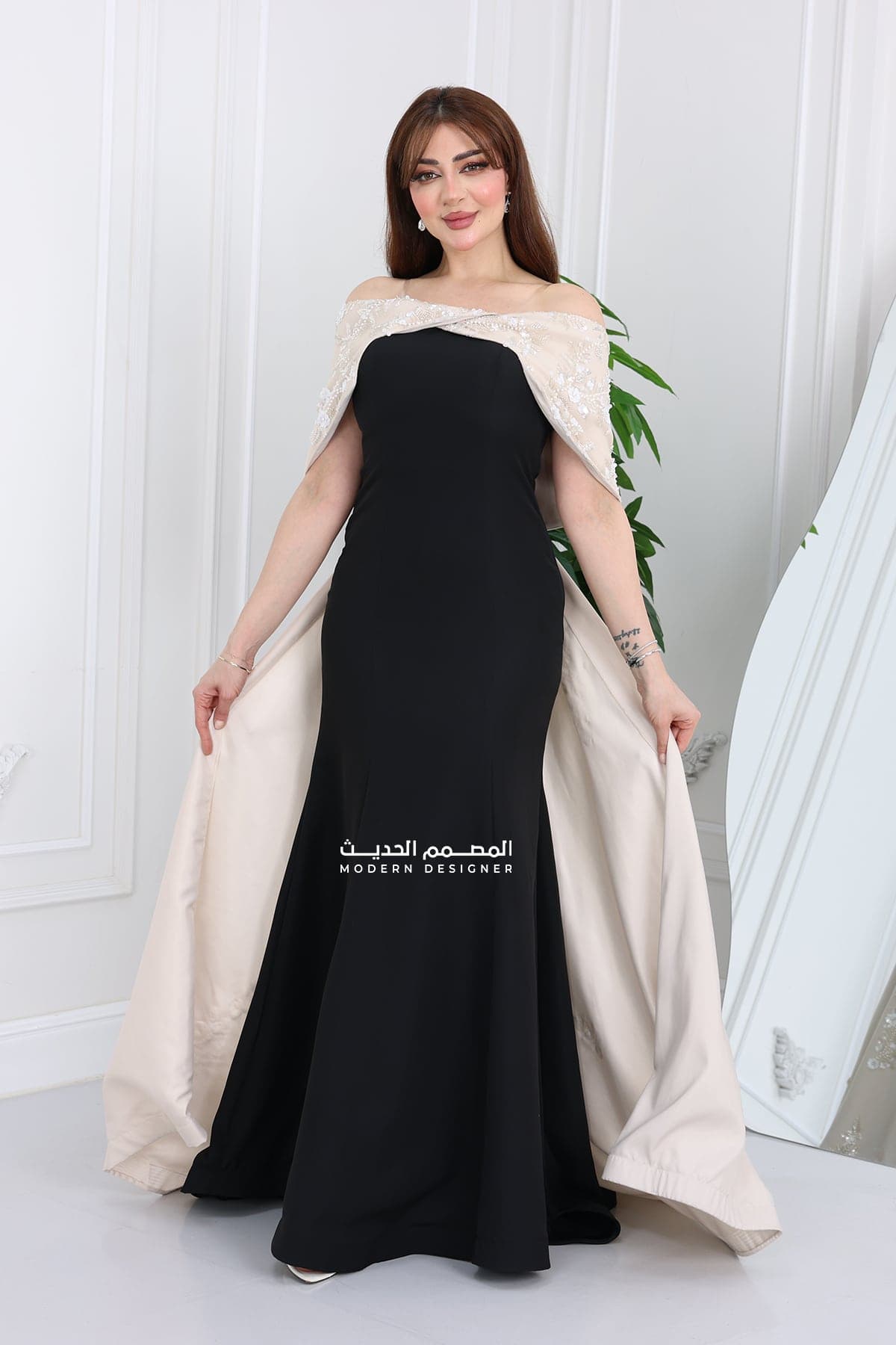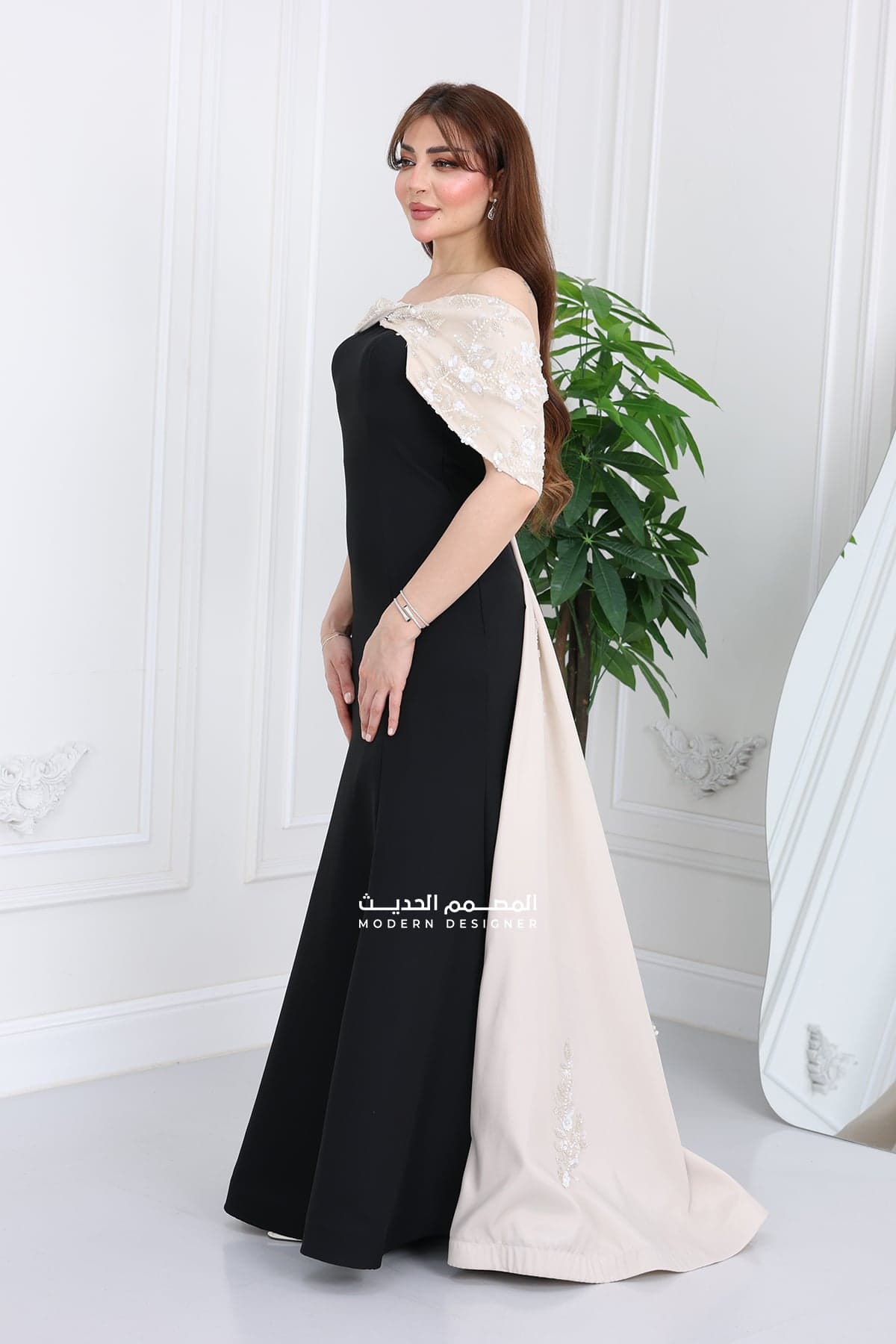 فستان سهرة فخم للمناسبات مصنوع من خامة كريب فاخرة، خفيفة وأنيقة بنفس الوقت. يتميز بتصميم أوف شولدر أنثوي يبرز جمال الأكتاف بأسلوب راقي وجذاب. الفستان باللون الأسود الكلاسيكي اللي يناسب جميع المناسبات الرسمية والخاصة، مع ذيل خلفي مطرز باللون البيج الفخم يعطيك لمسة ملكية لا مثيل لها! فستان مناسبات مثالي لكل اللي يدورون على إطلالة أنيقة وفخمة سواء لزواجات، ملكات، حفلات أو سهرات خاصة. تصميمه العصري مع تفاصيله الدقيقة يضمن لكِ الظهور بإطلالة تسرق الأضواء بكل خطوة. بتصميم يناسب ذوق المرأة السعودية العصرية اللي تحب التميز والرقي.