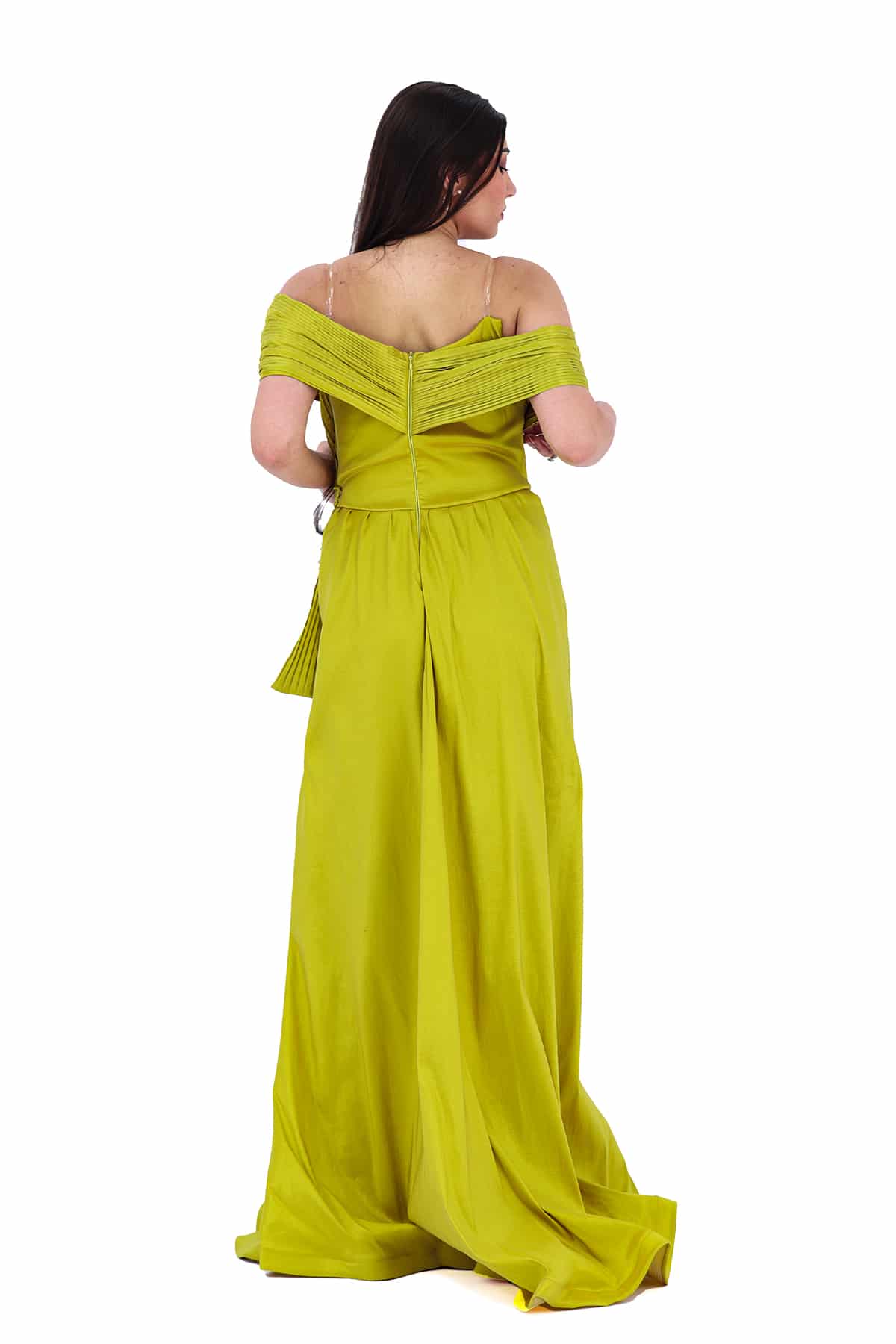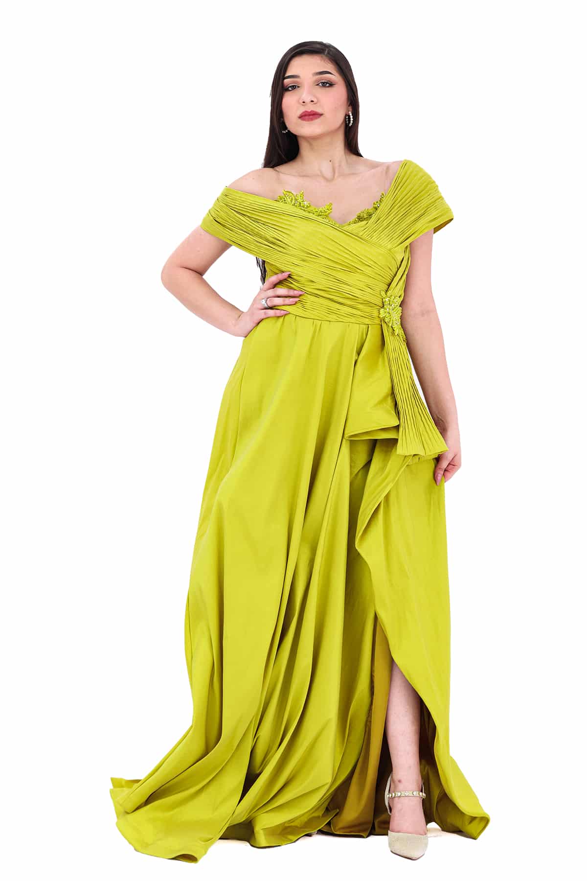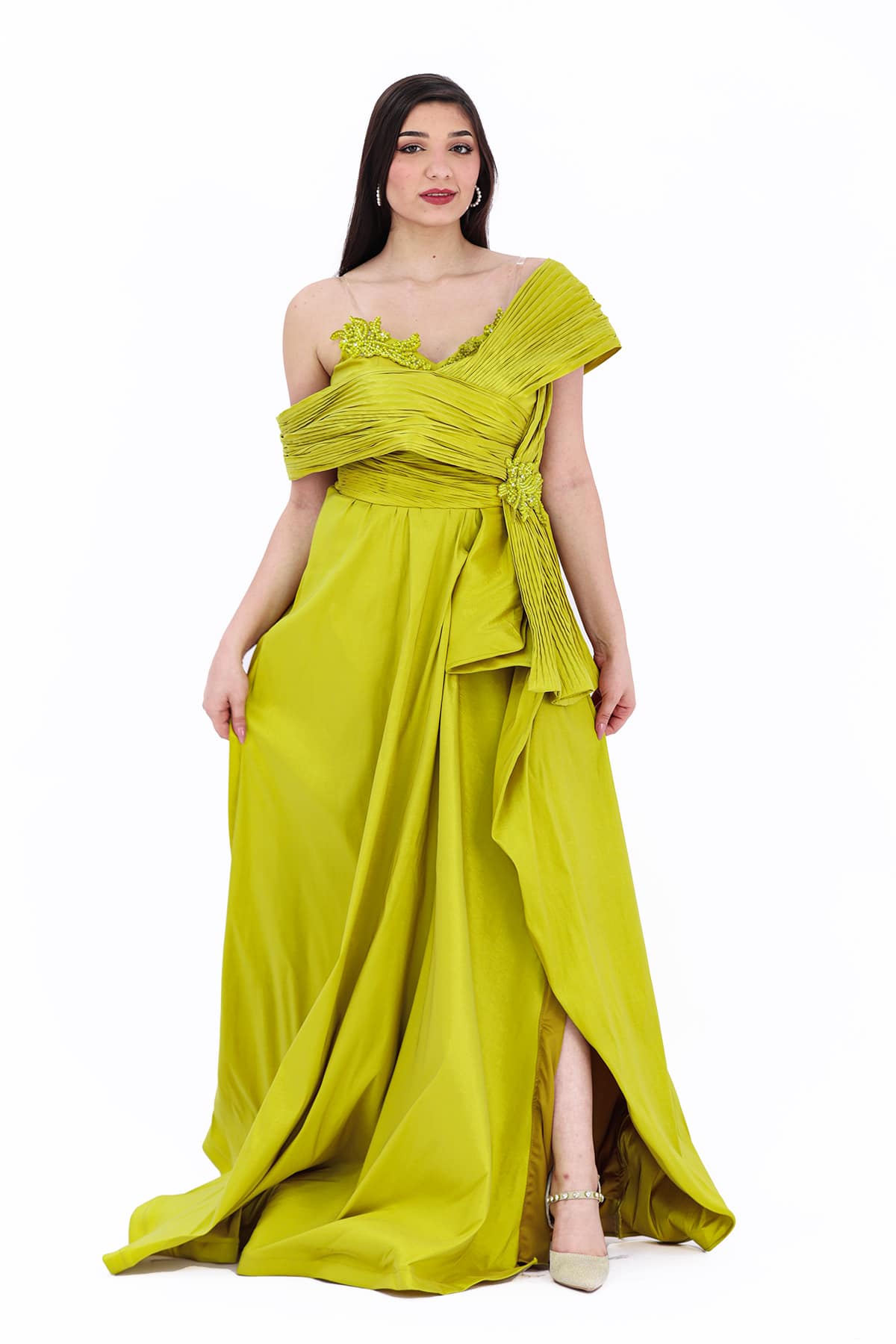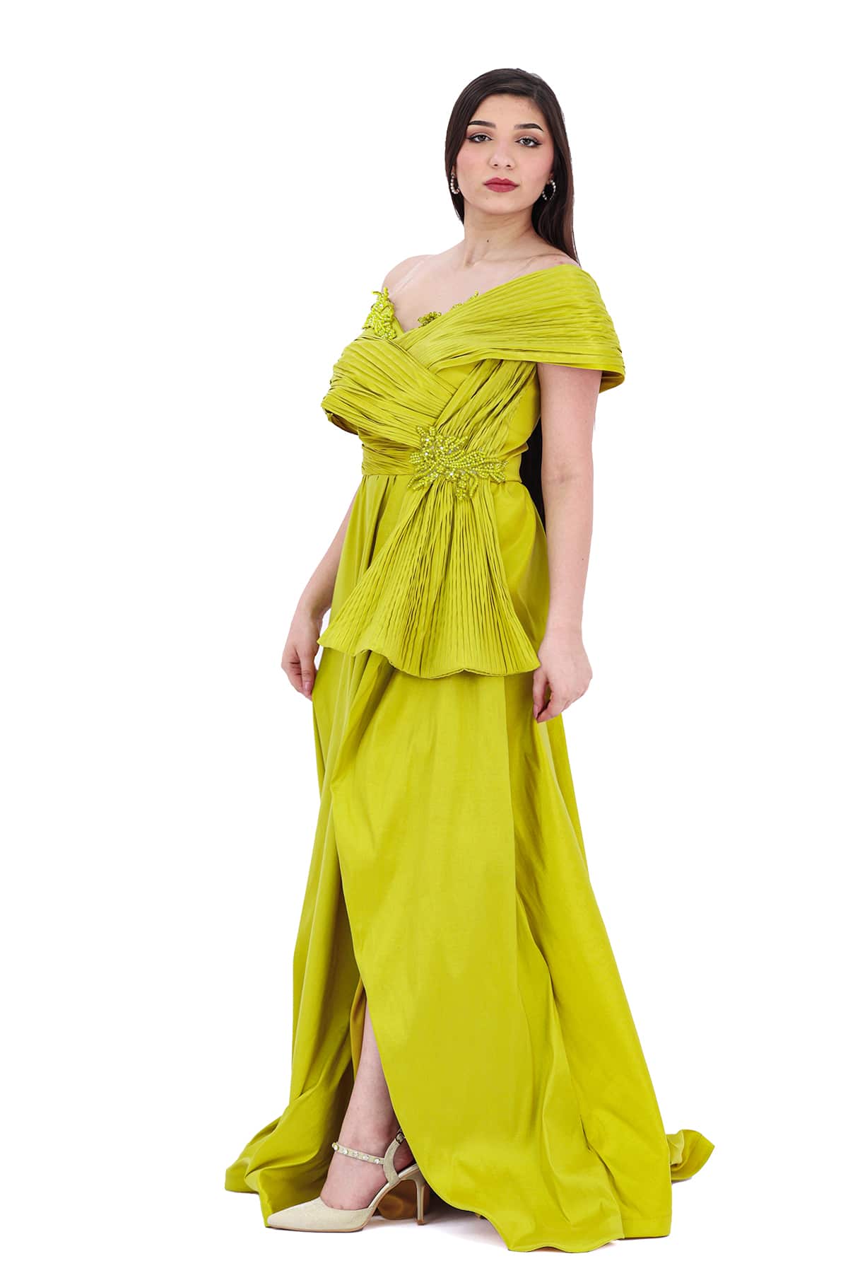 فستان سهرة كموني بتصميم روماني انيق بتطريز جانبي من خامة فاخرة لمزيد من الاناقة تصميم حديث وتطريز راقي يعكس صورة جذابة بقصة فريدة.
