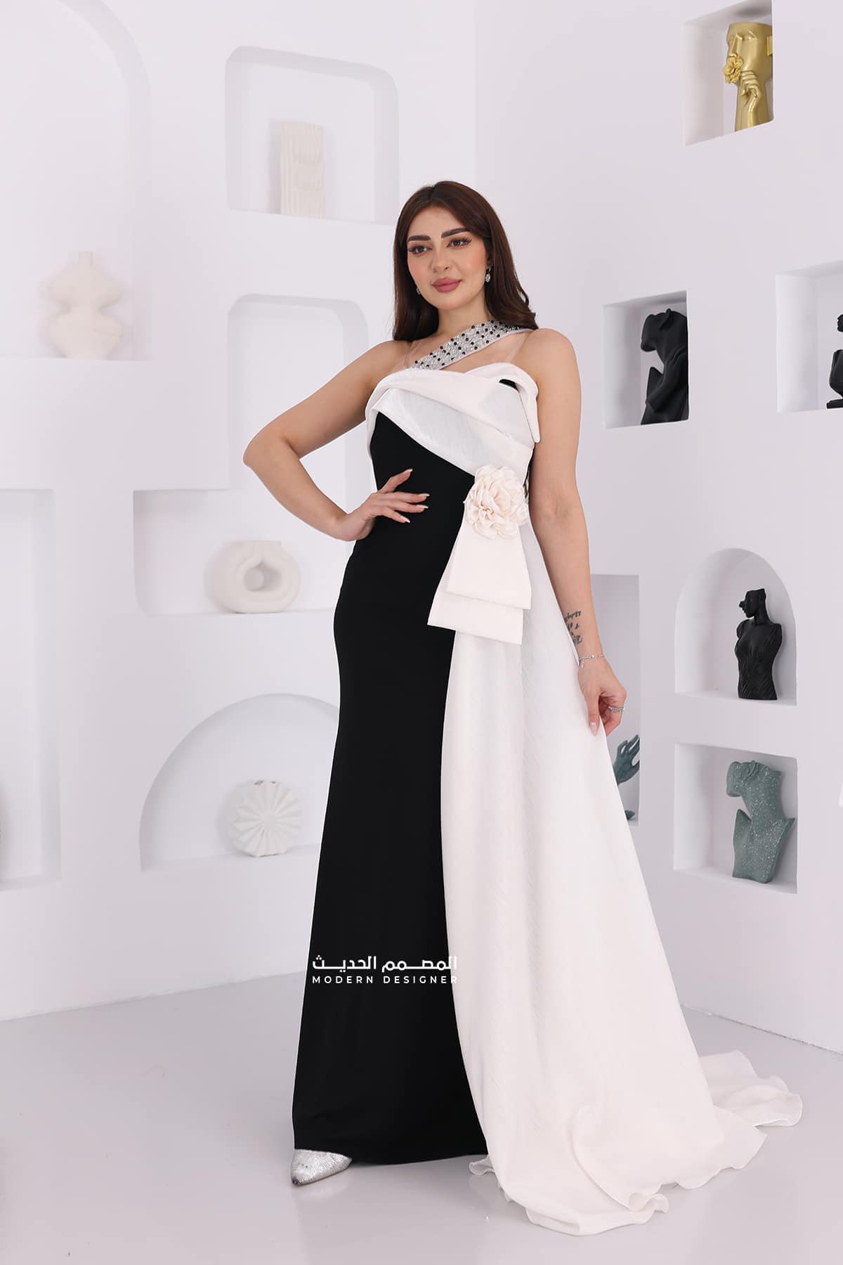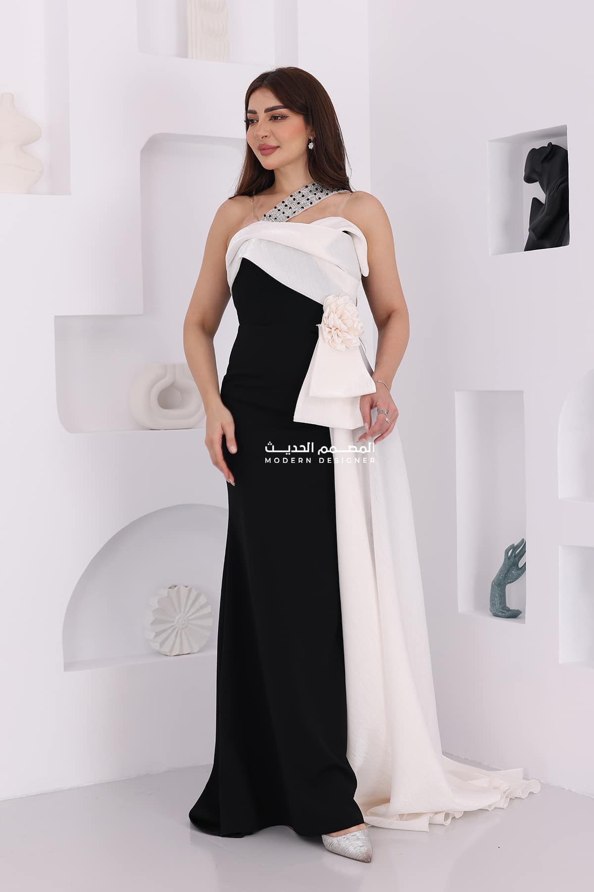 فستان سهرة مكس فخم بتطريز راقي يتميز بتصميم حديث ومبتكر، ويتميز بتطريز راقٍ وأنيق. يتميز بالتداخل الجميل للألوان الأبيض والأسود، مما يضفي على الفستان جاذبية وجمالًا فريدًا. يتضمن الفستان أيضًا شال جانبي أنيق يكمل المظهر العام للفستان.