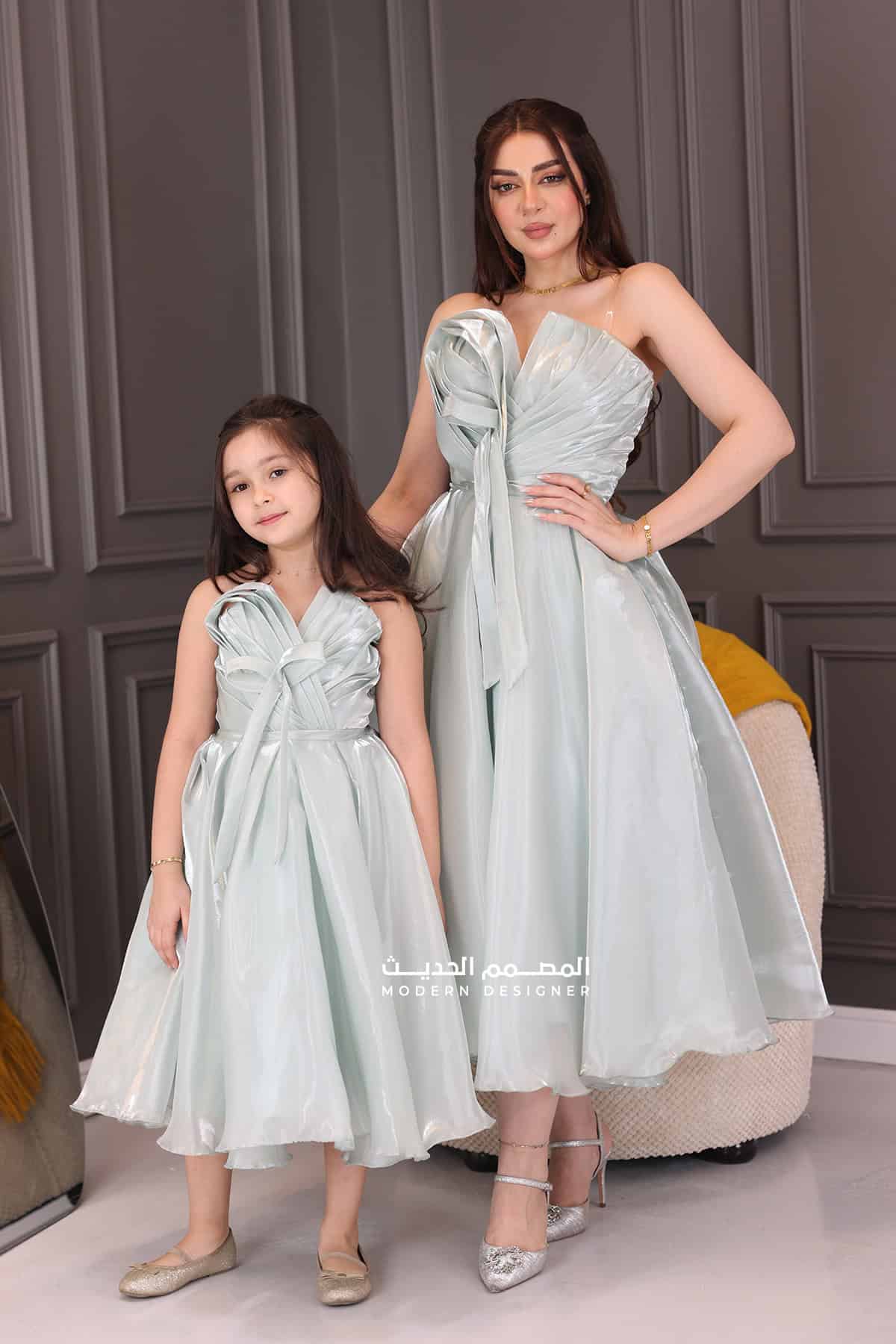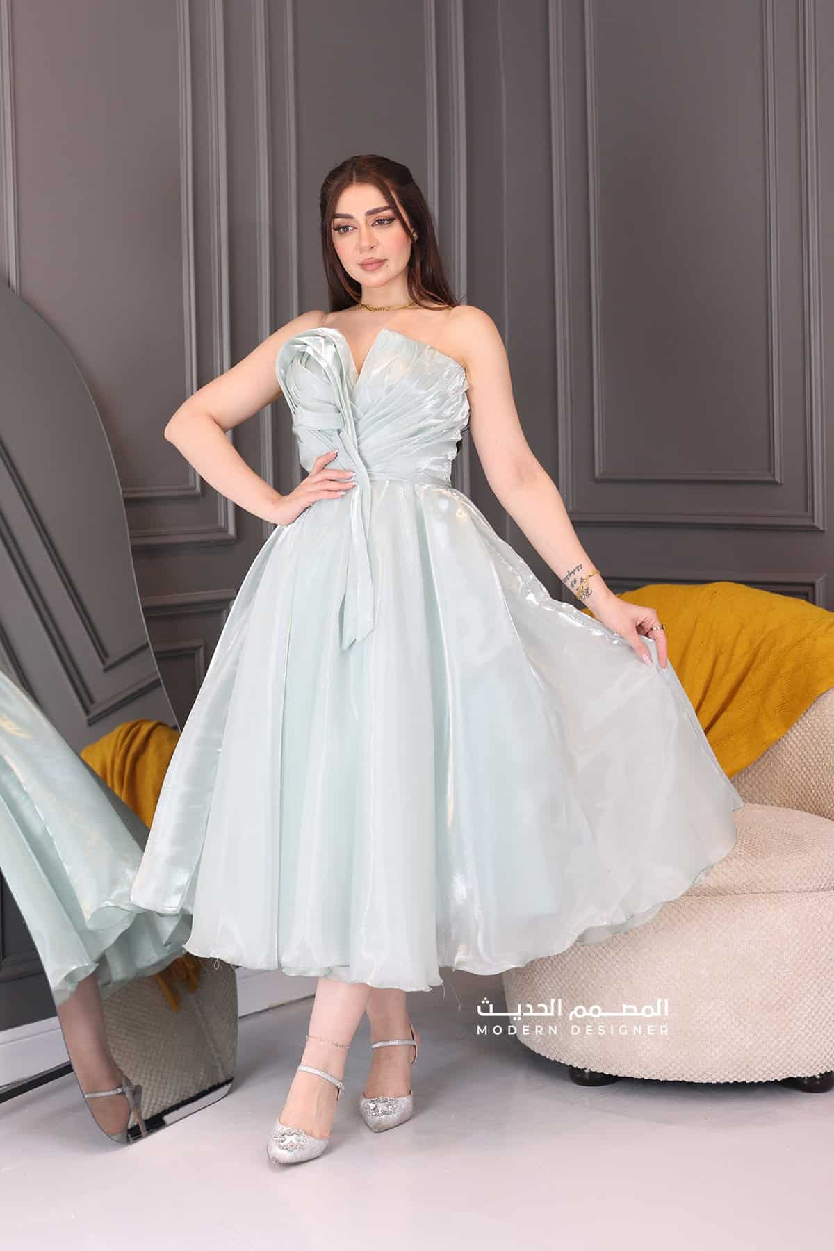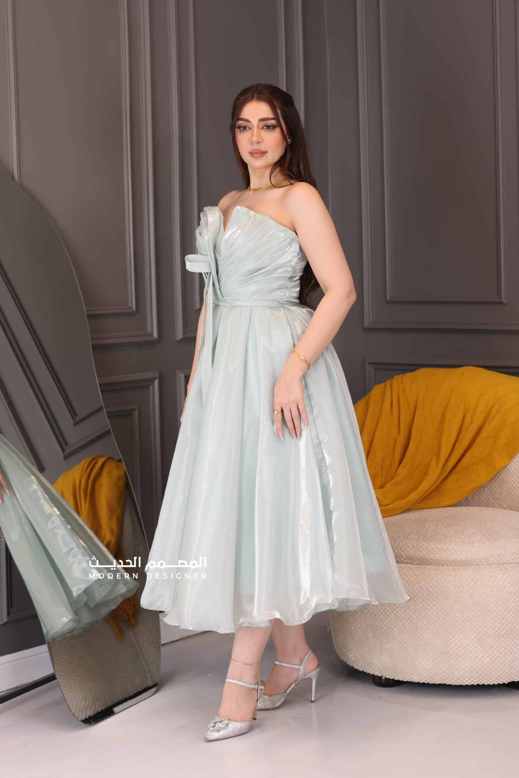 فستان سهرة ميدي فخم بكسرات أنيقة بفونكة راقية تتموضع بشكل جميل ومتناغم، مما يضفي لمسة من الأنوثة والجاذبية على الفستان من خامة الجازر المطور المعة، وهي نسيج فاخر وعالي الجودة يمنح الفستان مظهرًا متألقًا ولمعة جميلة. تتميز الجازر بقوامها الثقيل وقوة التحمل، مما يجعل الفستان يتماشى تمامًا مع تصميمه الراقي.