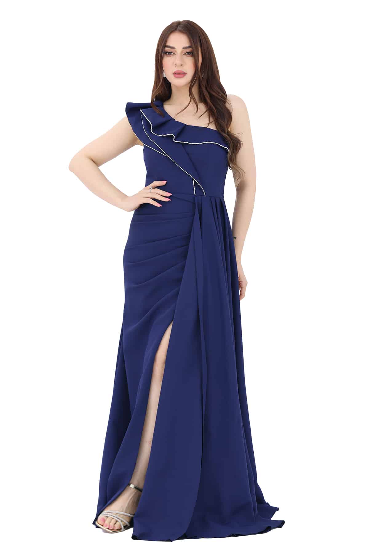 فستان السهرة الكحلي الناعم طويل بفتحة أنيقة في الأسفل وتصميم الكتف الواحد والطبقة المحبوكة على الصدر يجمع بين الأناقة والجاذبية. إنه فستان يبرز جمالك ويعكس ذوقك وأناقتك بطريقة رائعة ومميزة.