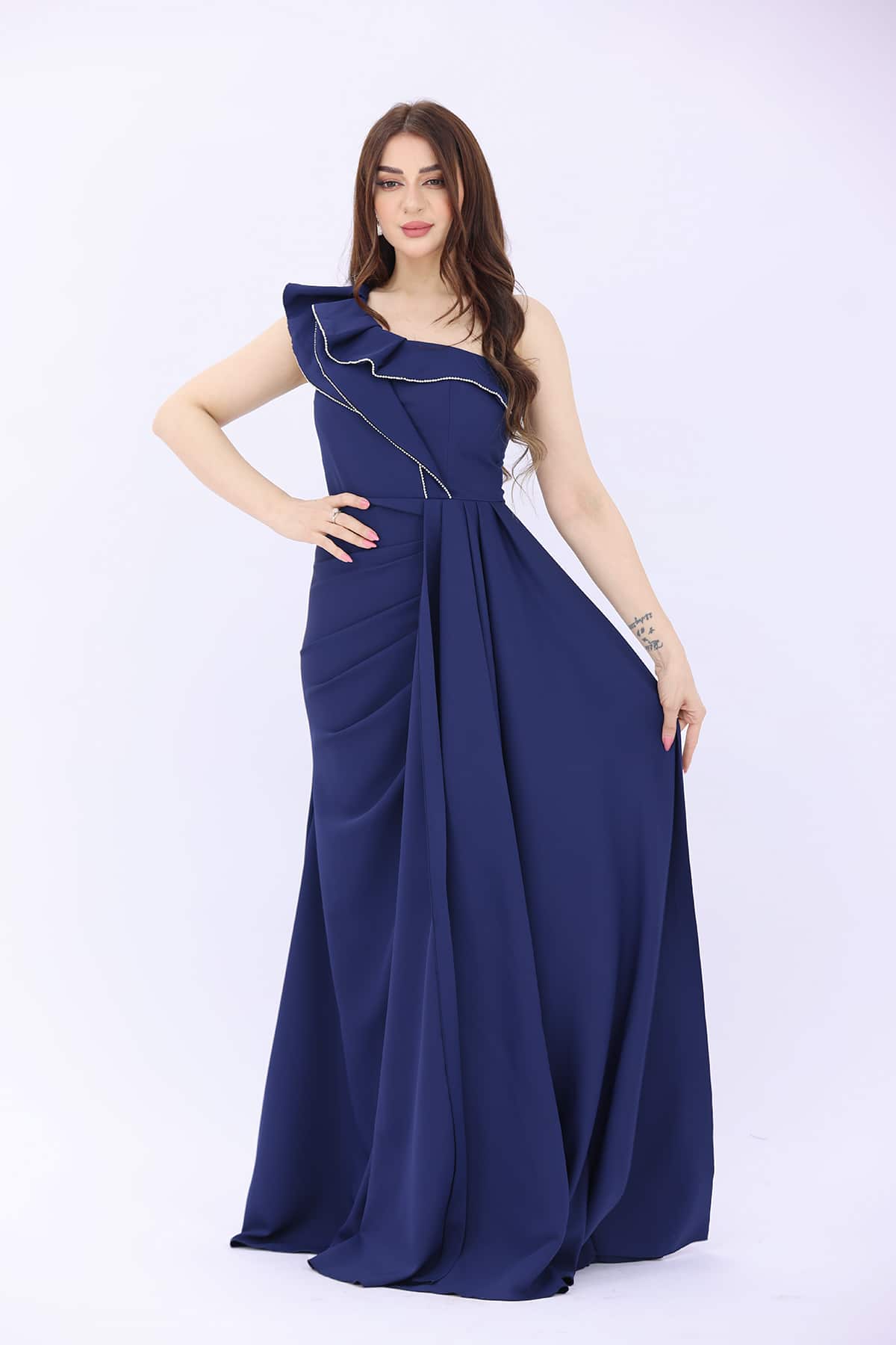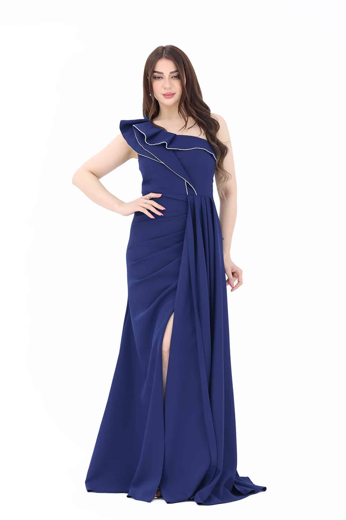 فستان سهرة كحلي ناعم طويل بفتحة انيقة في الأسفل يتميز هذا الفستان بقصة طويلة في الجنب وبكتف واحد وبطبقة أنيقة على الصدر محبوكة الأطراف مما تبدو من جمال التصميم ليناسب ذوقك واناقتك .